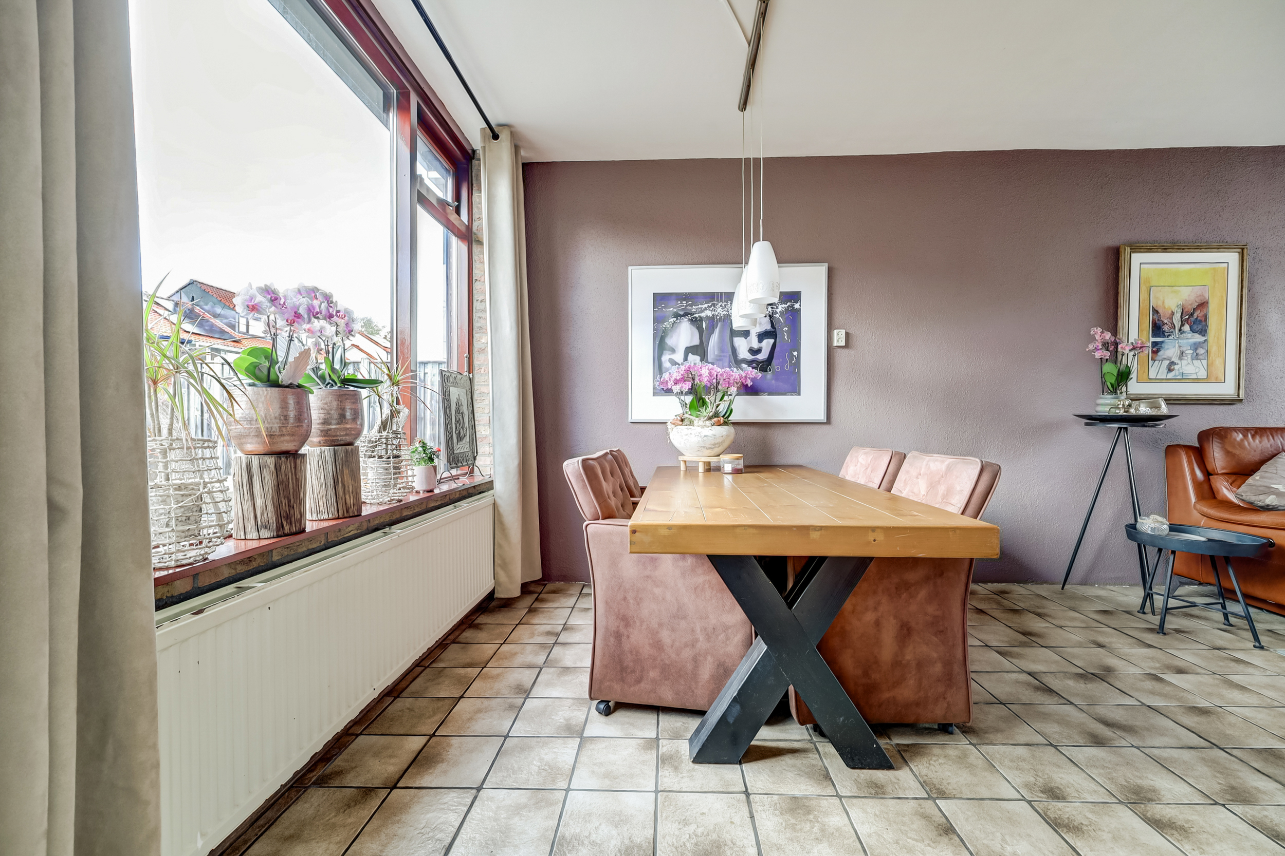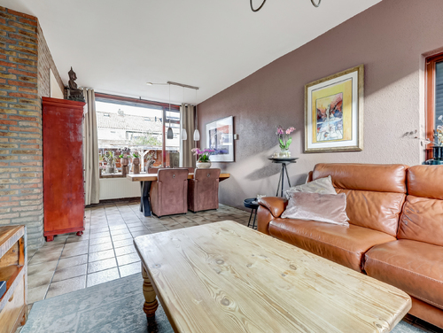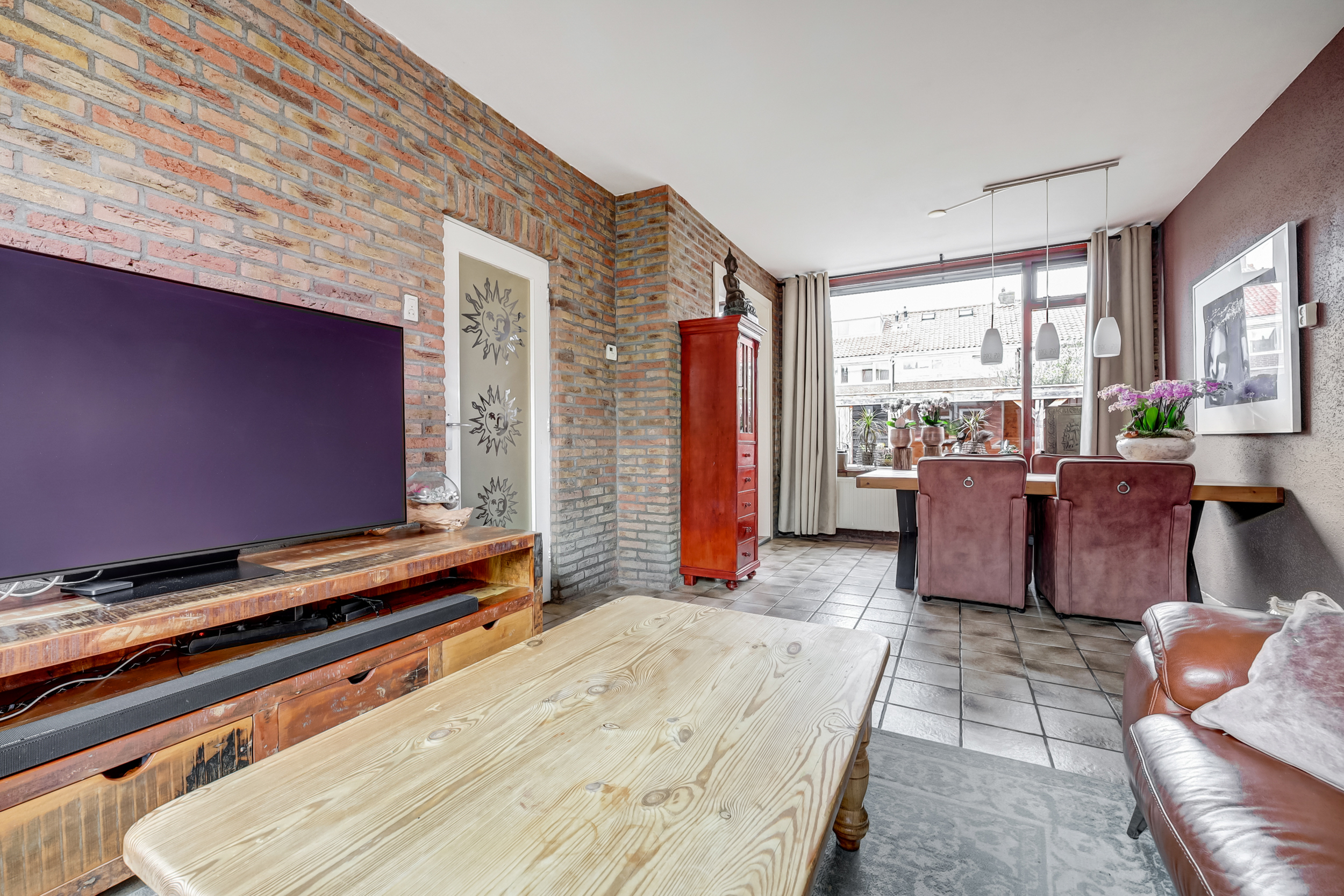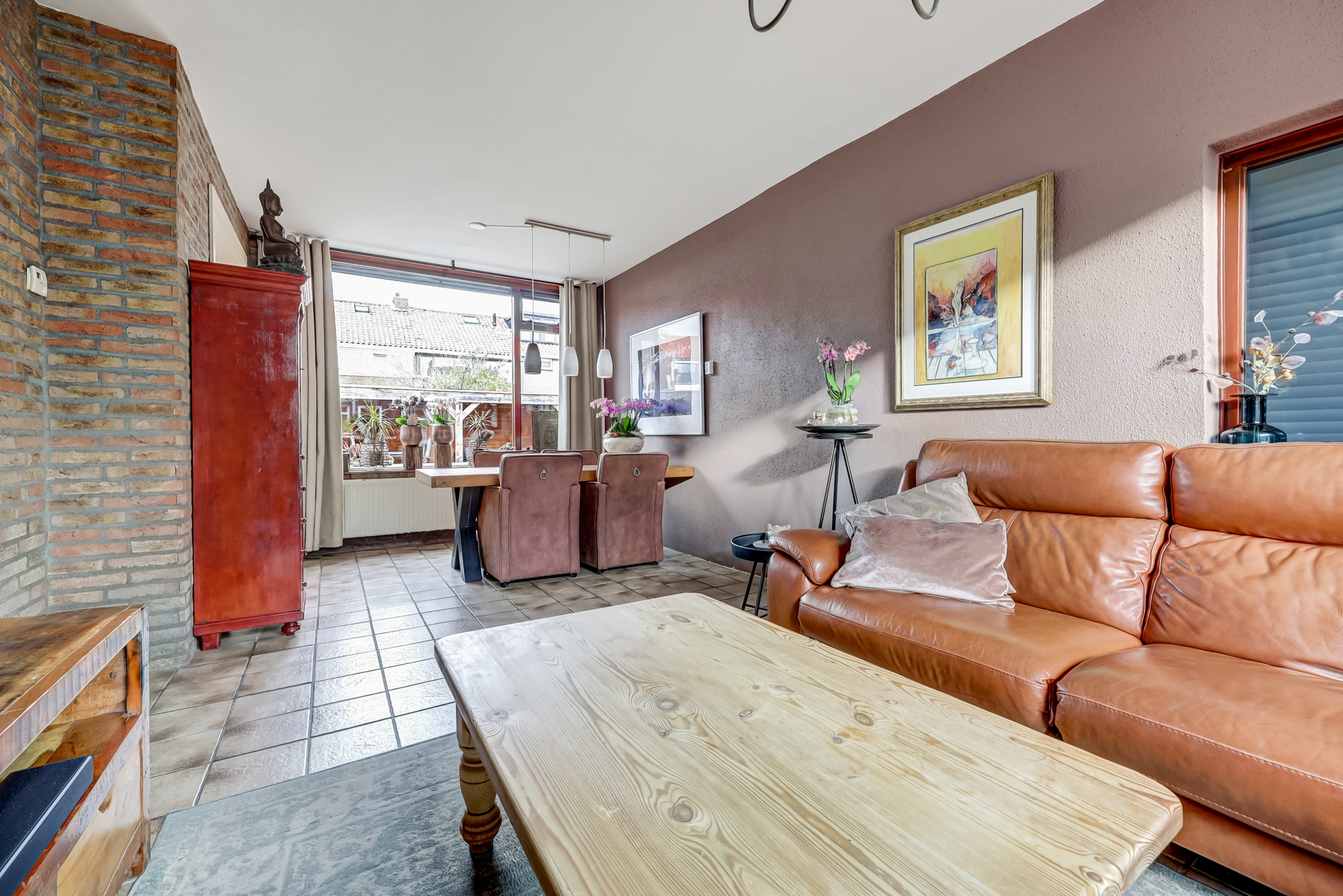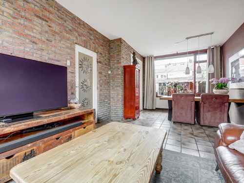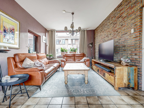 De sfeervolle doorzonwoonkamer (ca. 25 m²) is voorzien van een plavuizenvloer, een gunstige lichtinval en wanden afgewerkt met steenstrips en spuitwerk. De grote ramen geven je een fraai zicht op zowel de voor- als achtertuin.