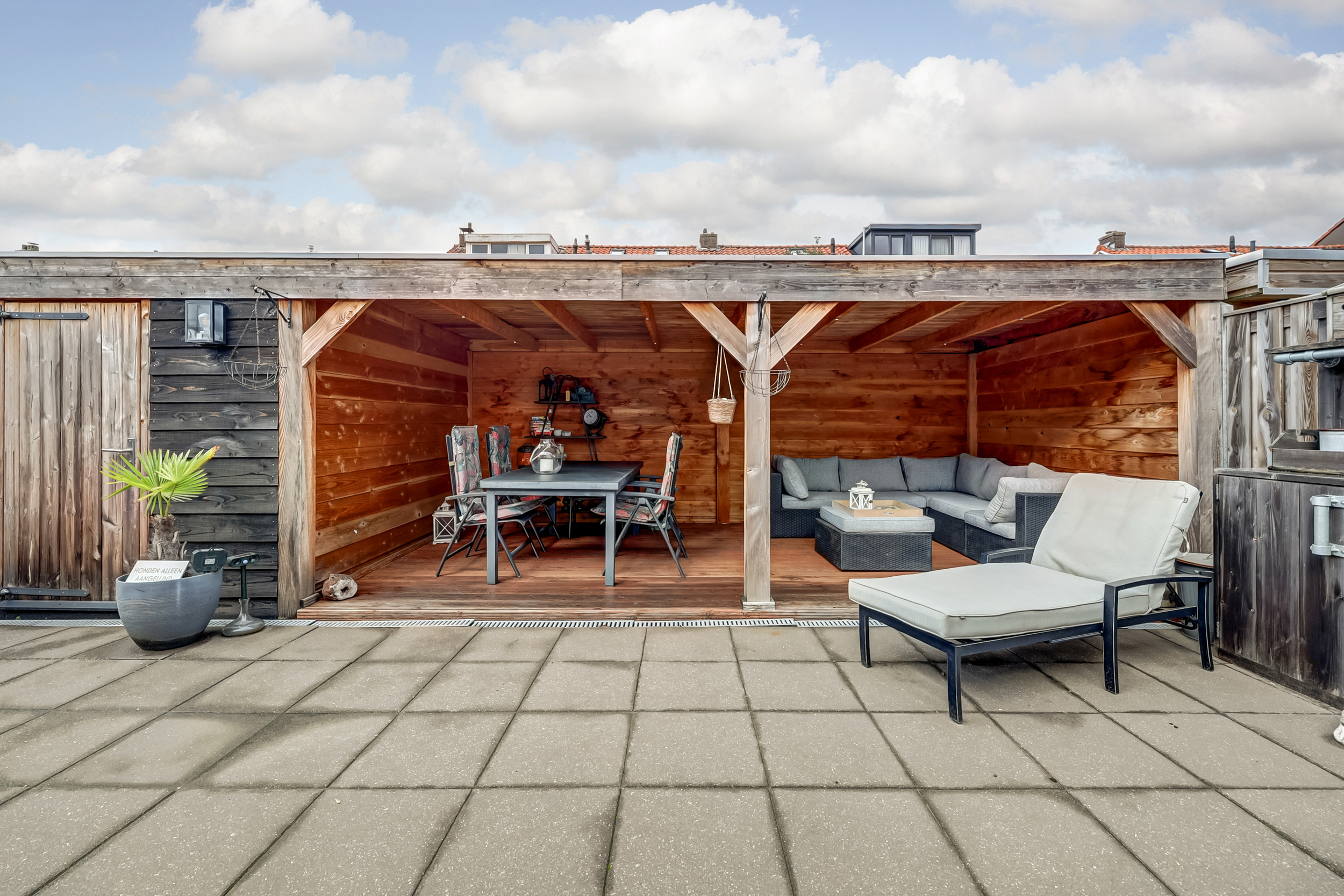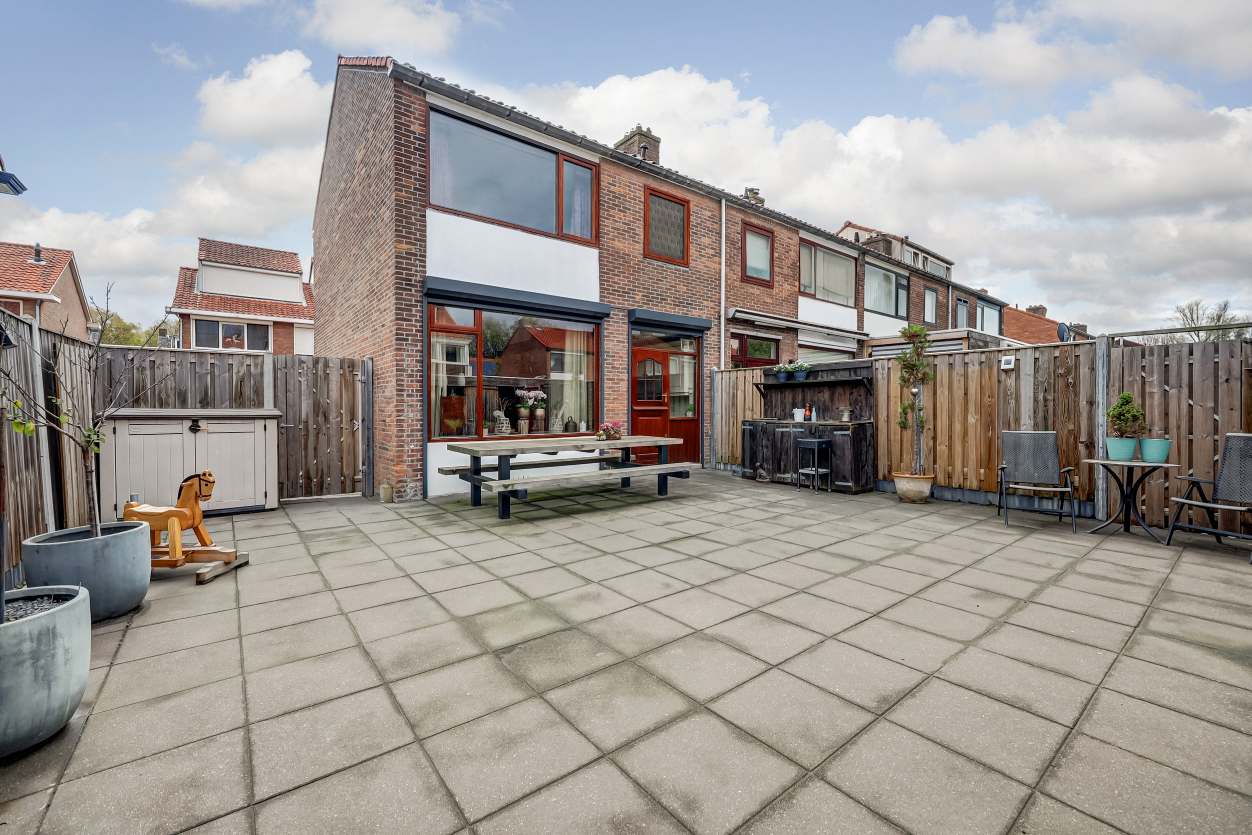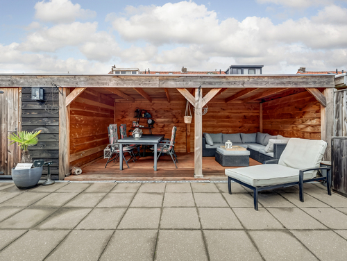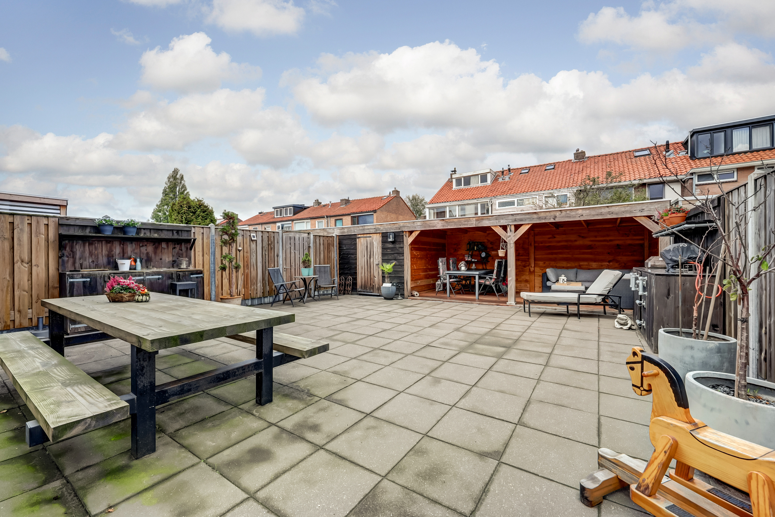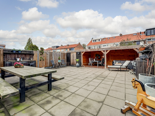De royale tuin is geheel omheind en uitgerust met betegeling, een buitenkraan, zijingang en een heerlijke overkapping (ca. 16 m²) met elektra en verlichting waar je tot in de late uurtjes gezellig met vrienden van je BBQ kunt genieten. Tevens tref je in de achtertuin een vrijstaande houten berging en kan je aan de zijkant van de woning op eigen terrein je auto(s) parkeren.