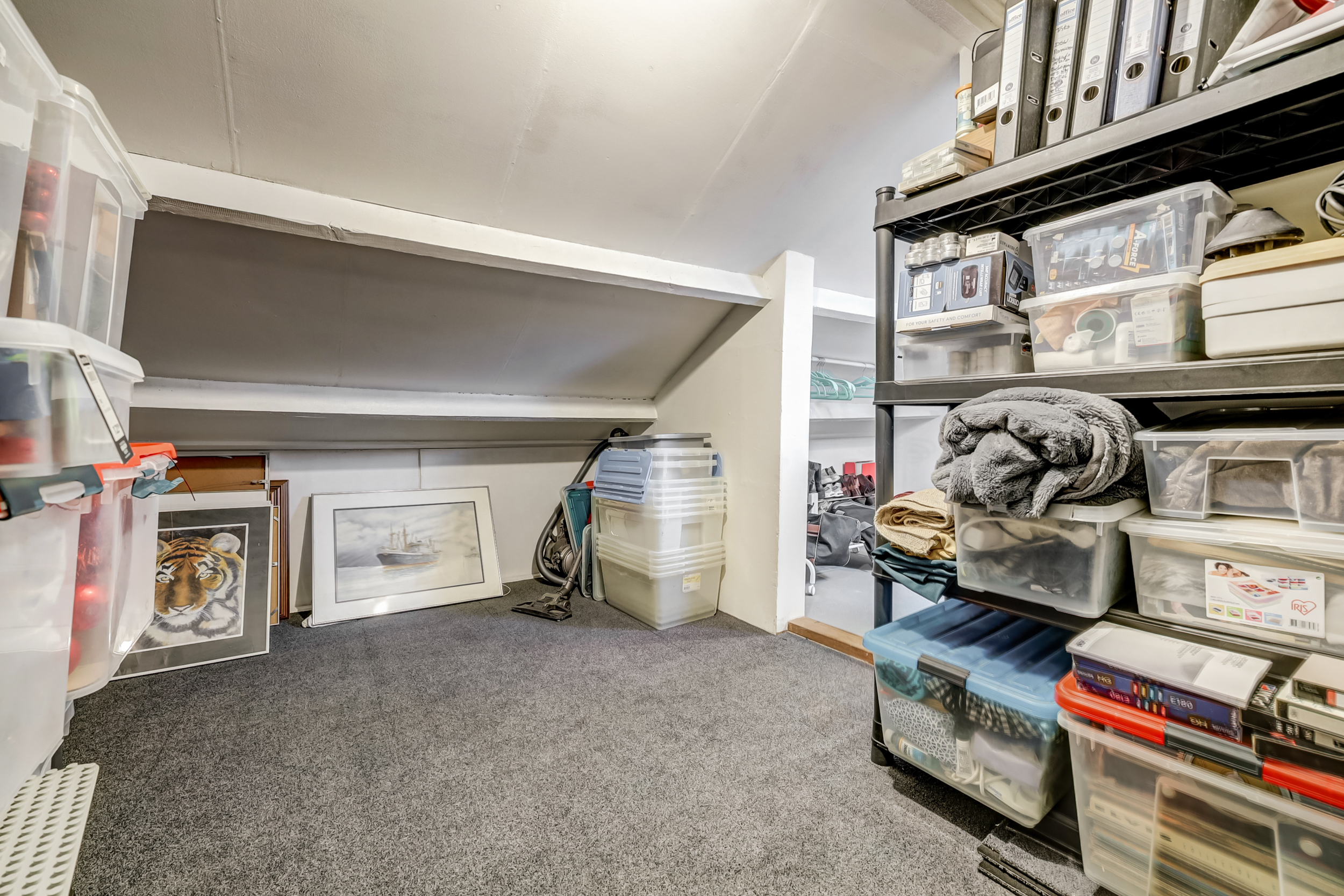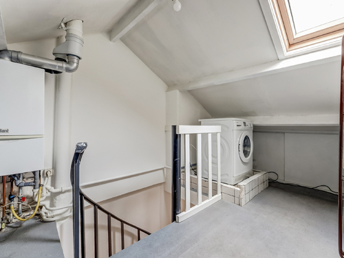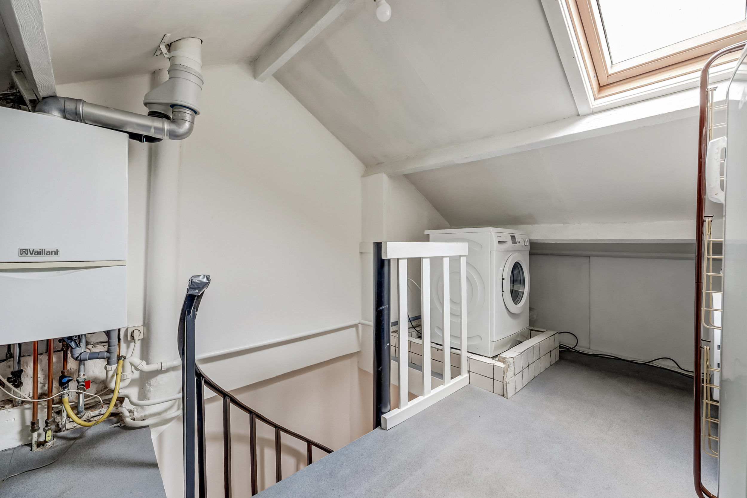 Hier tref je een "Velux" dakraam en de opstelling van de wasmachine, droger en cv combiketel (Vaillant, bouwjaar 2008). Doorlopend bevindt zich de open zolder met volop opberggelegenheid.