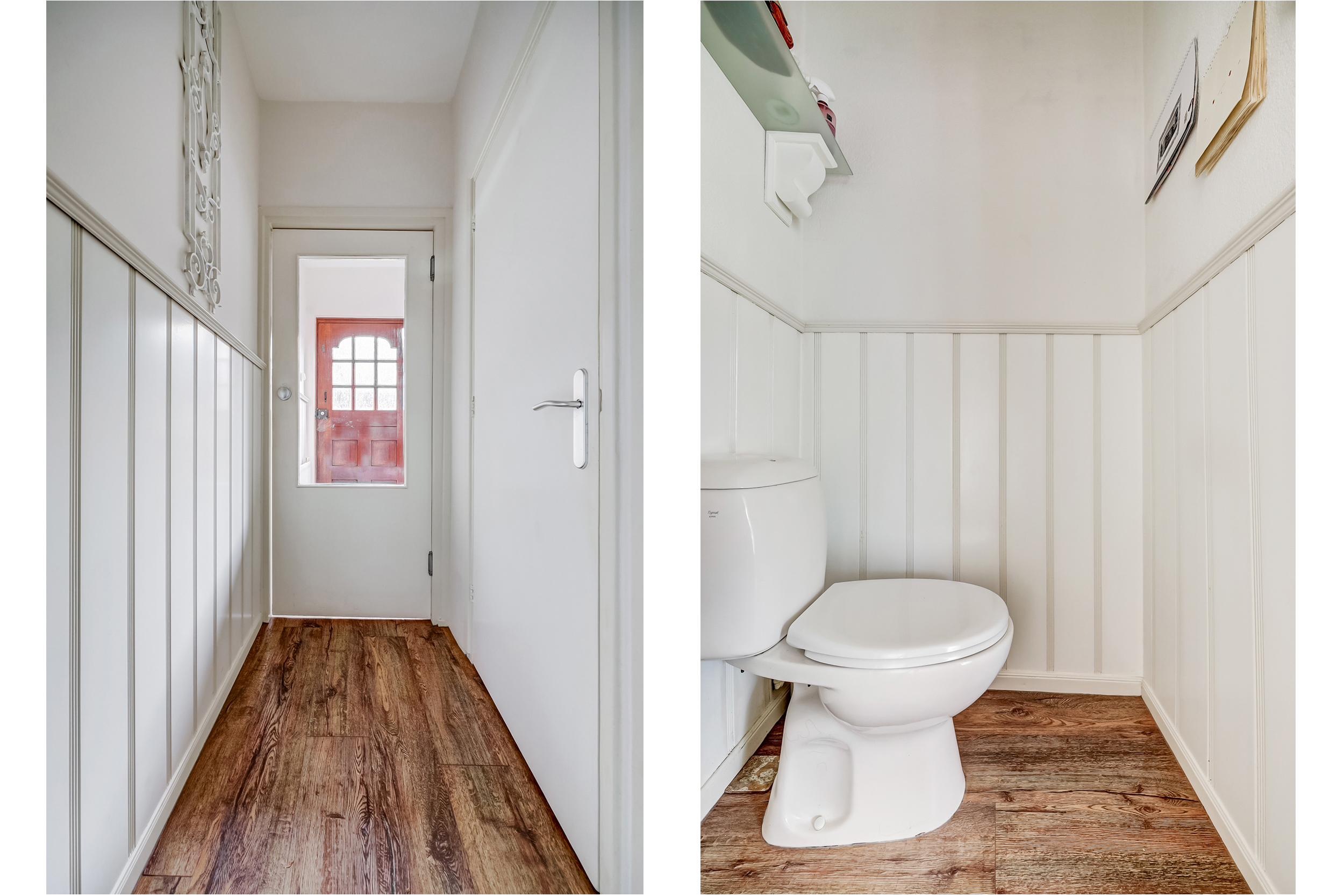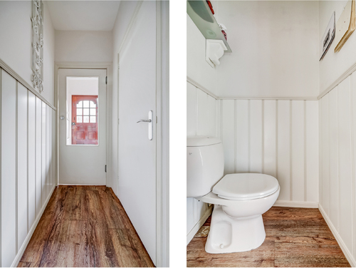 Hal/entree met meterkast (5 groepen met aardlekschakelaar), pvc vloer, wandlambrizering, een handige voorraadkast, trapopgang, toilet en de toegang tot de gezellige woonkamer.