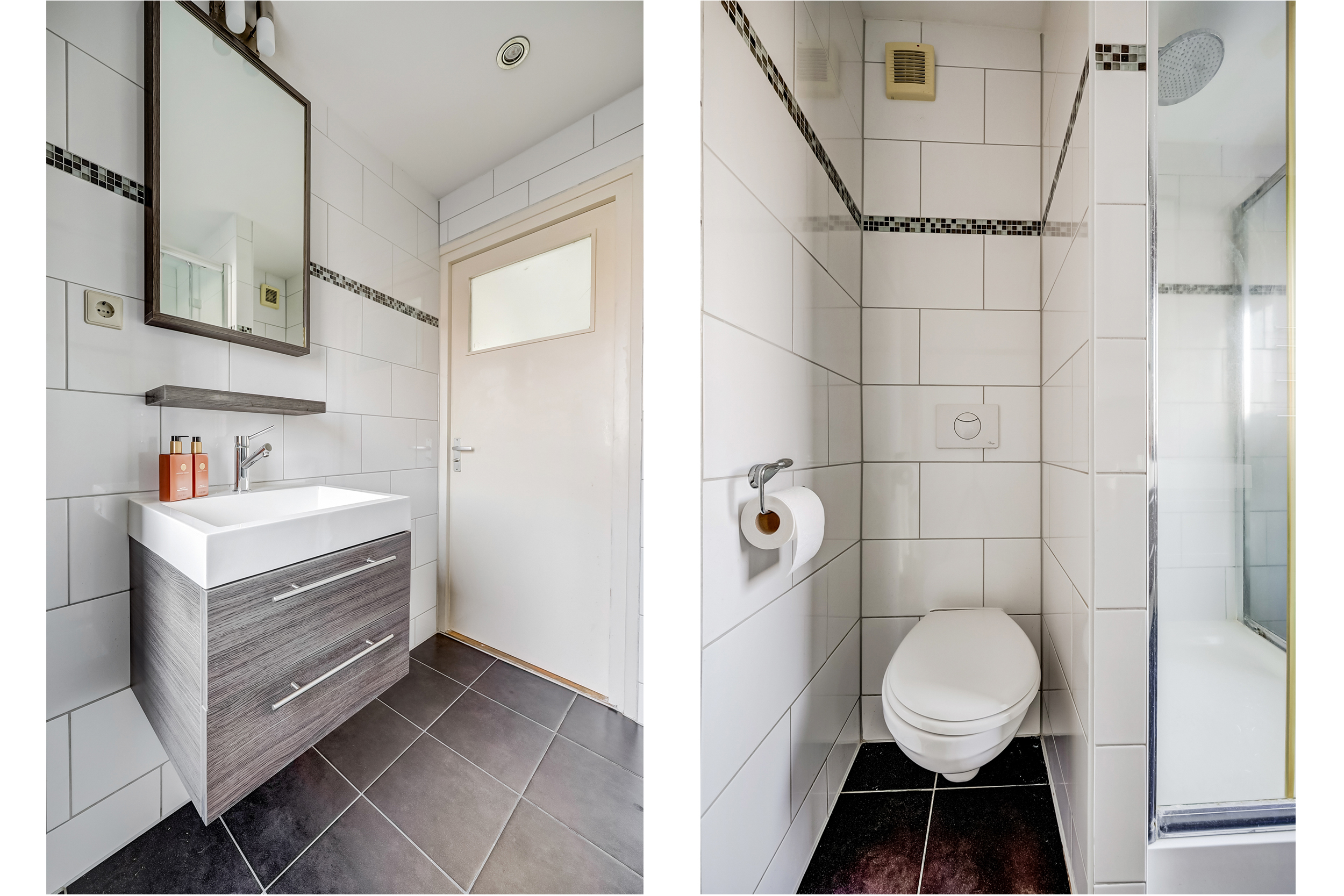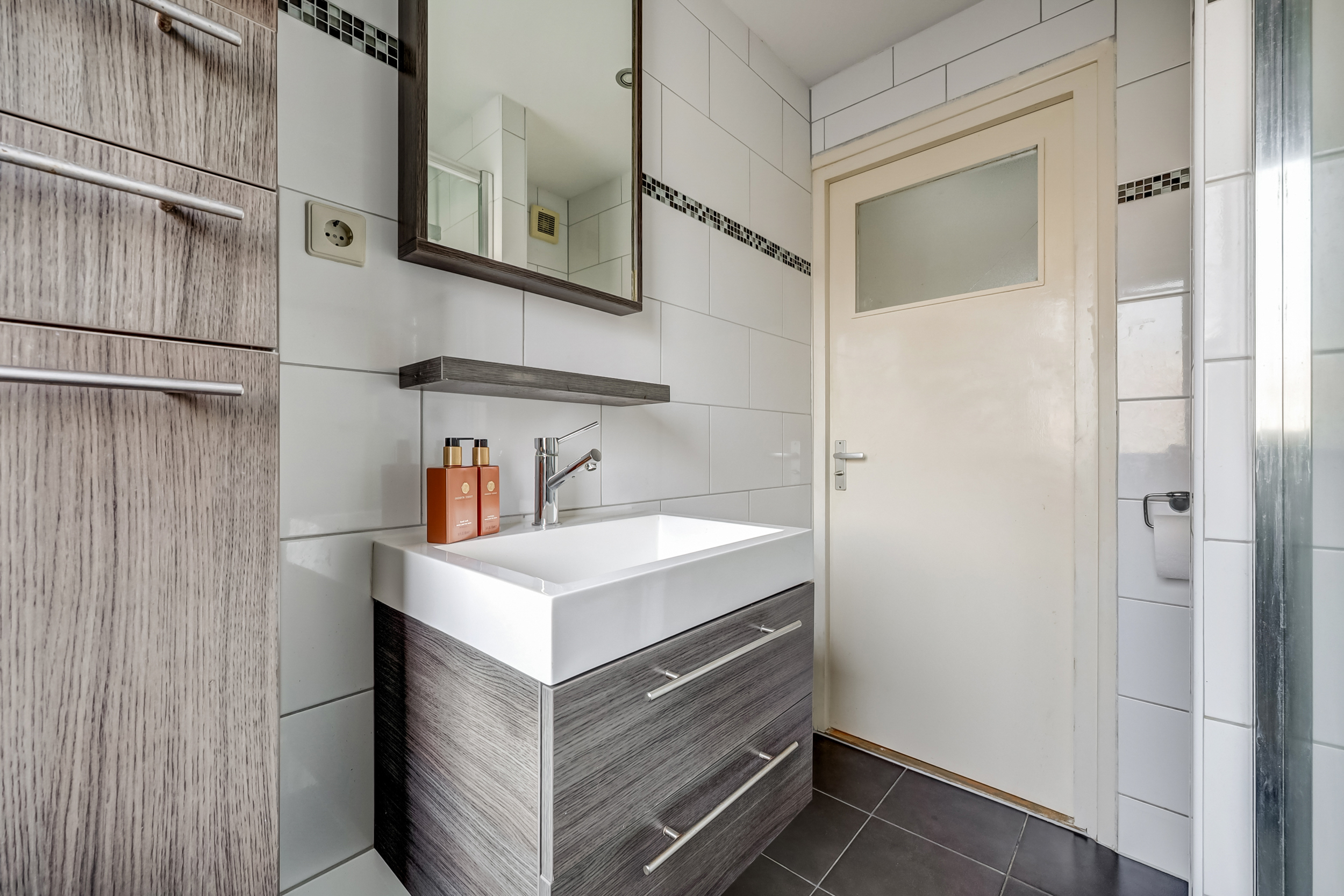 De geheel betegelde badkamer (ca. 4 m²) is voorzien van een wastafel met meubel, douchecabine en een 2e toilet met zwevend closet.