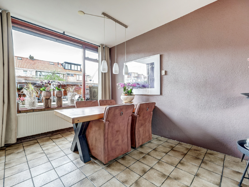 De open keuken (ca. 4 m²) is gesitueerd aan de achterzijde van de woning en L-vormig uitgevoerd met diverse apparatuur zoals een koelkast, vriezer, vaatwasser, combimagnetron, inductiekookplaat en een vlakscherm afzuigkap. Hier tref je ook de achterdeur die toegang geeft tot de royale achtertuin.