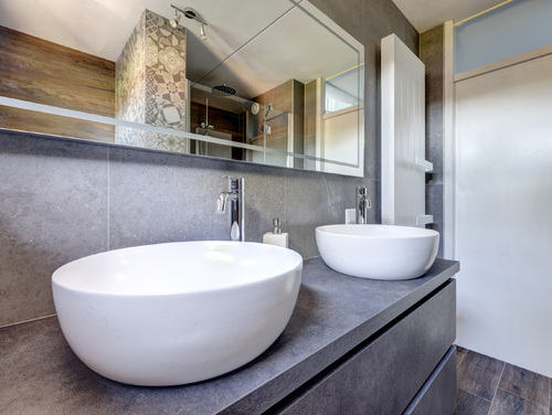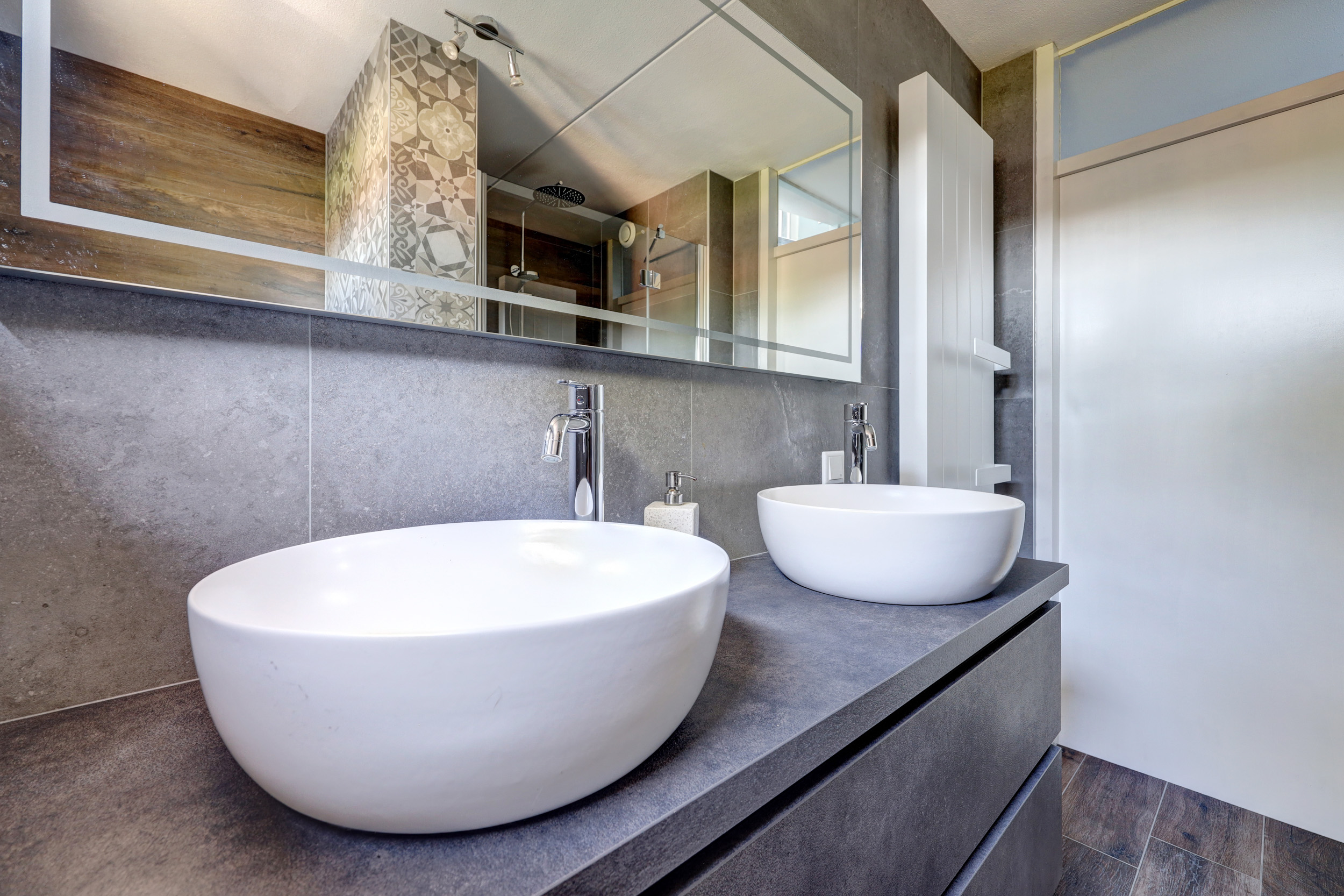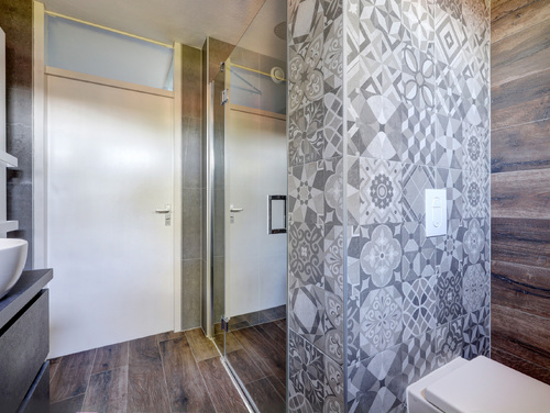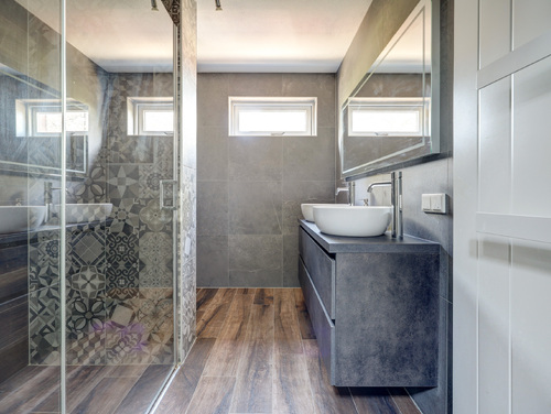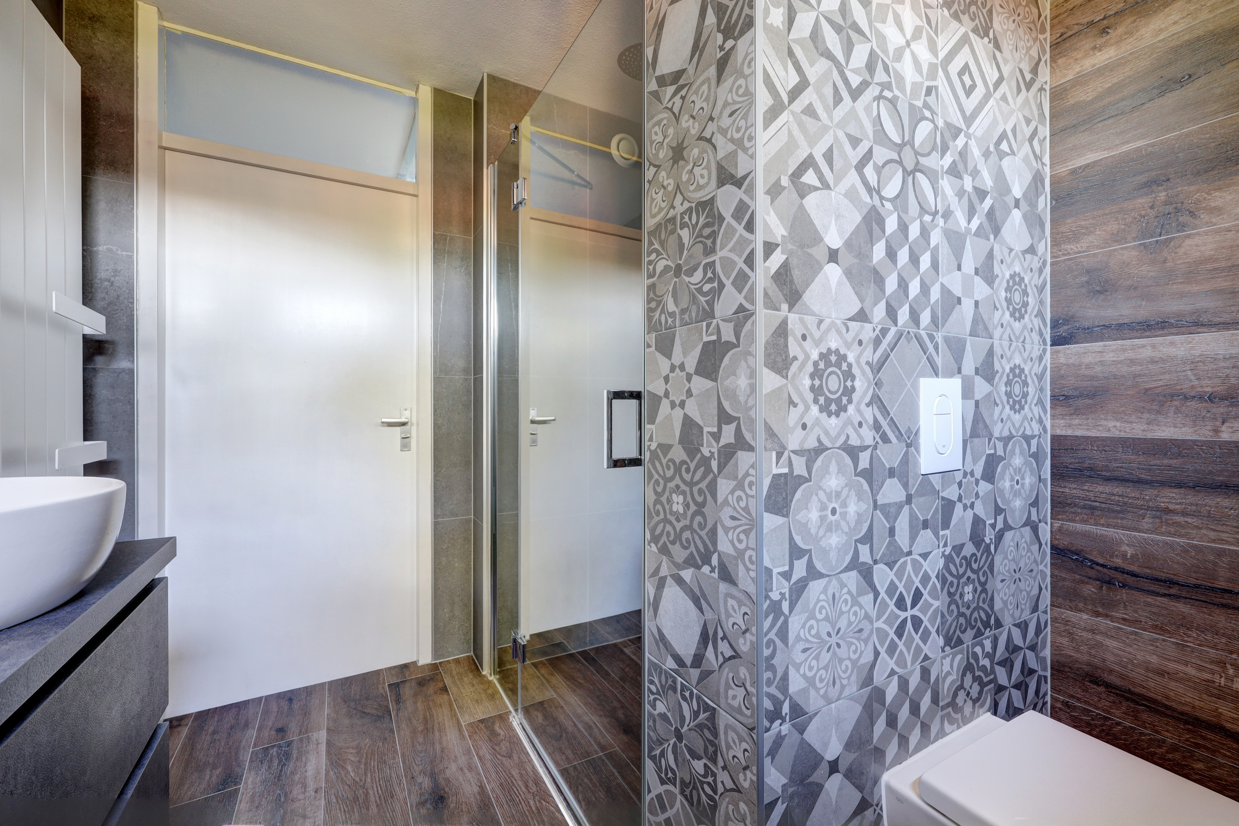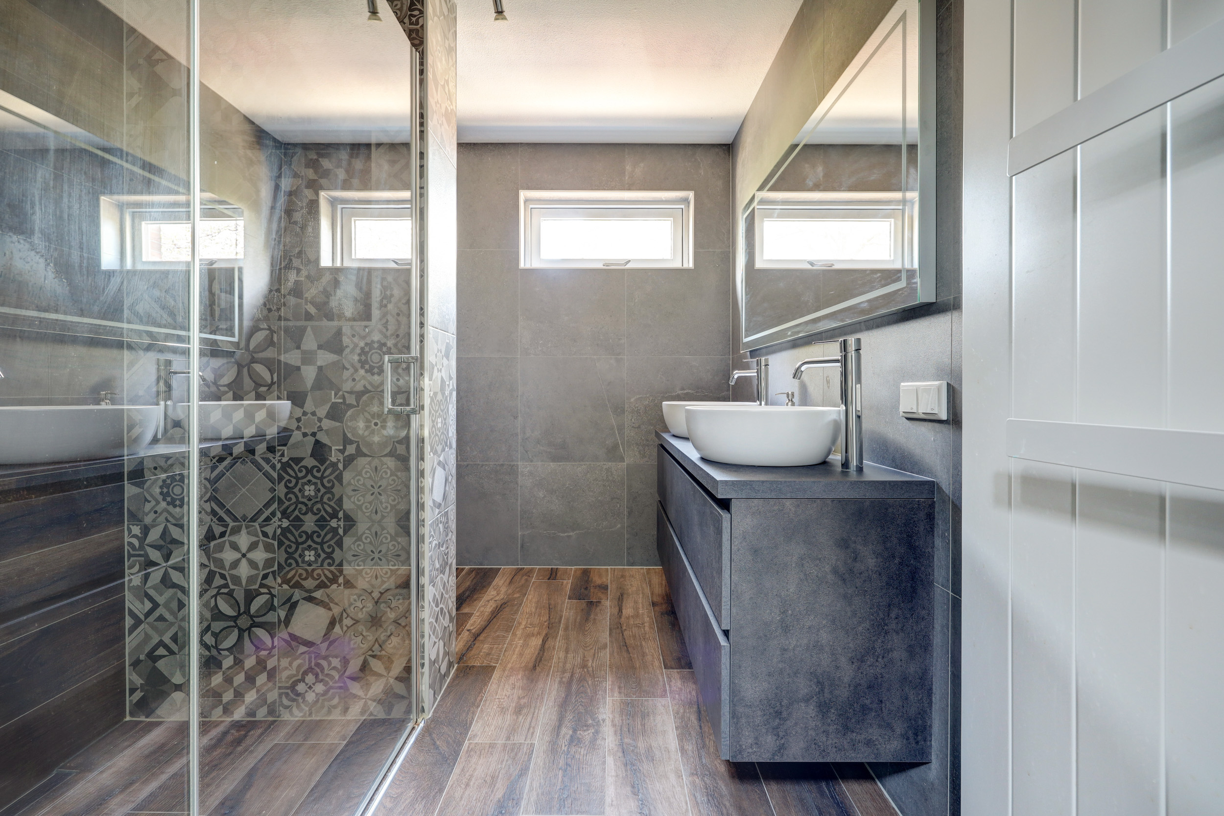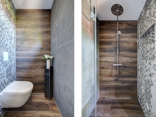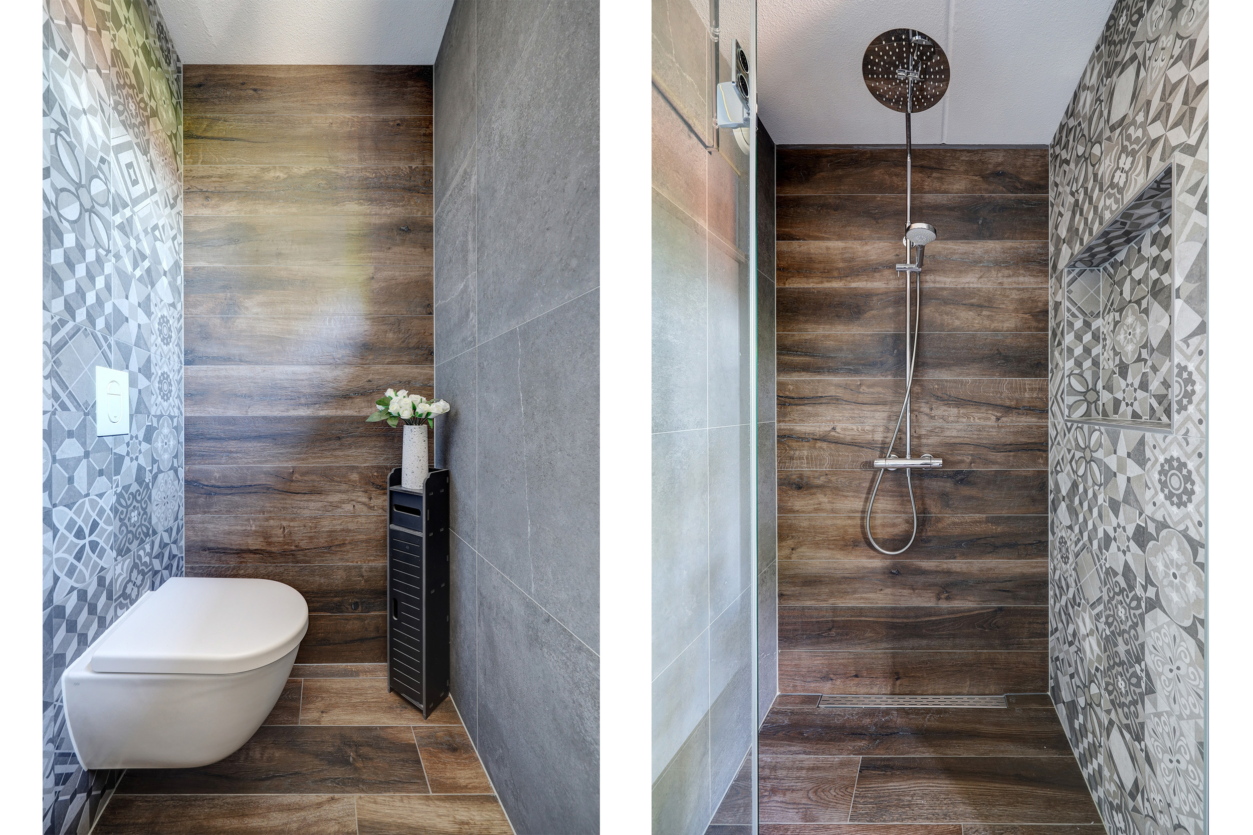 De in 2022 geplaatste moderne badkamer (ca. 6 m²) is geheel betegeld en voorzien van een ruime douchecabine met regendouche, wastafel met meubel, mechanische ventilatie, design radiator, uitzetraam en een 2e toilet met vrijhangend closet.
