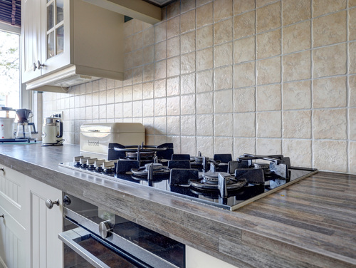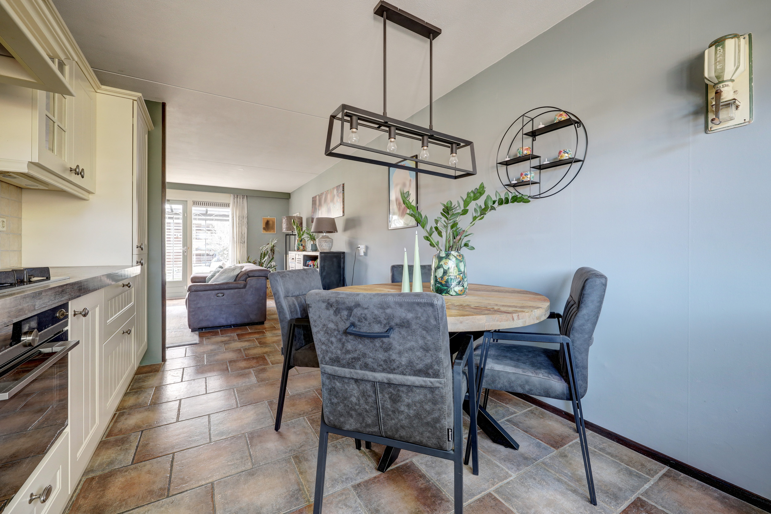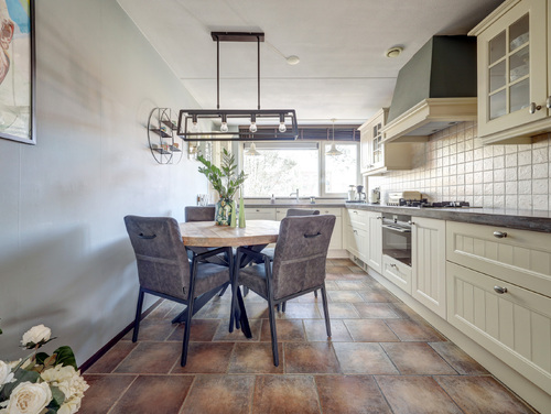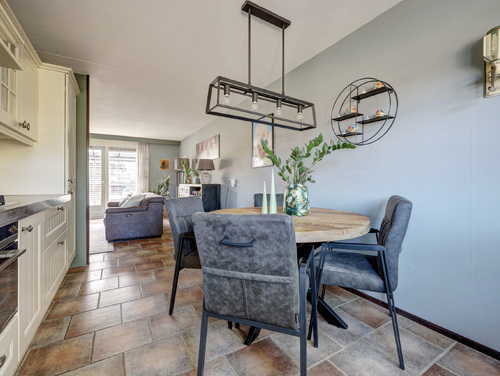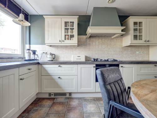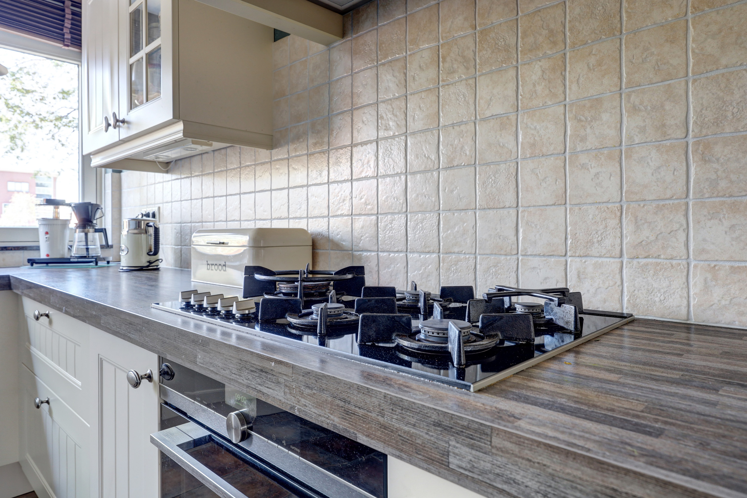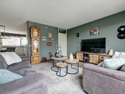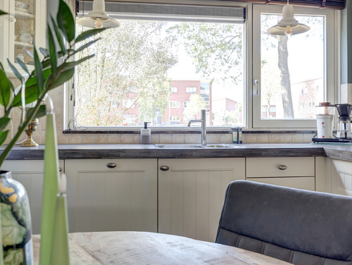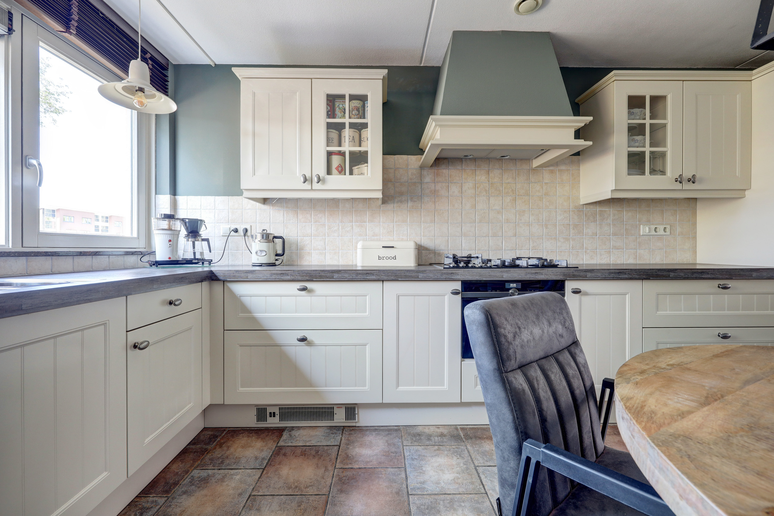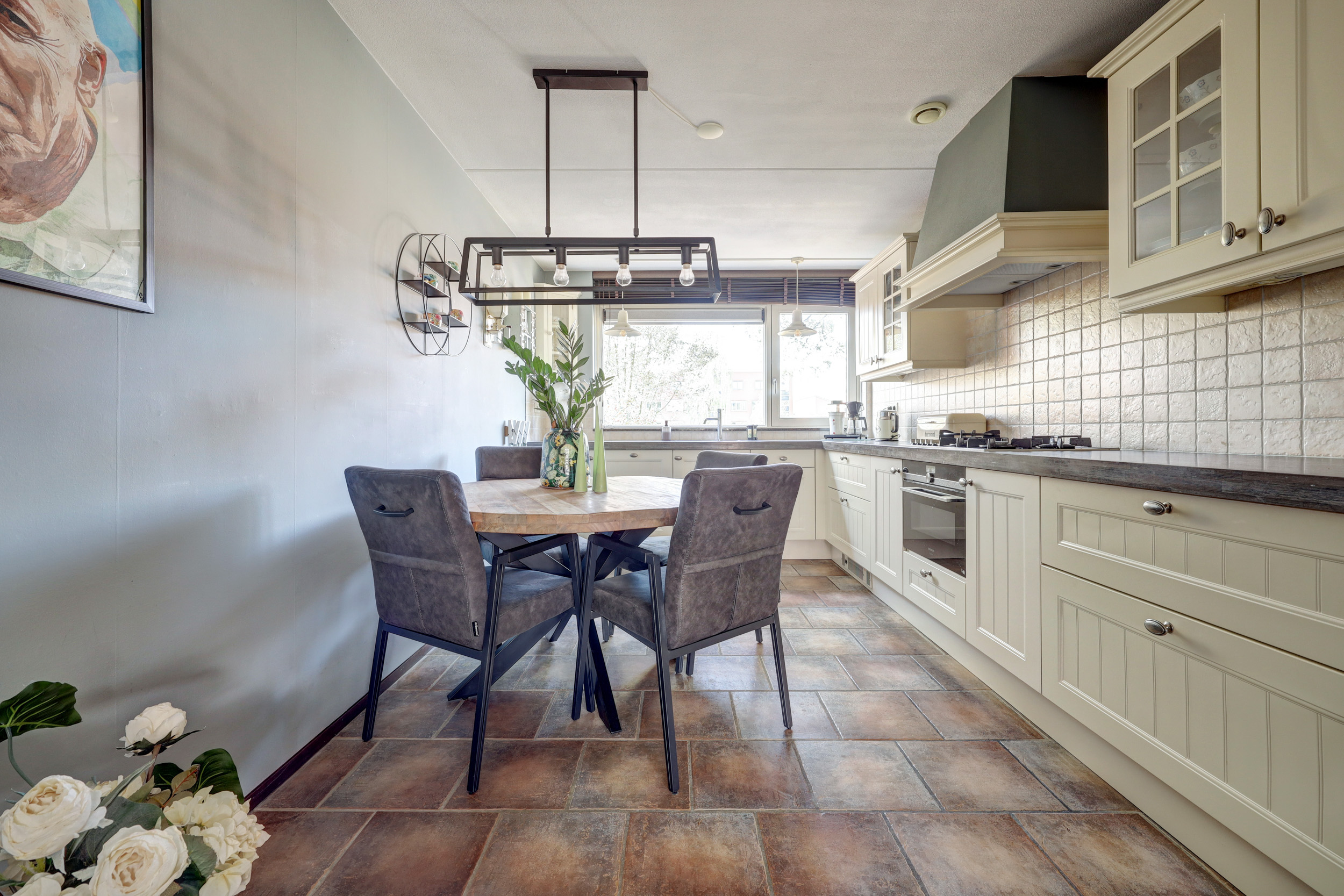 De moderne open keuken (ca. 13 m²) is uitgerust met een L-vormige inrichting en diverse ingebouwde apparatuur zoals een combioven, 5-pits gaskookplaat, afzuigschouw, vaatwasser, vriezer en een koelkast. De vloer en wandafwerking van de woonkamer lopen netjes over in de keuken en vormen een fraai bijpassend geheel.