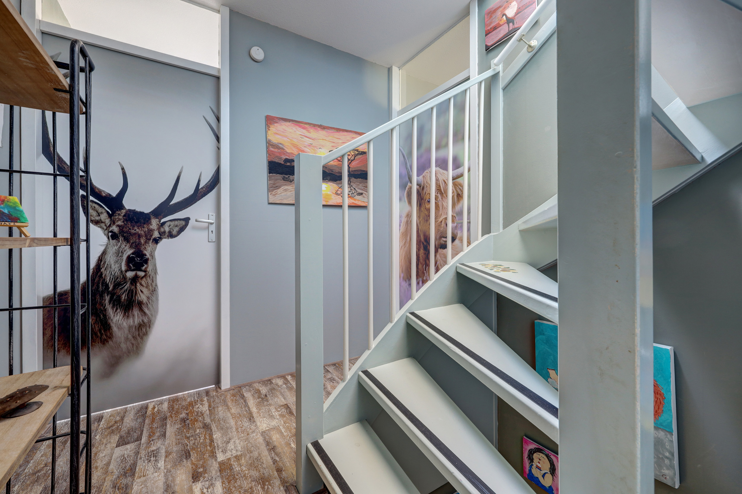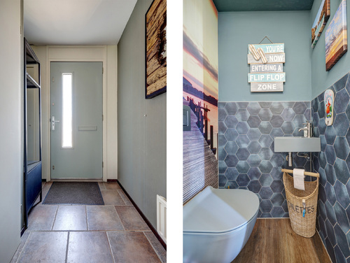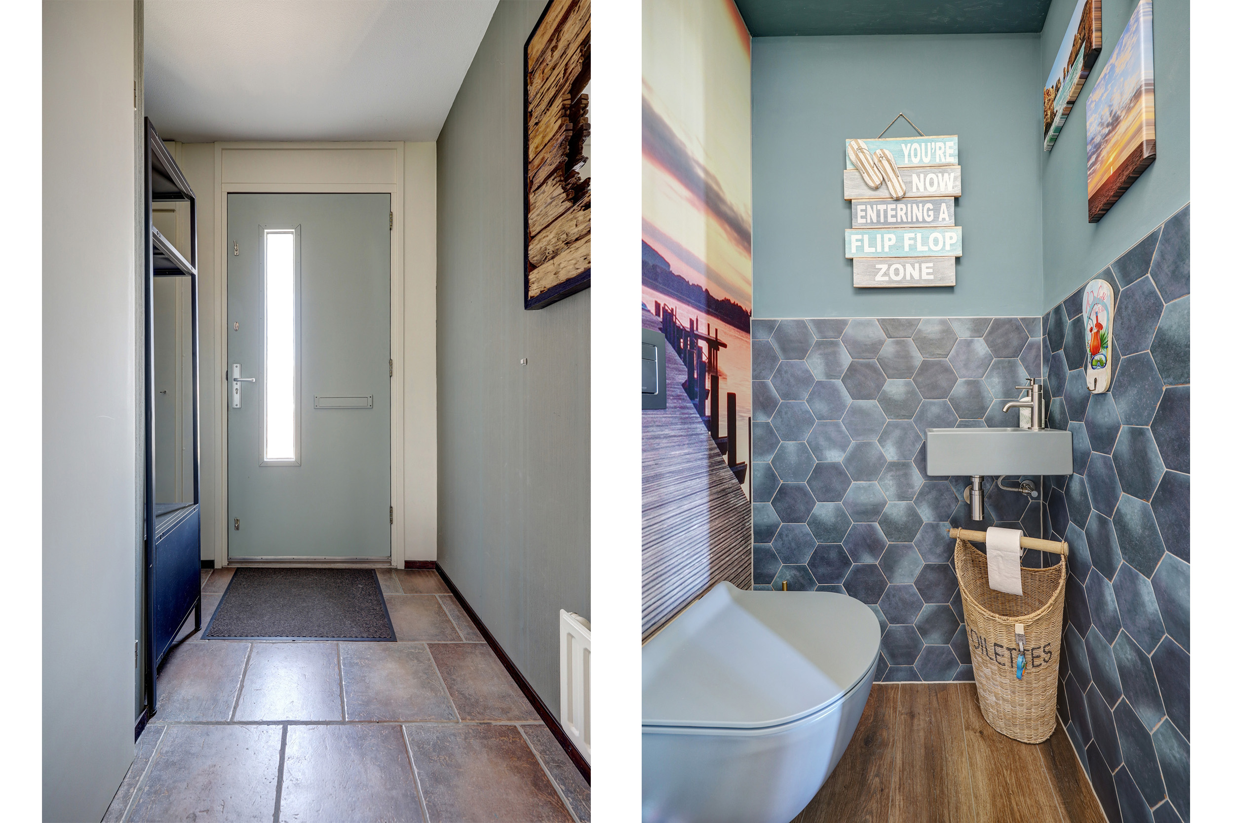 Hal/entree met meterkast (6 groepen met slimme meters), garderoberuimte, een handige voorraadkast, modern toilet met zwevend closet en fonteintje, trapopgang en de toegang tot de sfeervolle woonkamer.