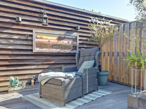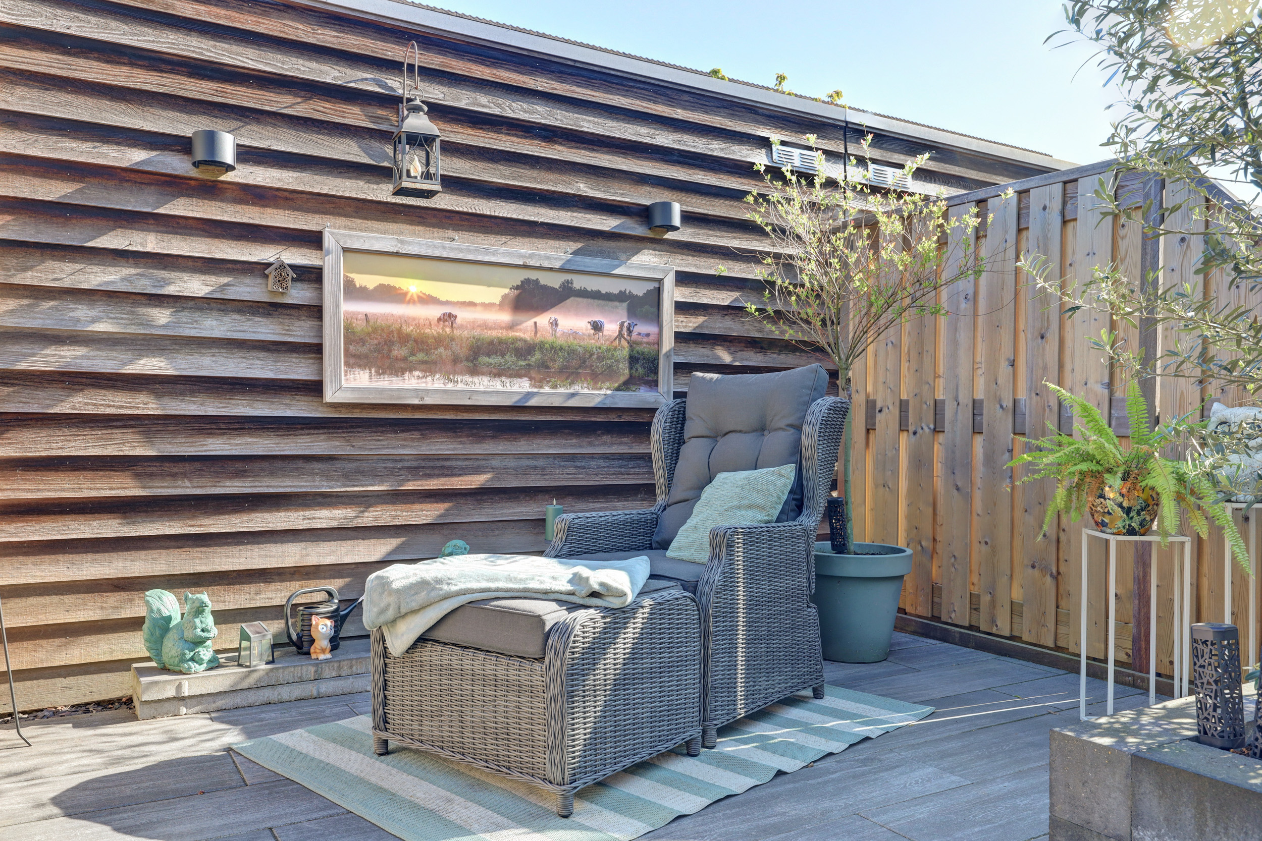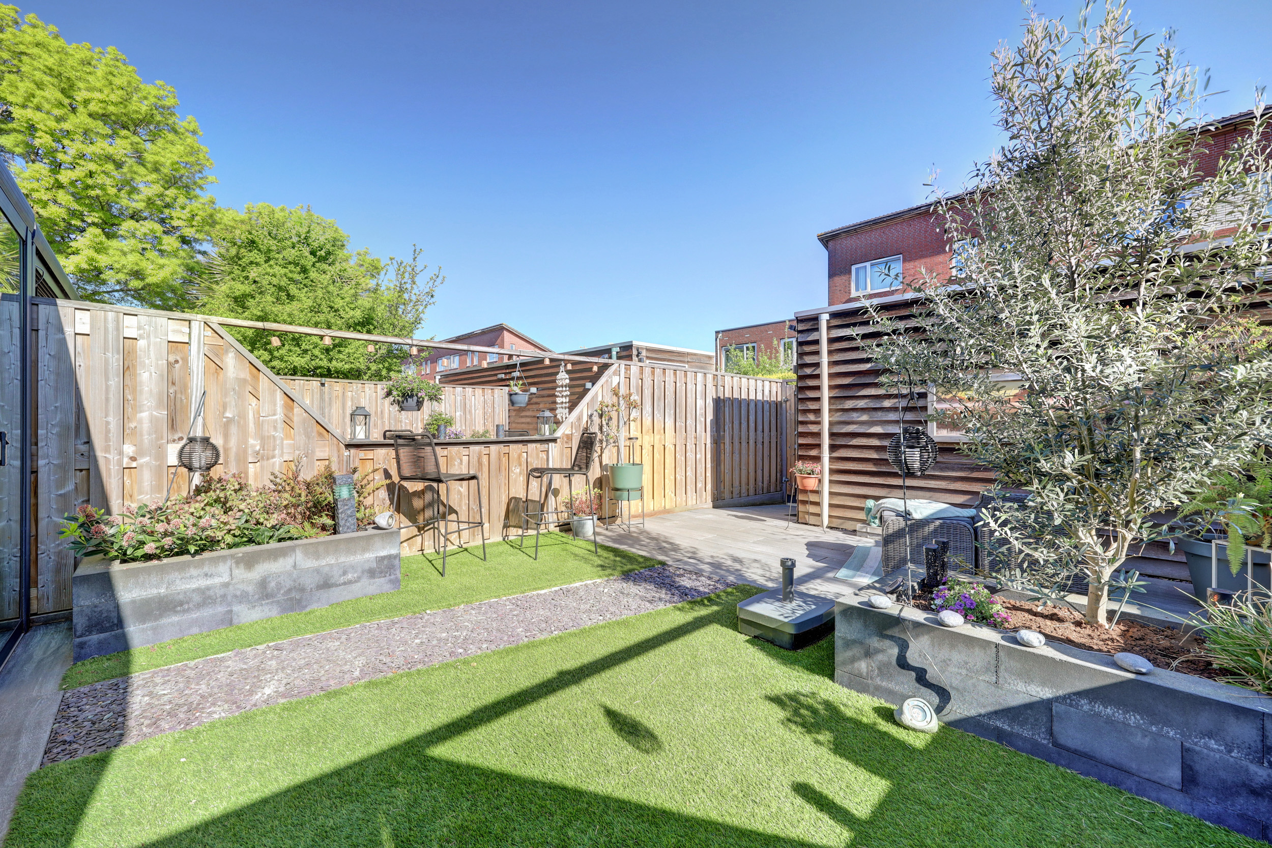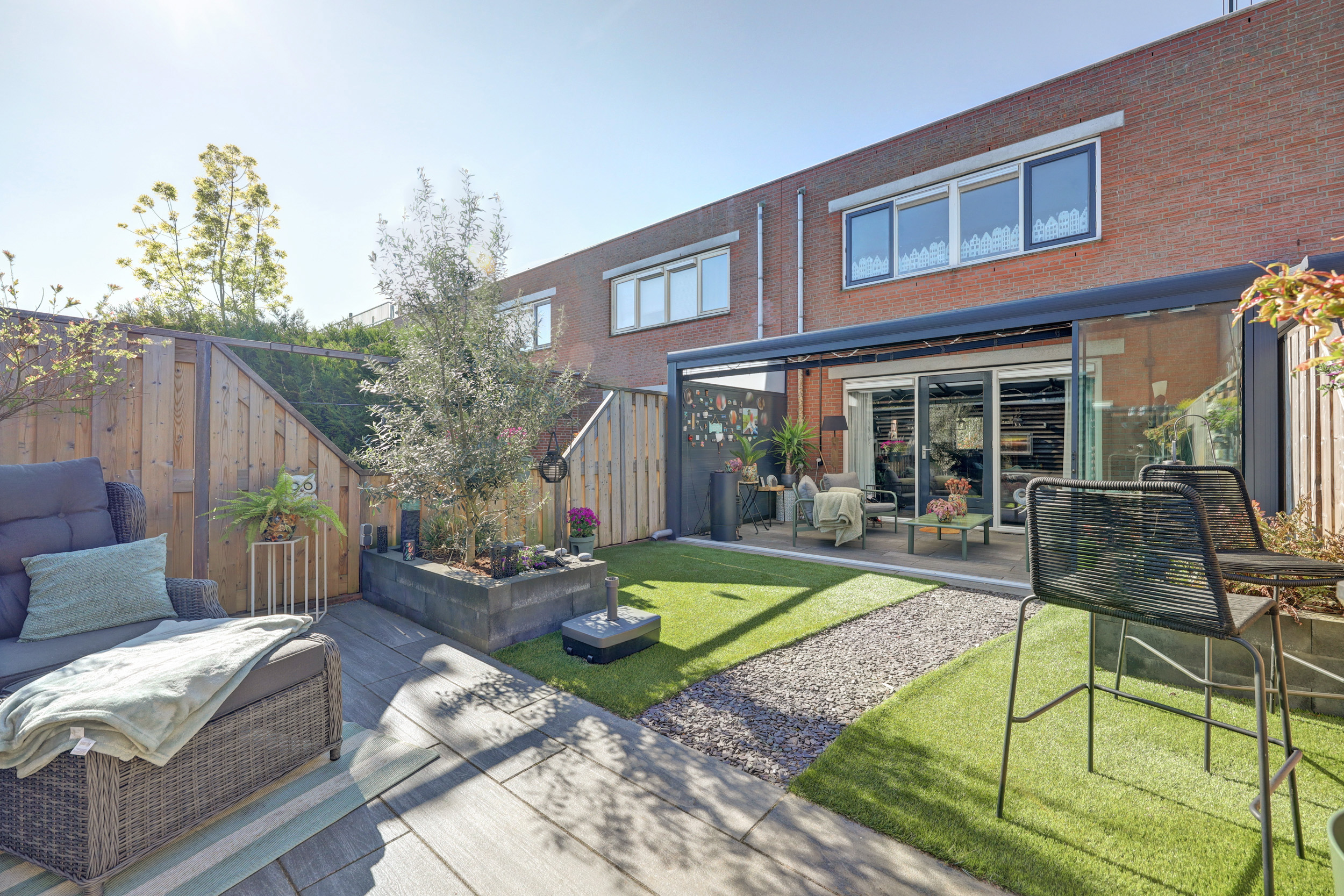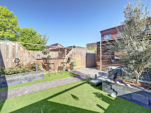 De verzorgde tuin is gelegen op het noordoosten en biedt gedurende de dag altijd wel een plekje in de zon. De tuin is compleet ingericht met onder andere tuinverlichting, een gezellige serre, een betegeld terras, een buitenkraan, een achterom en een houten berging (ca. 8 m²) voorzien van elektra. Ook de voortuin is netjes aangelegd en beschikt over een buitenkraan en fraaie beplanting in een border.