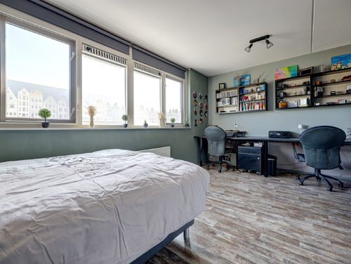 Deze royale kamer (ca. 17 m²) is gesitueerd aan de achterzijde van de woning en indien gewenst op te splitsen in twee slaapkamers.