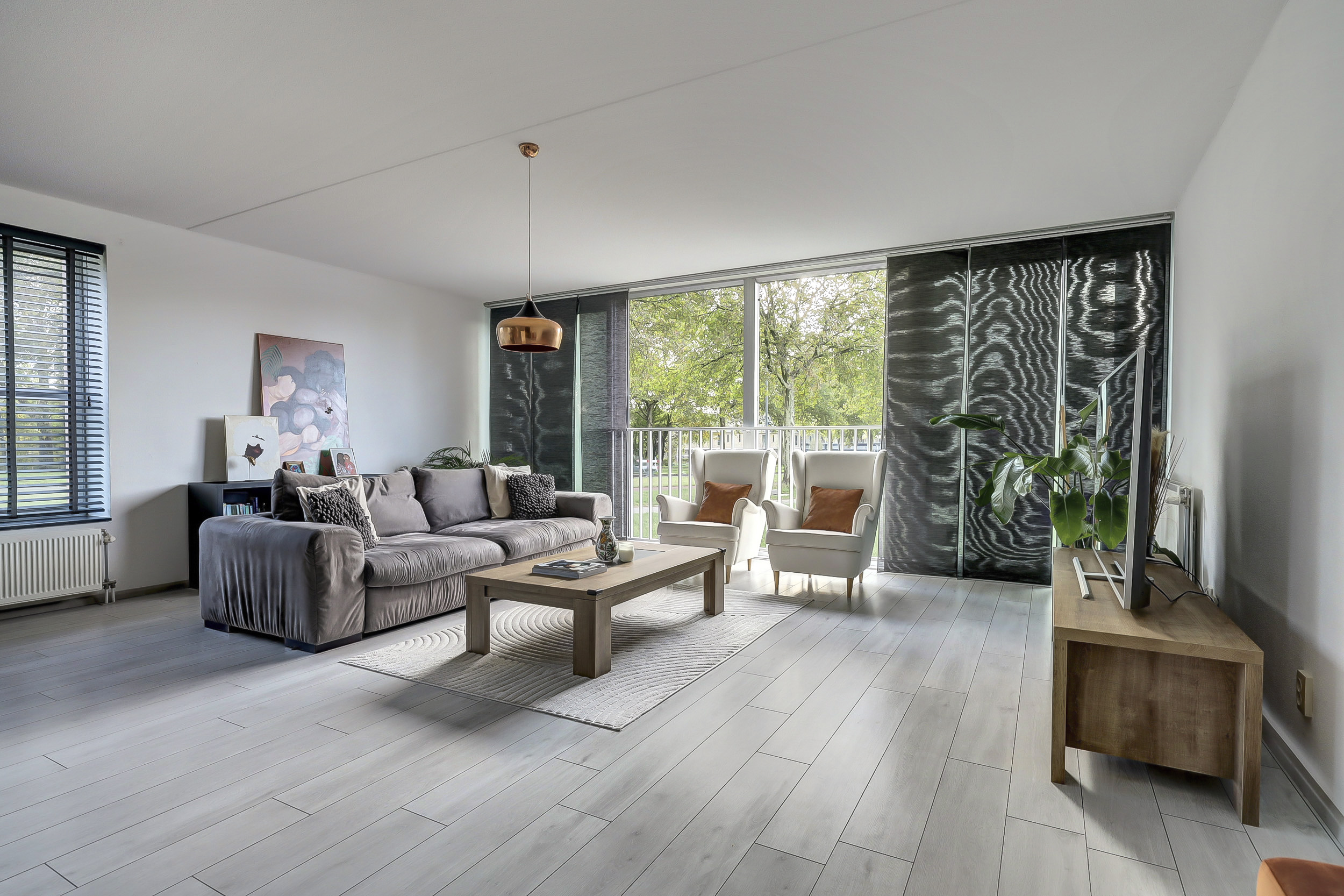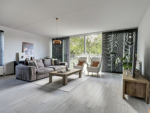 De woonkamer (ca. 55 m²) bevindt zich aan het einde van de hal en beschikt over een schuifpui met Frans balkon dat u een mooi uitzicht over de wijk biedt.