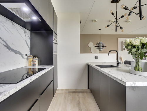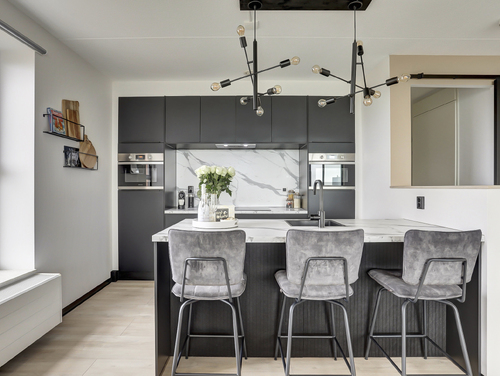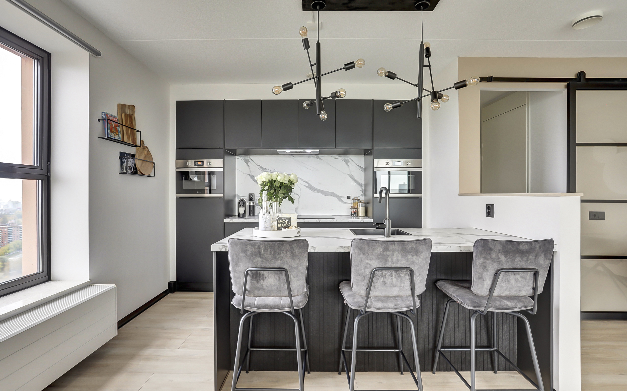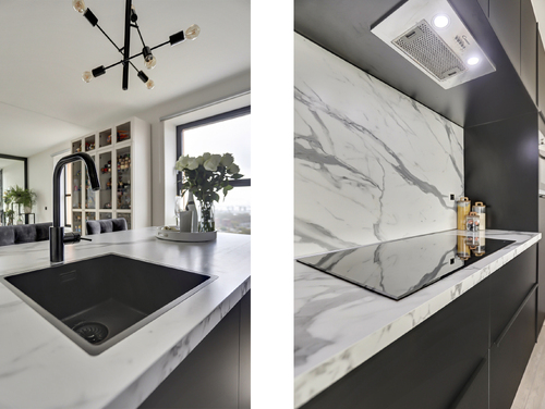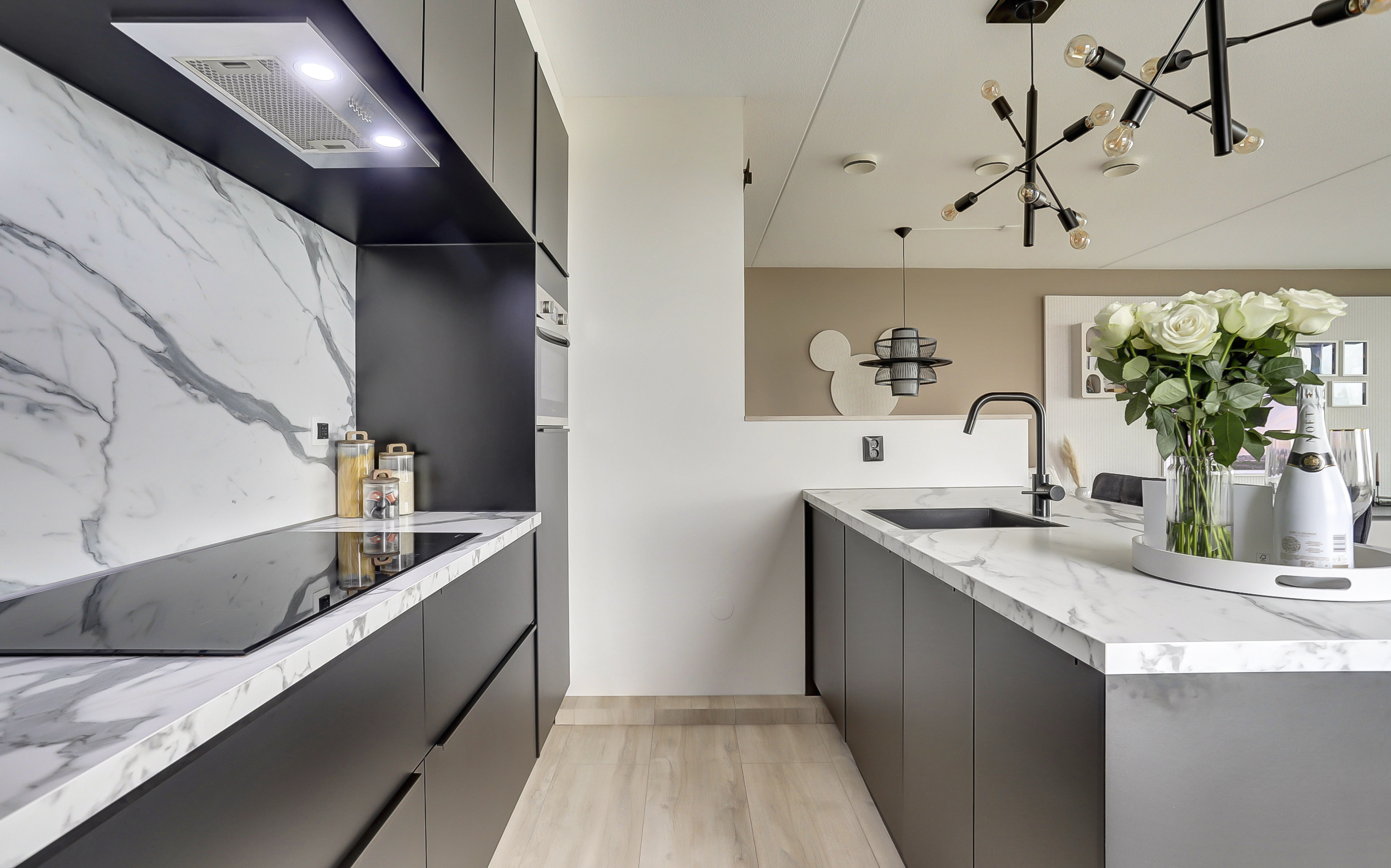 De moderne openkeuken (ca. 8 m²) met gezellige eetbar, is van alle gemakken voorzien en uitgevoerd met diverse inbouwapparatuur als een koelkast, vriezer, inductie kookplaat, vaatwasser, dubbele combimagnetron en een afzuigschouw. De laminaatvloer en wandafwerking van de woonkamer lopen naadloos over in de keuken en zorgen voor een sfeervol en bijpassend geheel.