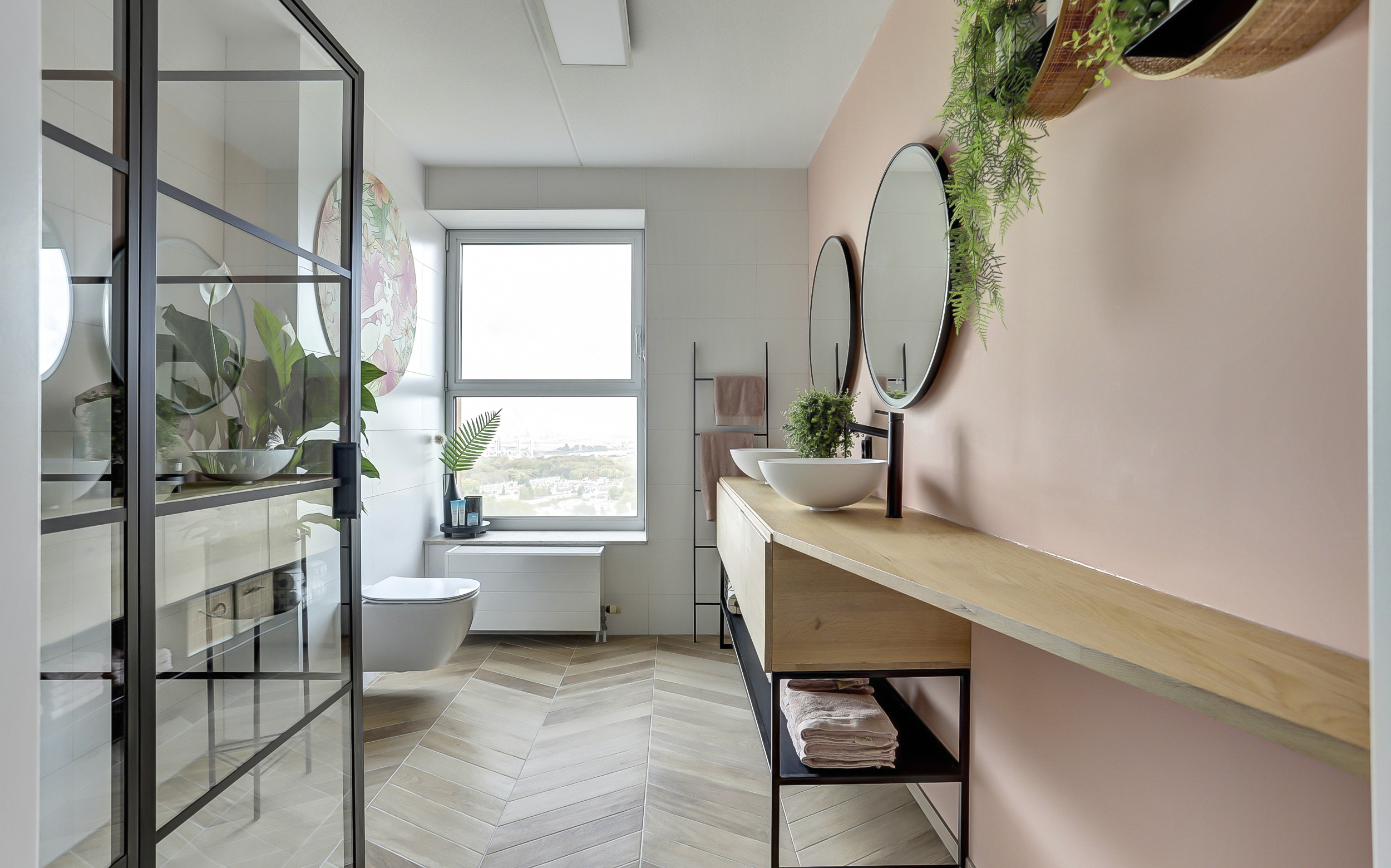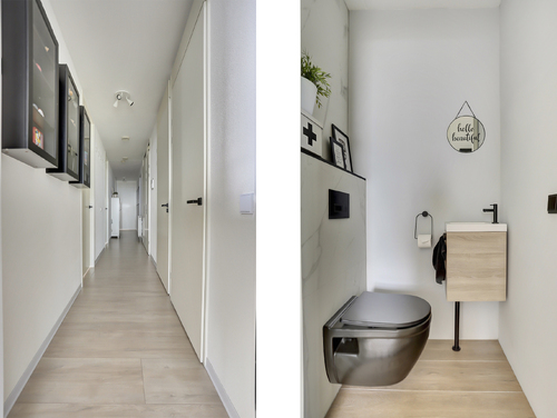 De prachtige badkamer (ca. 8 m²) is voorzien van een neutrale kleurstelling en uitgerust met een ruime douchecabine met regendouche, een 2e toilet met zwevend closet en een dubbele wastafel met fraai meubel.