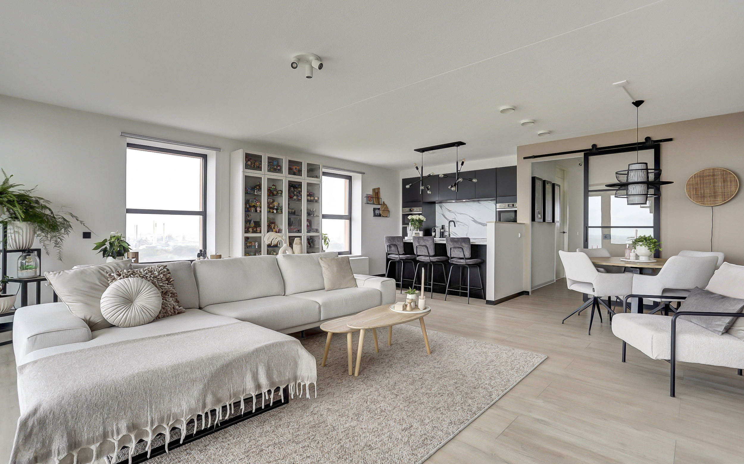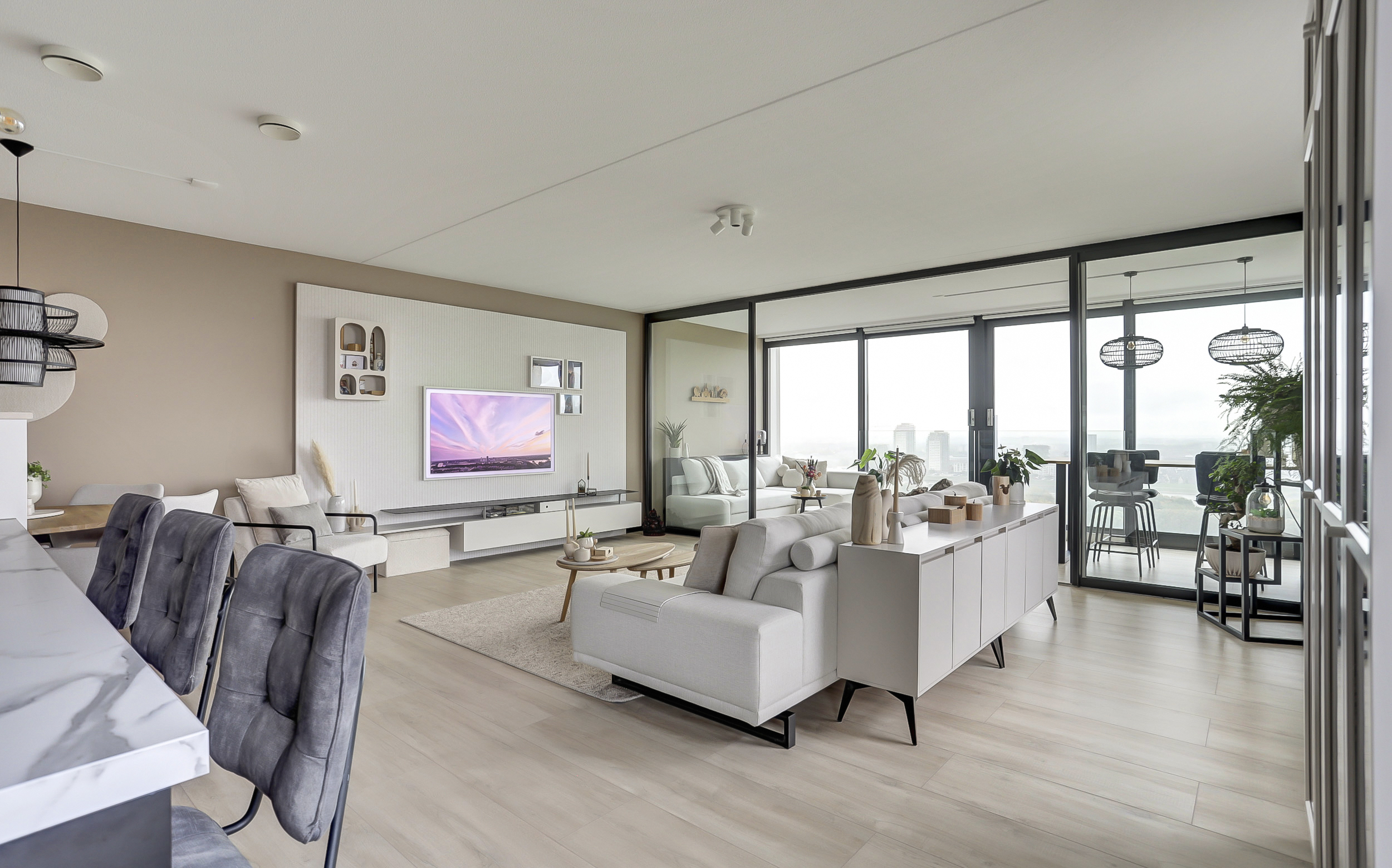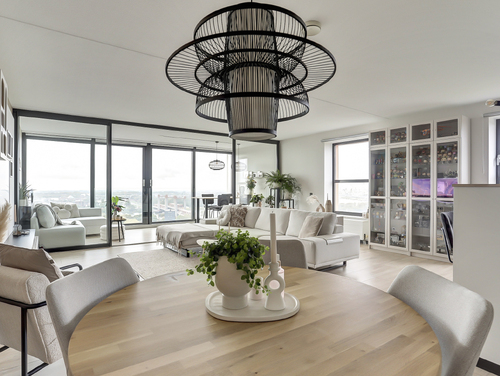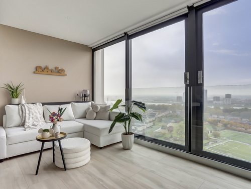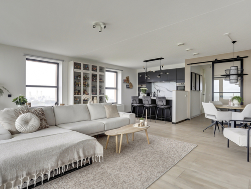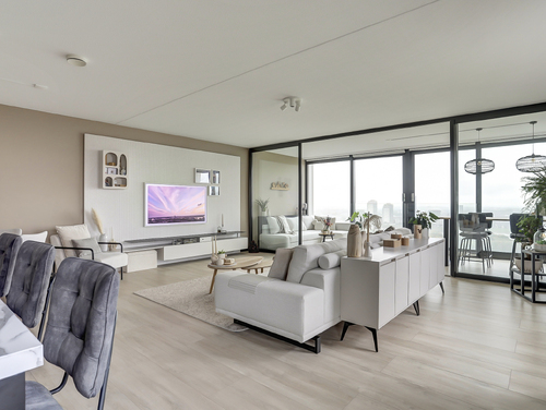 Bij binnenkomt in de sfeervolle en lichte woonkamer van ca. 50 m², word je direct verrast door het prachtige uitzicht. De woonkamer is voorzien van grote raampartijen met twee schuifpuien en een frans balkon. Het appartement is gesitueerd op het zuidwesten waardoor je in de zithoek (met de deuren open) kunt genieten van de zon en oneindig ver kunt kijken. De woonkamer staat in directe verbinding met de moderne openkeuken.