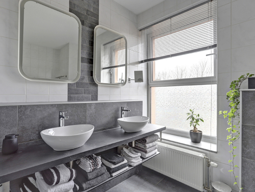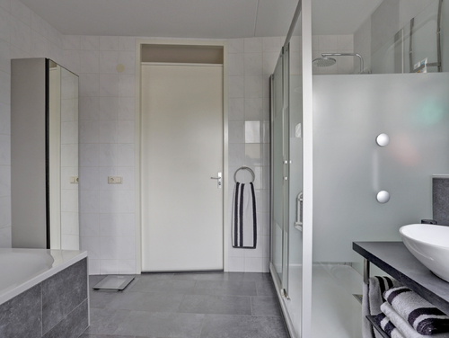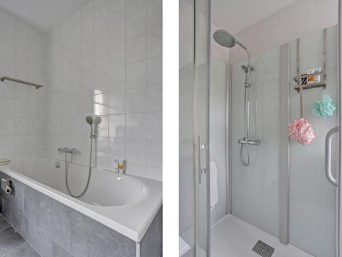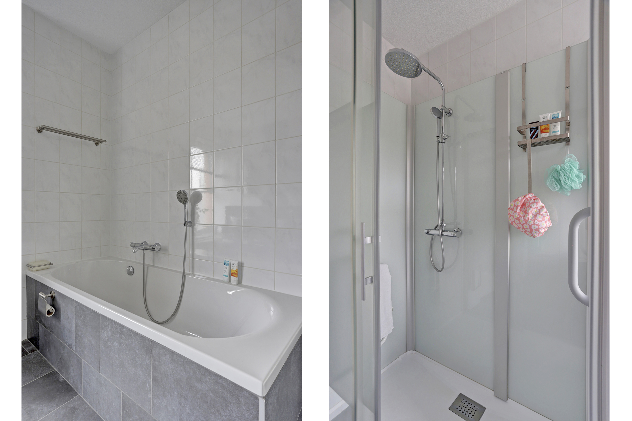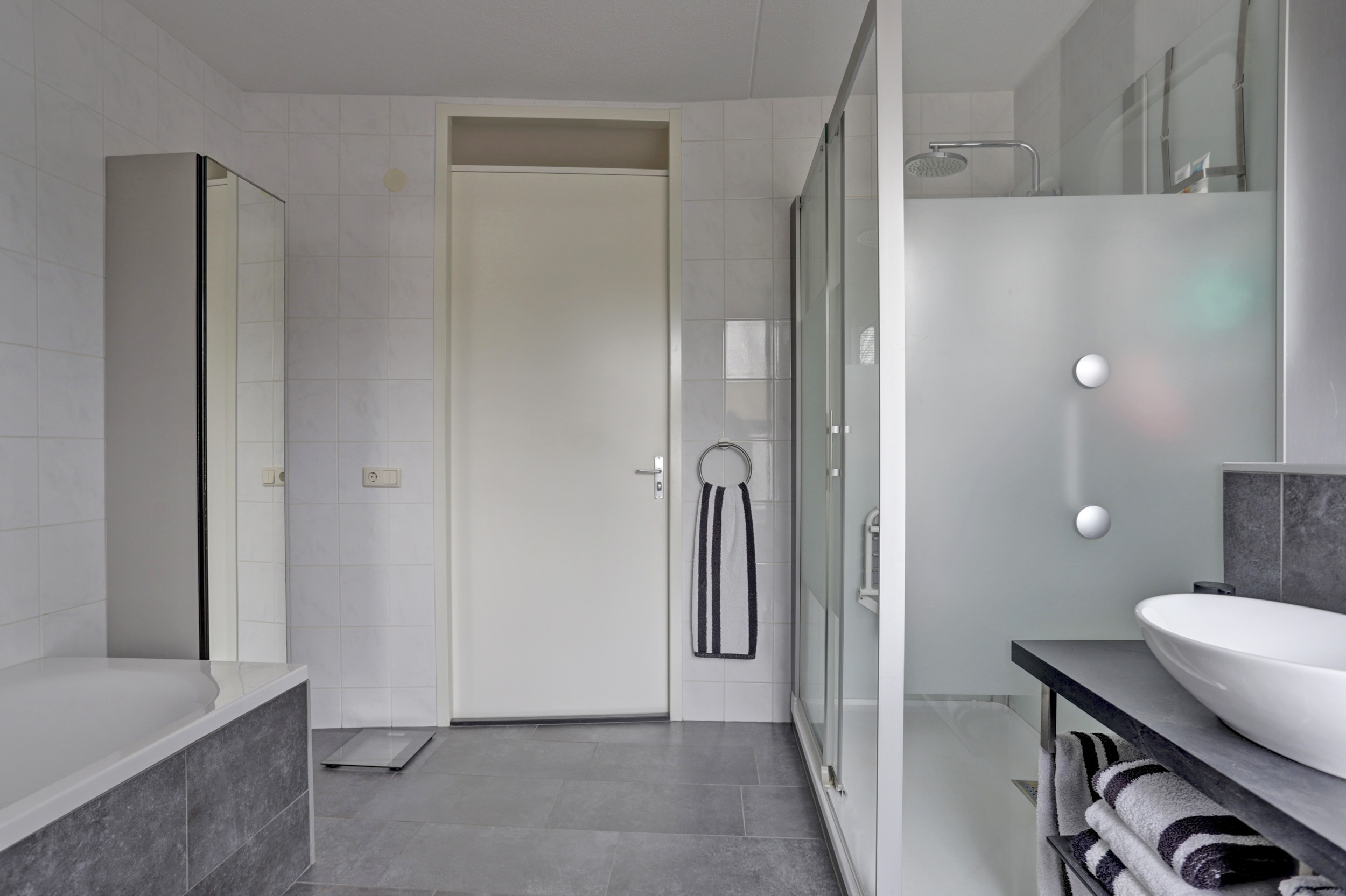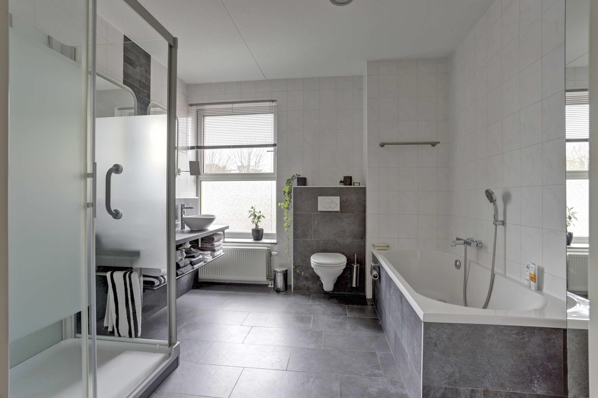 De luxe geheel licht betegelde badkamer is compleet uitgerust met een ruime douchecabine, kunststof ligbad, dubbele wastafel met meubel, 2e toilet (hangcloset), een radiator en een draai-/kiepraam. De ruimte wordt ook mechanisch geventileerd.