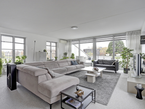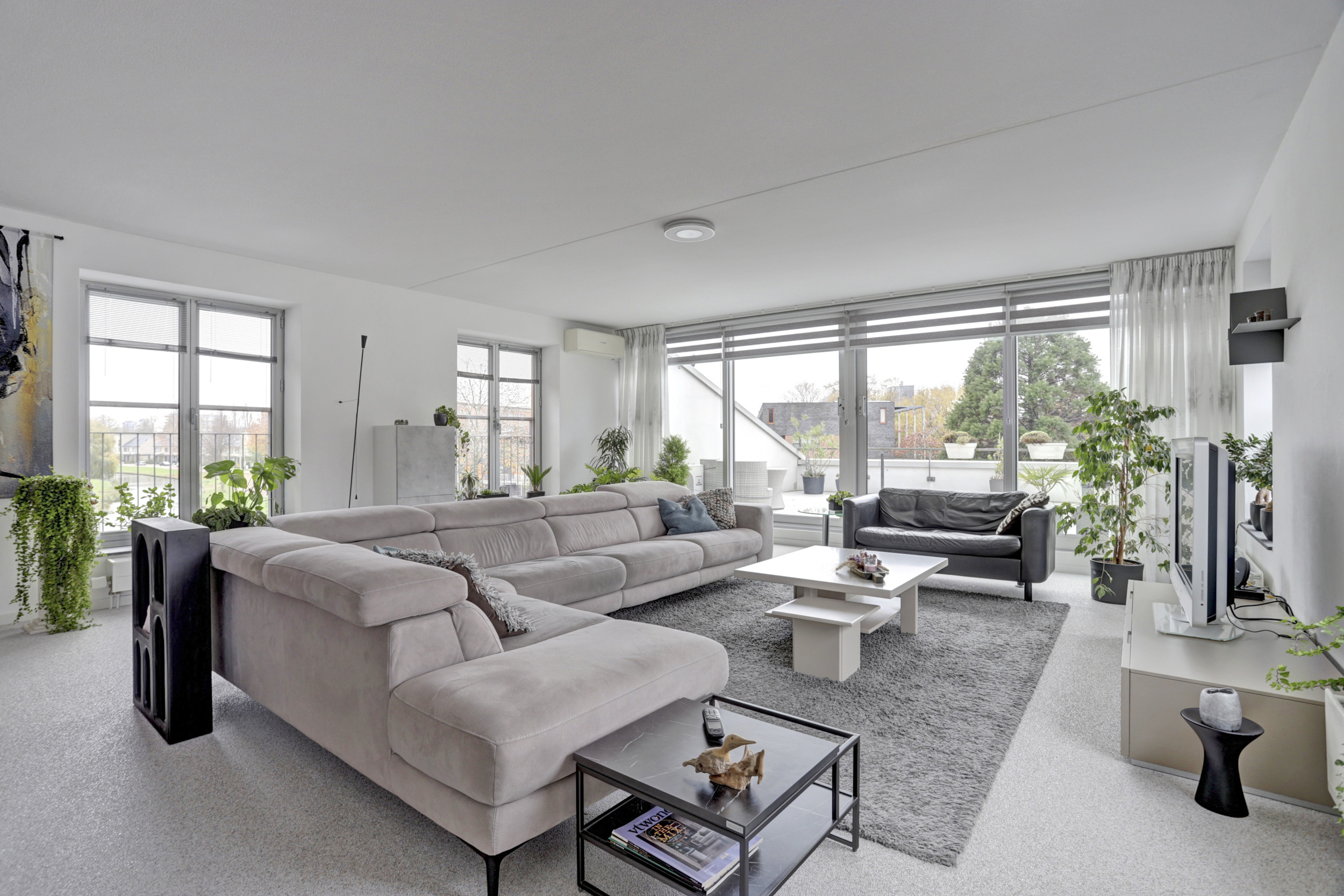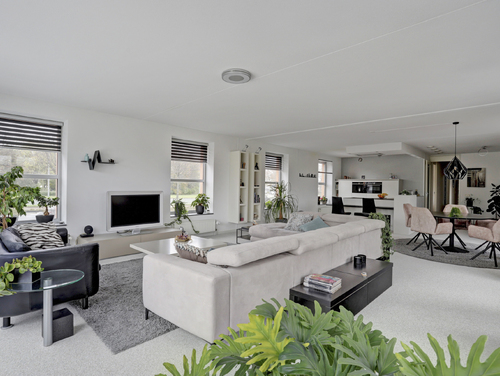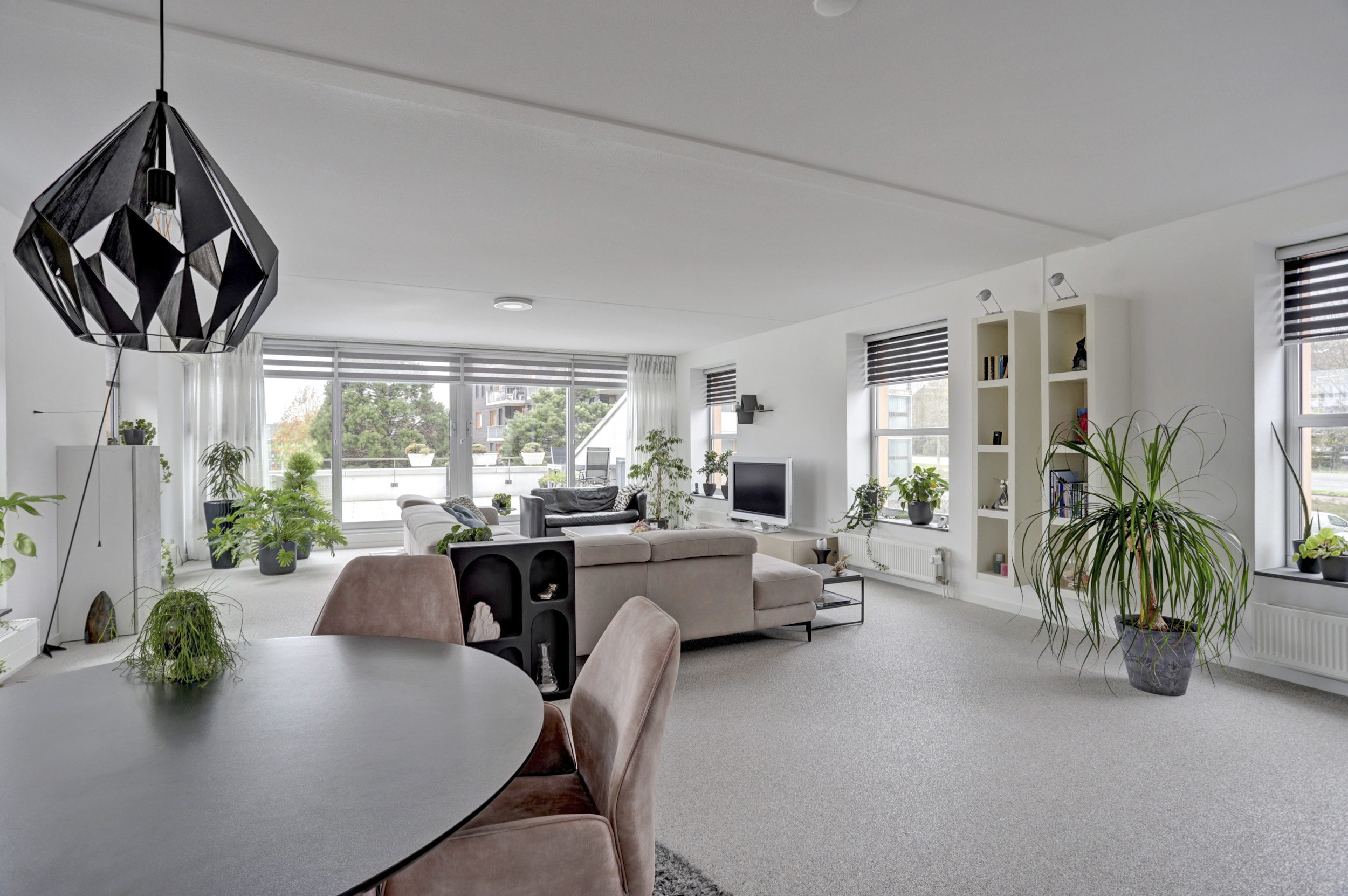 In de royale woonkamer (ca. 81 m²) eveneens met epoxy siergrindvloer, is het prettig verblijven. Door de riante opzet ervaar je rust en ruimte. De vele ramen en de woningbrede schuifpui zorgen voor een fijne lichtinval, maar je blijft ook 'betrokken' bij wat er om je heen gebeurt.