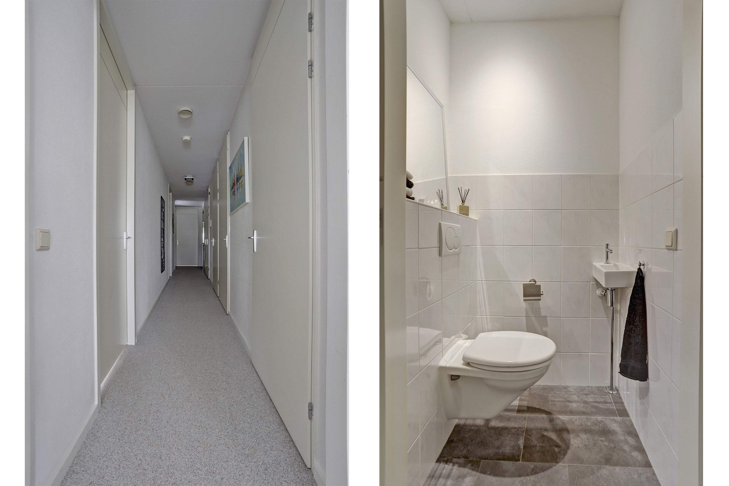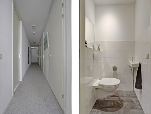 Hal/entree (ca. 14 m²) met toegang tot de diverse vertrekken. Daarnaast tref je hier een licht betegeld toilet met hangcloset en fonteintje, meterkast (8 groepen, glasvezel en slimmer meters), een epoxy siergrindvloer, een vaste kast met de unit van stadsverwarming (Vattenfall) en een videofoon, zodat je kunt zien en horen wie er beneden aanbelt.
