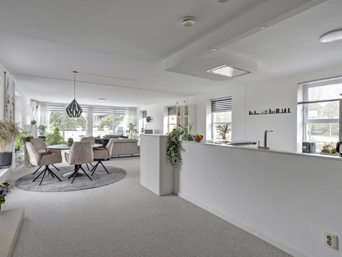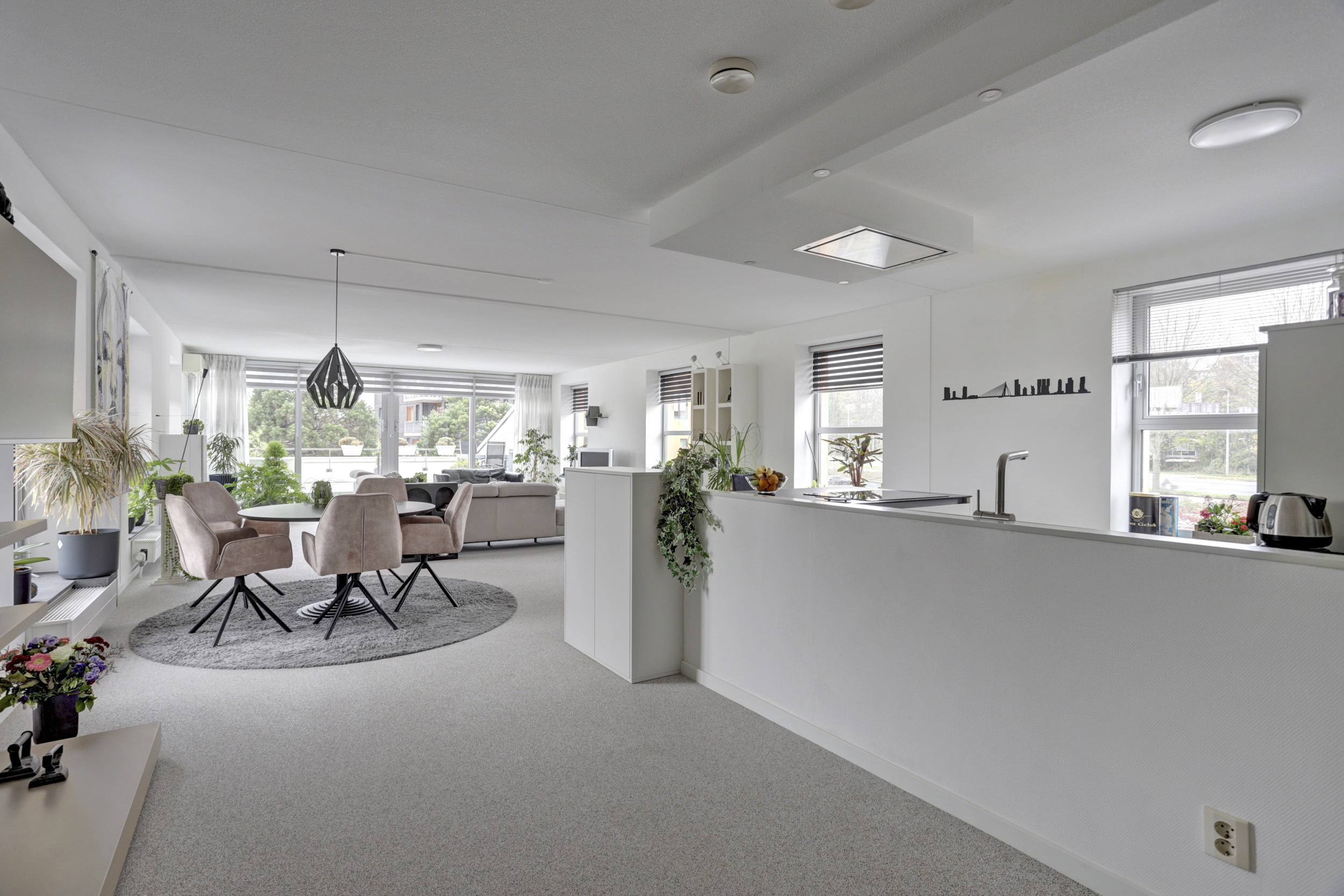 De moderne open keuken is geplaatst in 2020 en uitgerust met een U-vormige opstelling, voorzien van diverse (Siemens) inbouwapparatuur zoals een koelkast, vriezer, vaatwasser, combi-stoomoven/magnetron, inductiekookplaat en een RVS Novy plafond afzuigunit (met plasmafilter). Verder is er de beschikking over diverse lades, een gezellige eetbar en ingebouwde verlichting. De vloer en wandafwerking van de woonkamer lopen vloeiend over in de keuken en vormen een sfeervol en bijpassend geheel.