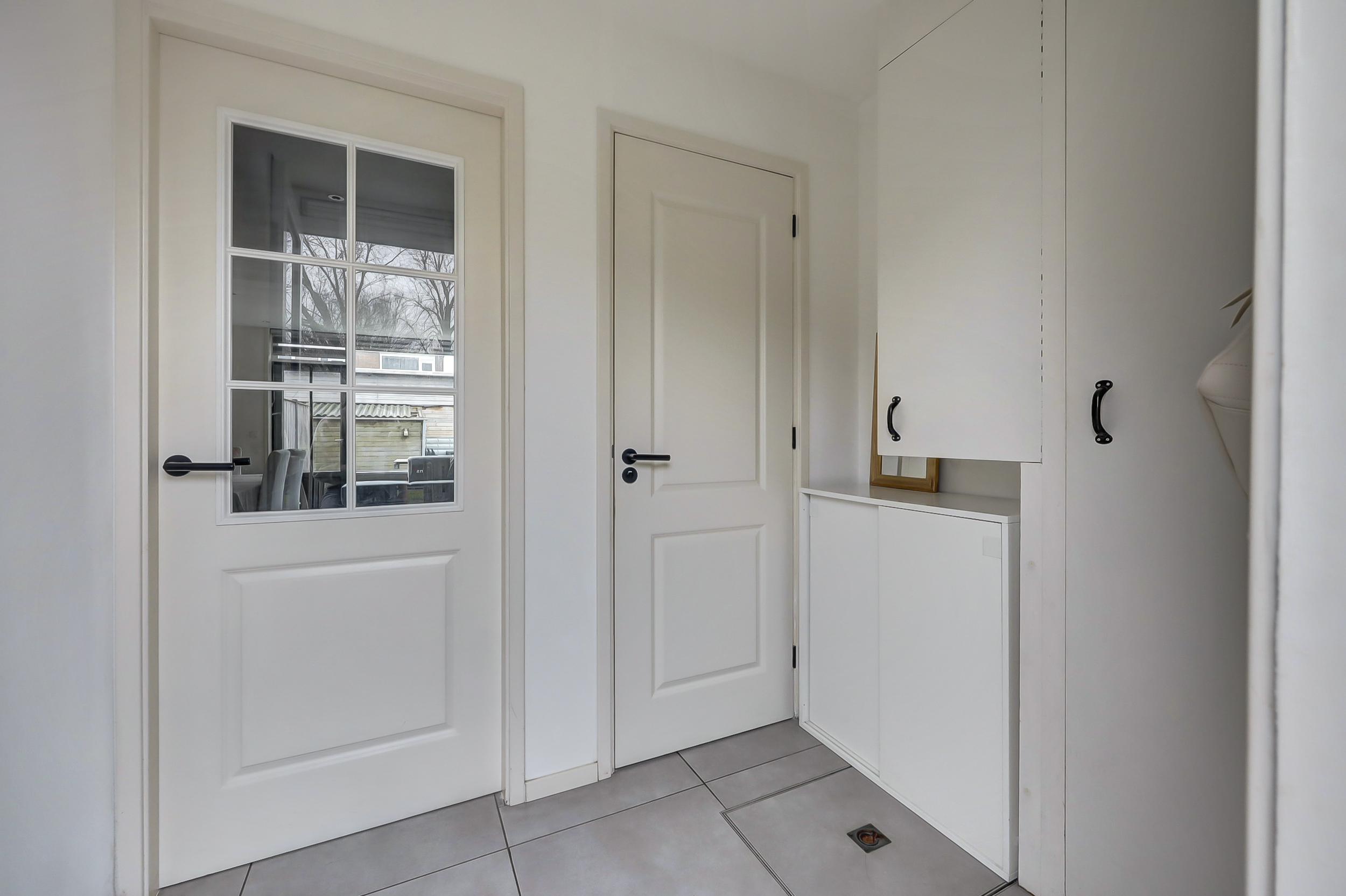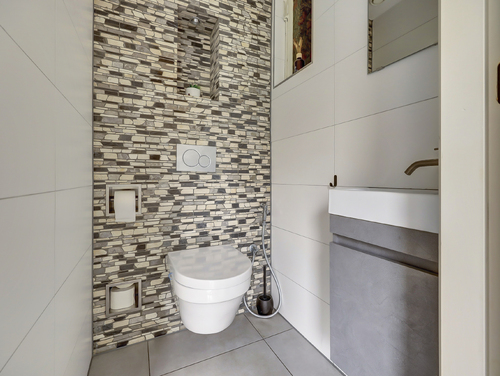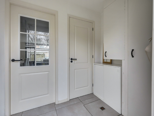 Hal/entree met plavuizenvloer, vloerverwarming, een modern en vergroot toilet met zwevend closet(douche) en fonteintje, een uitgebreide meterkast (11 groepen/slimme meters/glasvezel) en de opstelling van de cv combiketel die netjes is weggewerkt in een vaste kast.