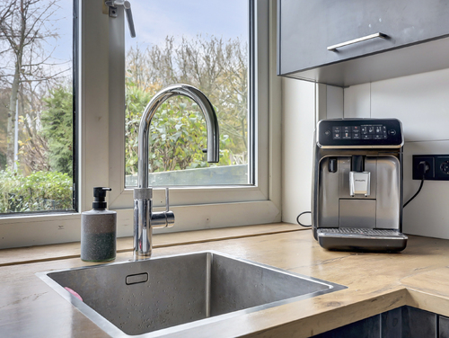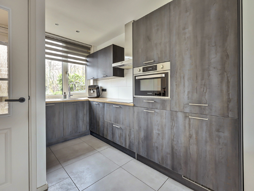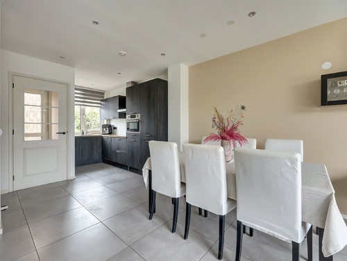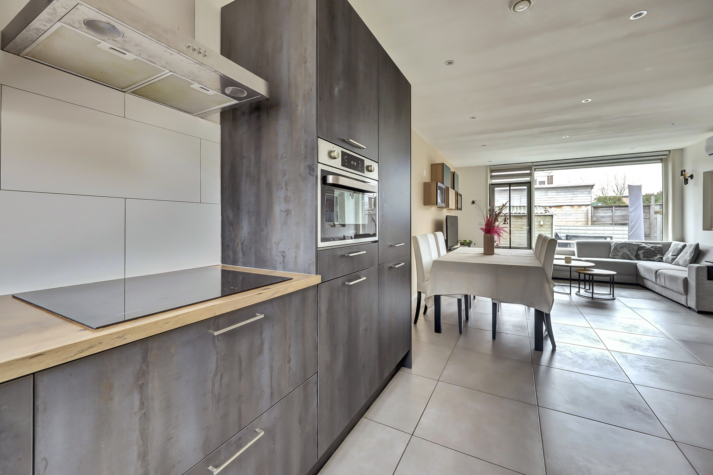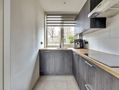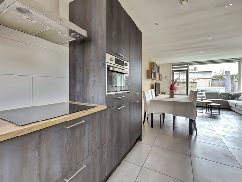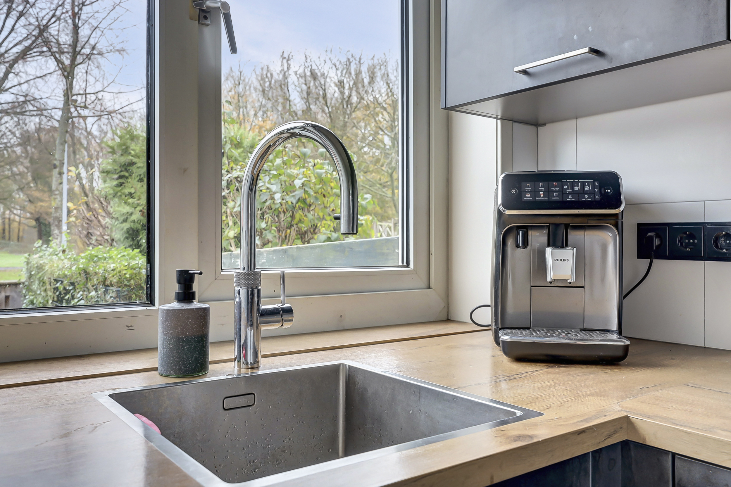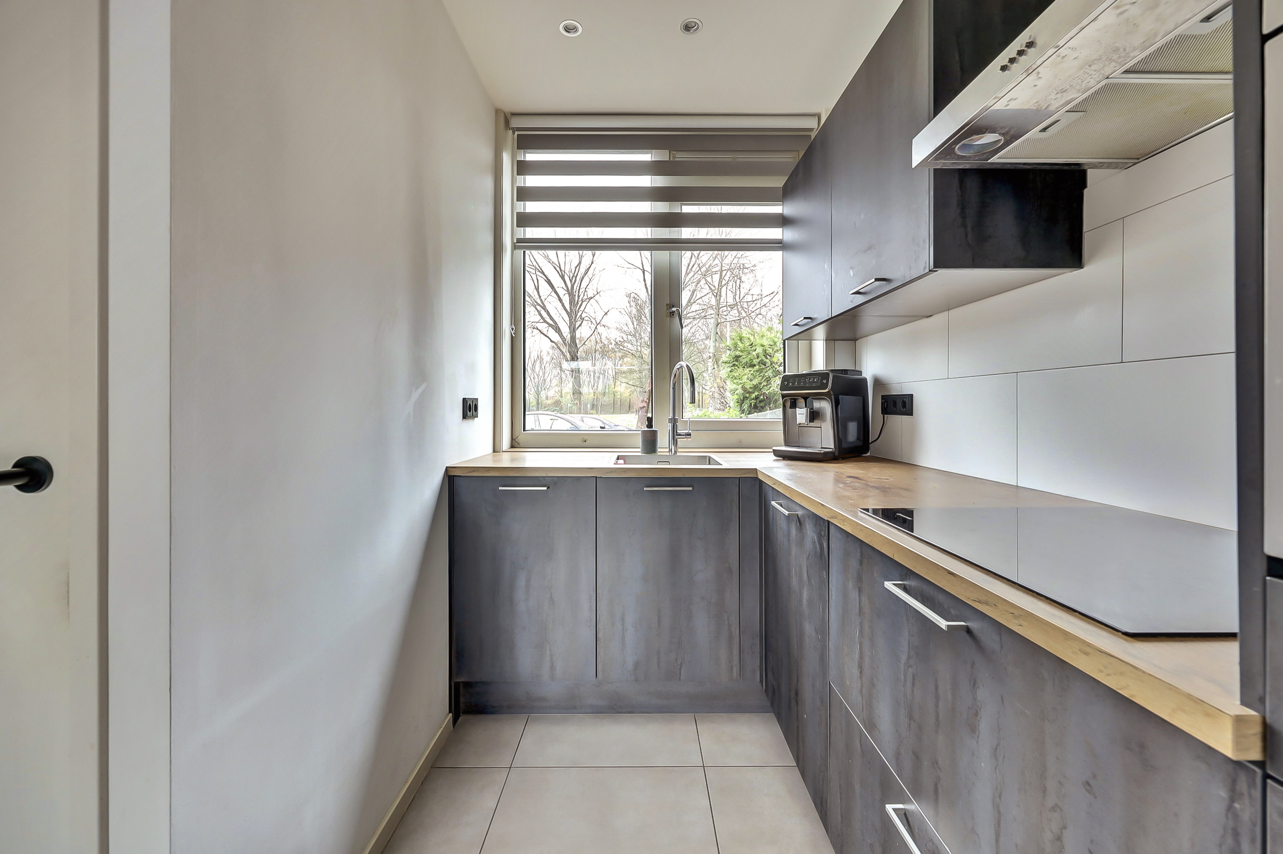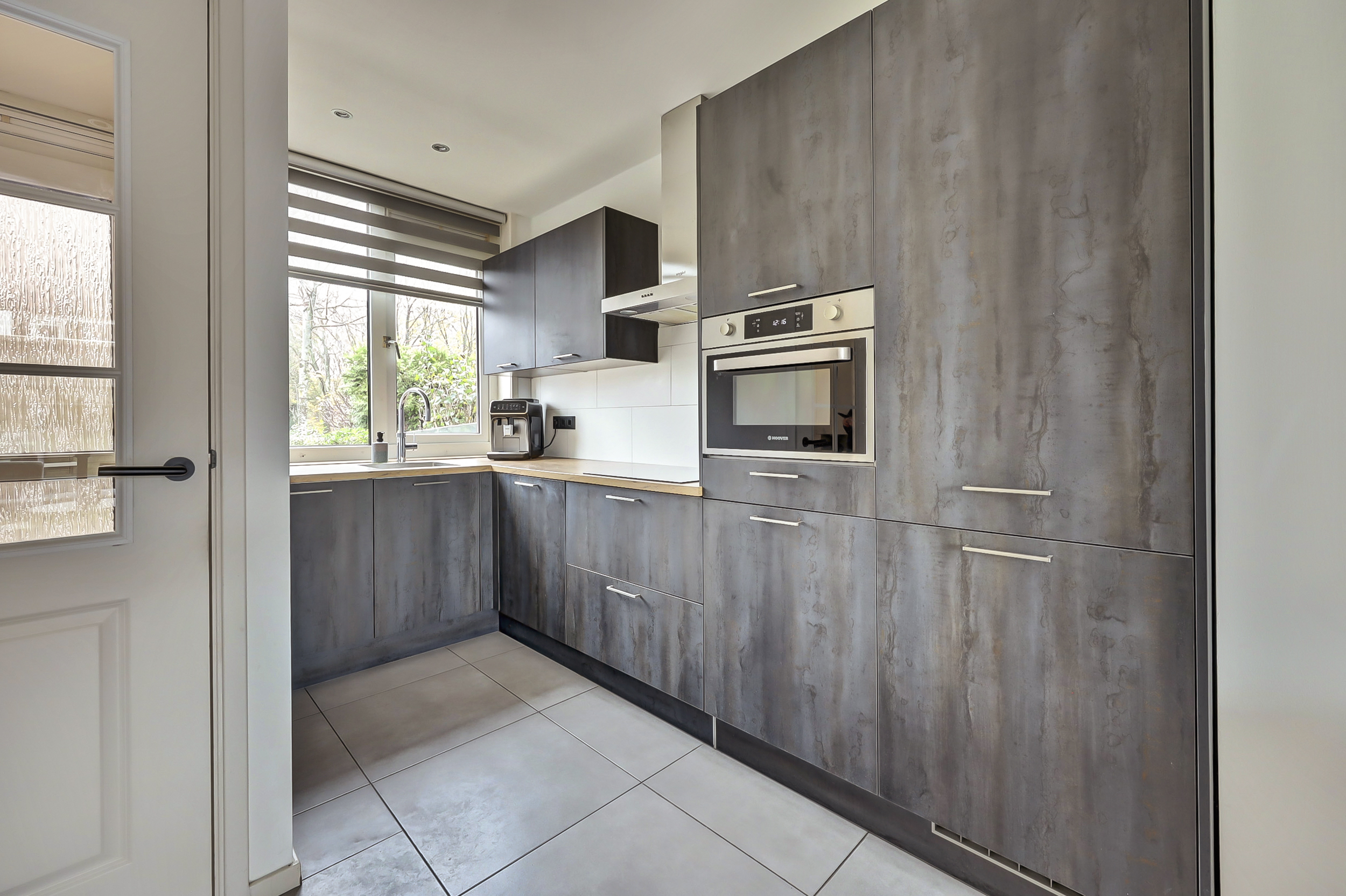 De open keuken beschikt (ca. 8 m², 2019) over een moderne L-vormige inrichting en diverse ingebouwde apparatuur zoals een koelkast, vriezer, inductiekookplaat, vaatwasser, combimagnetron en een Quooker.