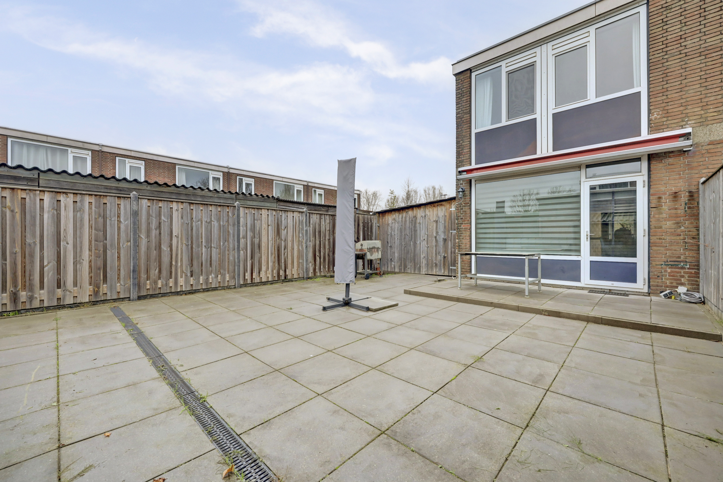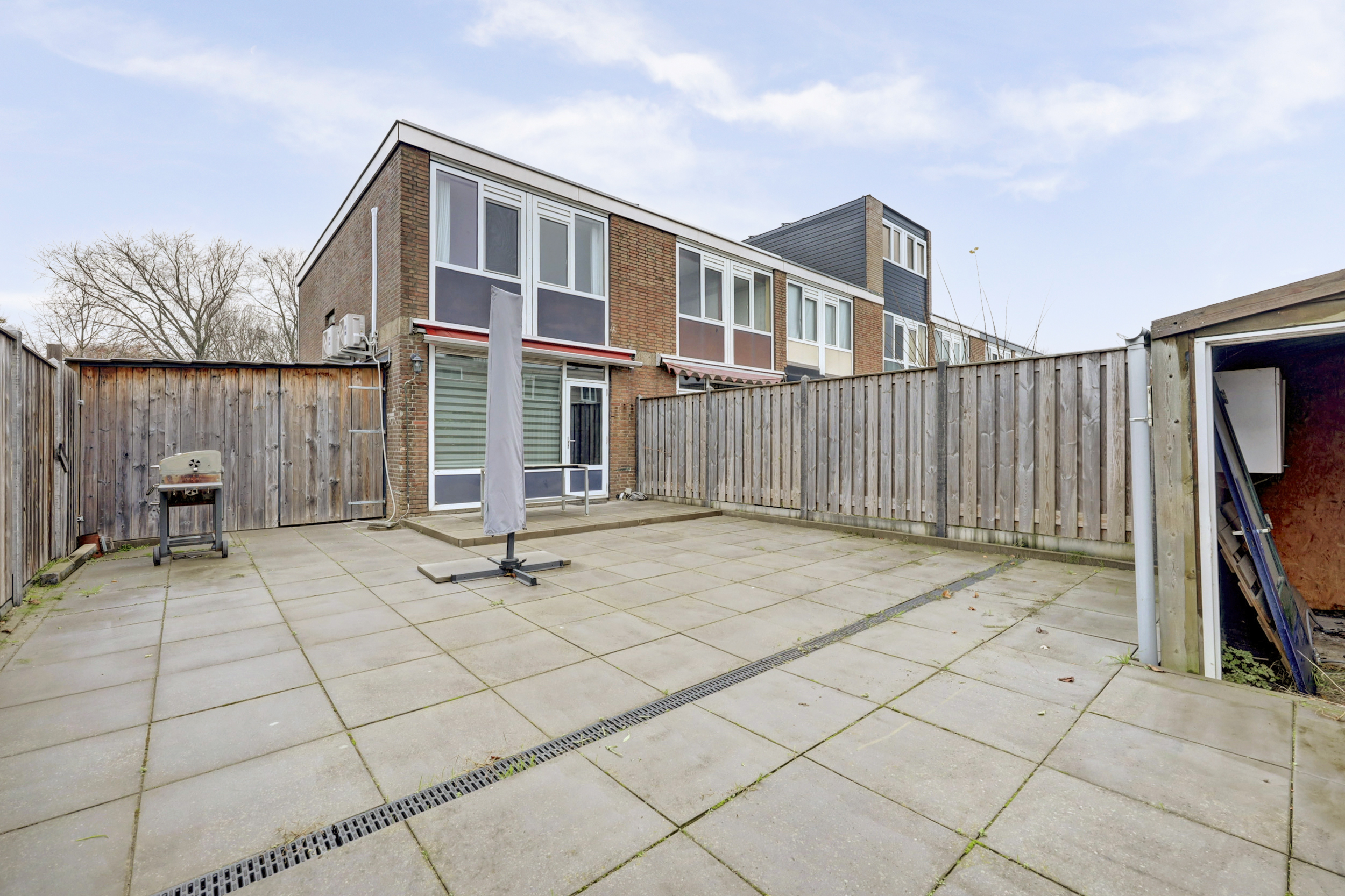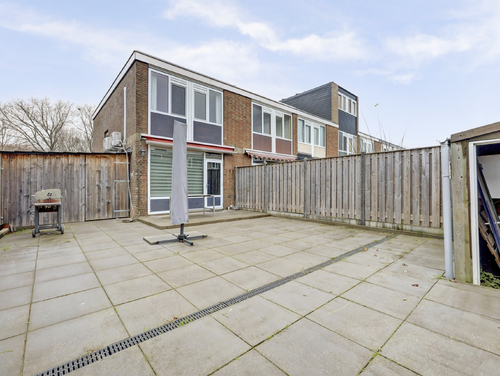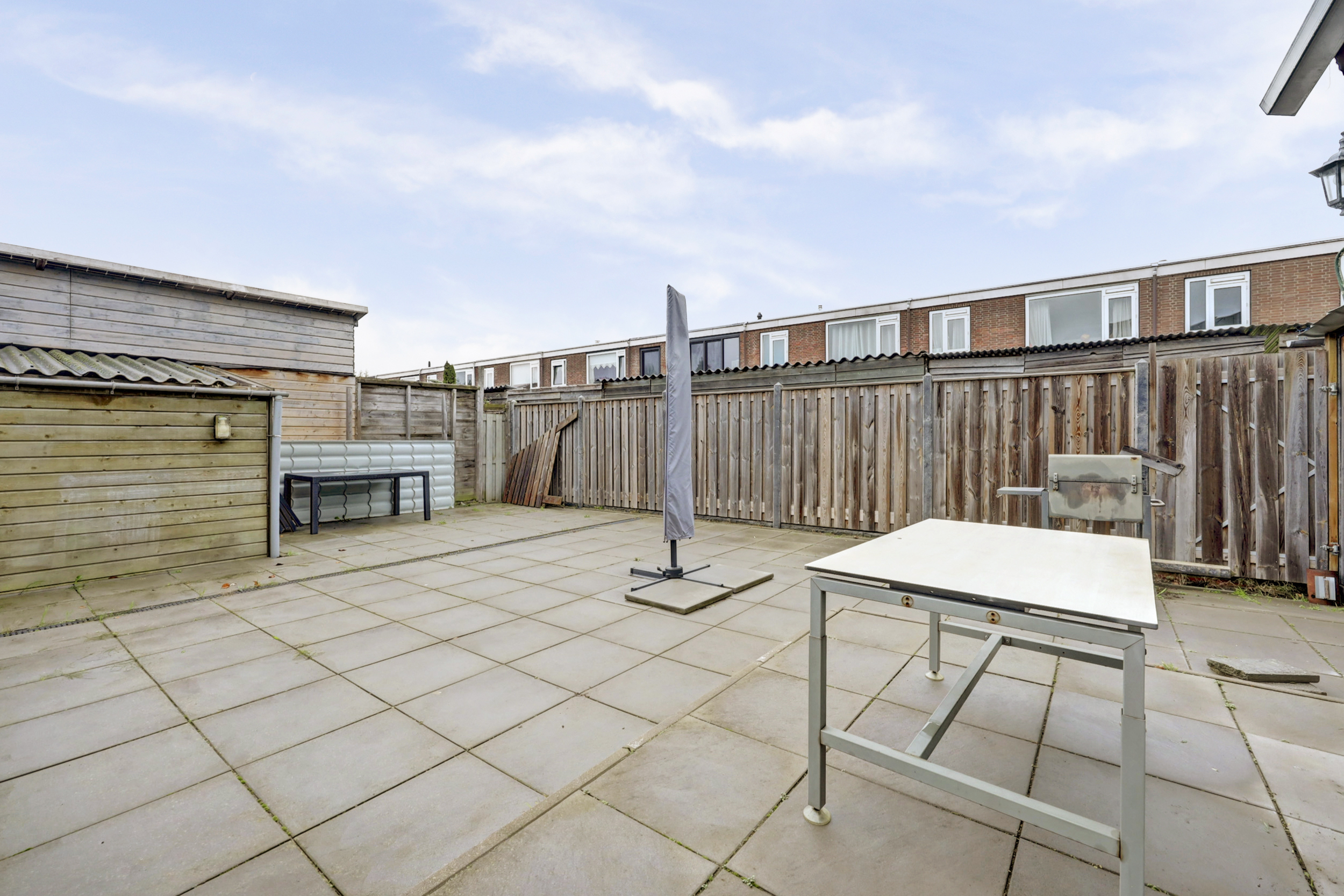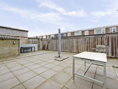 De royale tuin is betegeld en voorzien van zonwering, een achterom, een vrijstaande houten berging en een houten aangebouwde berging. Deze aangebouwde berging is ca. 28 m², en ideaal voor de hobbyisten of het stallen van meerdere fietsen, scooters of motoren.