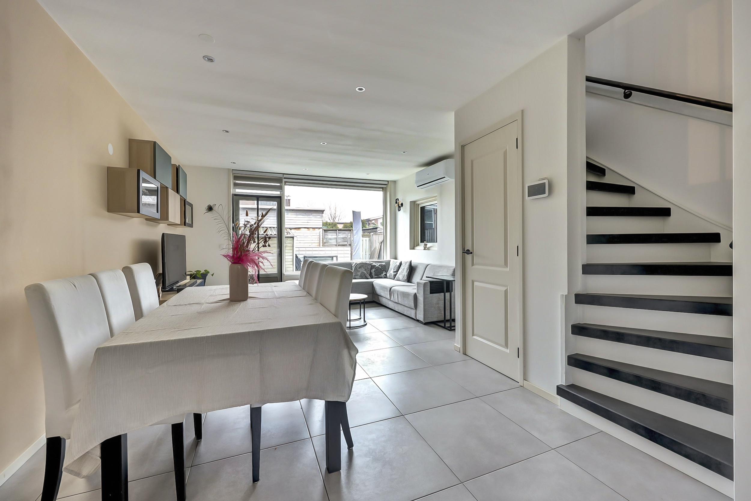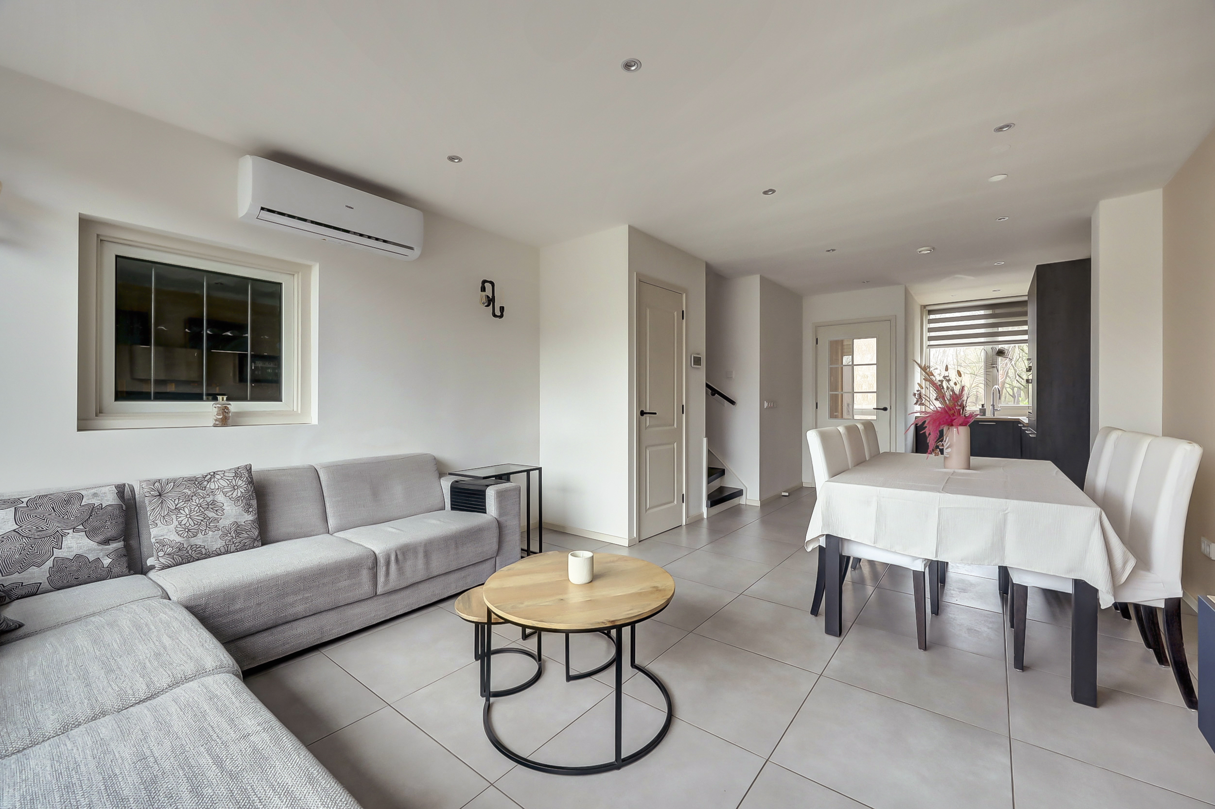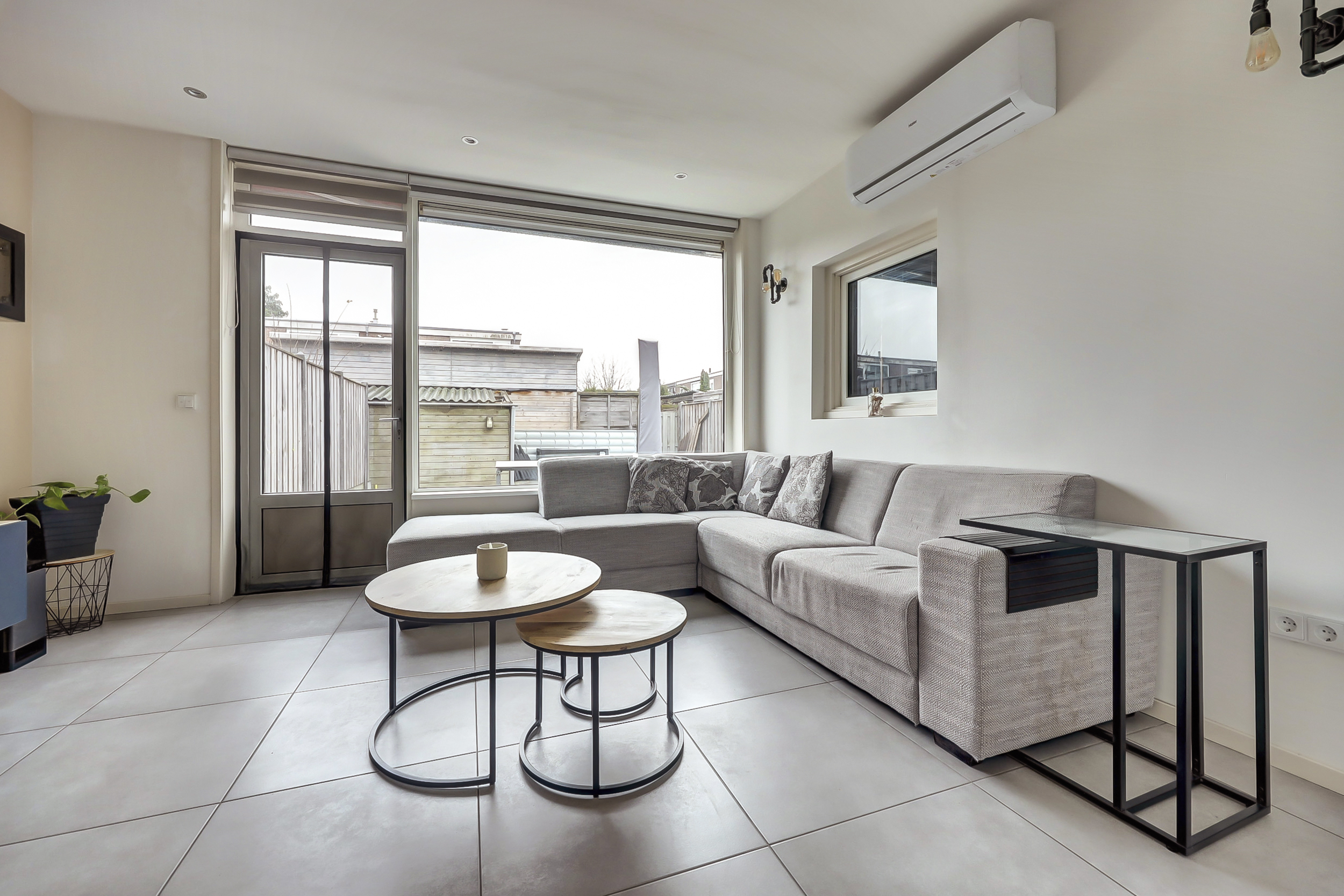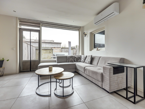 De tuingerichte woonkamer (ca. 20 m²) is sfeervol ingericht en uitgerust met een plavuizenvloer met vloerverwarming (2019), een handige voorraadkast, trapopgang, airconditioning (koelen en verwarmen), ingebouwde verlichting en een deur die toegang geeft tot de tuin.