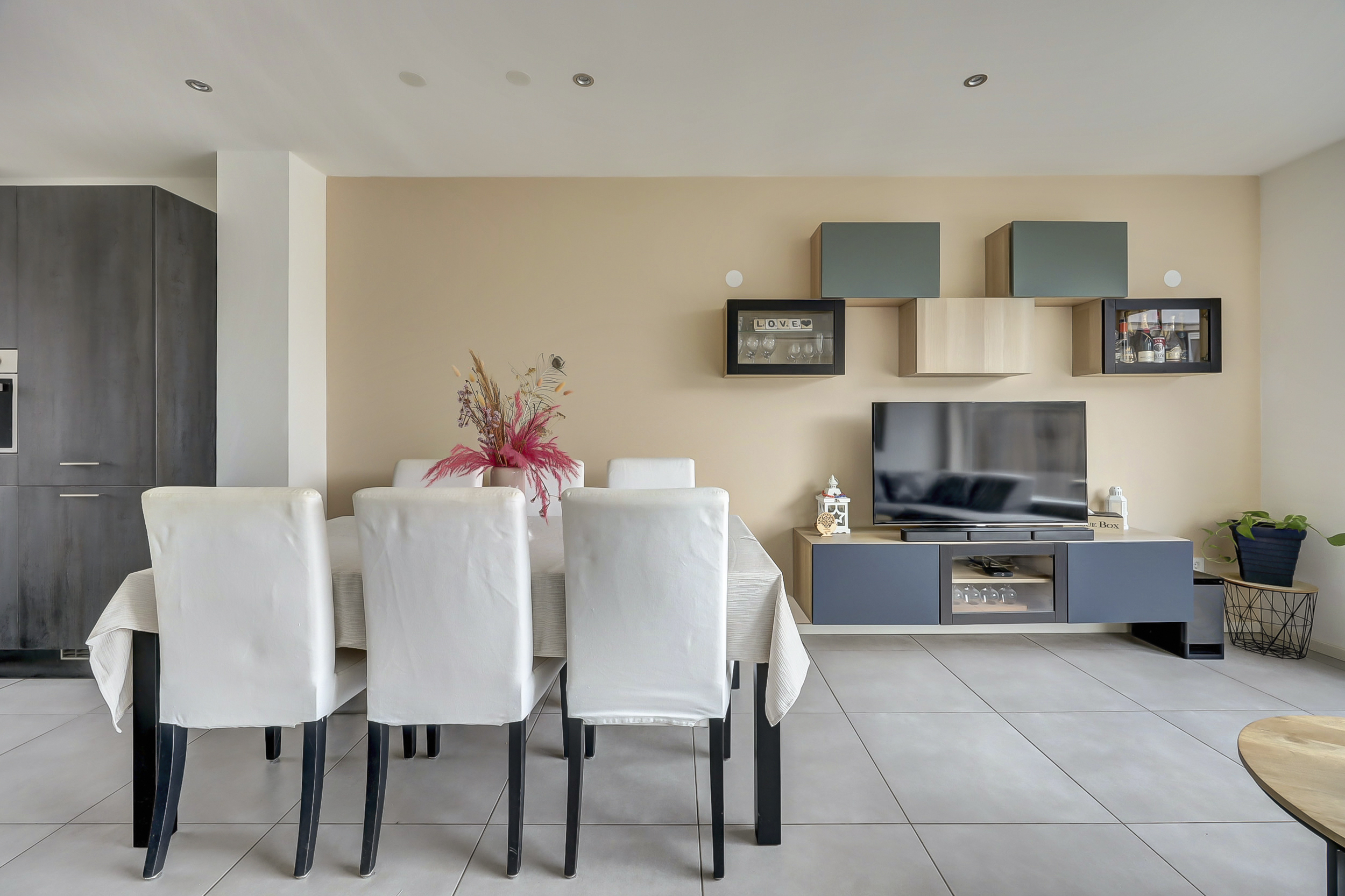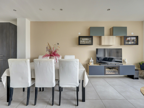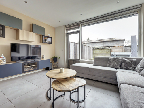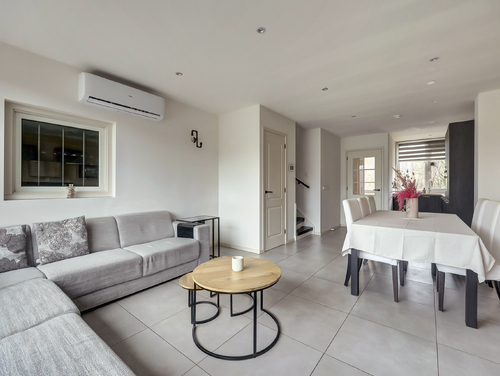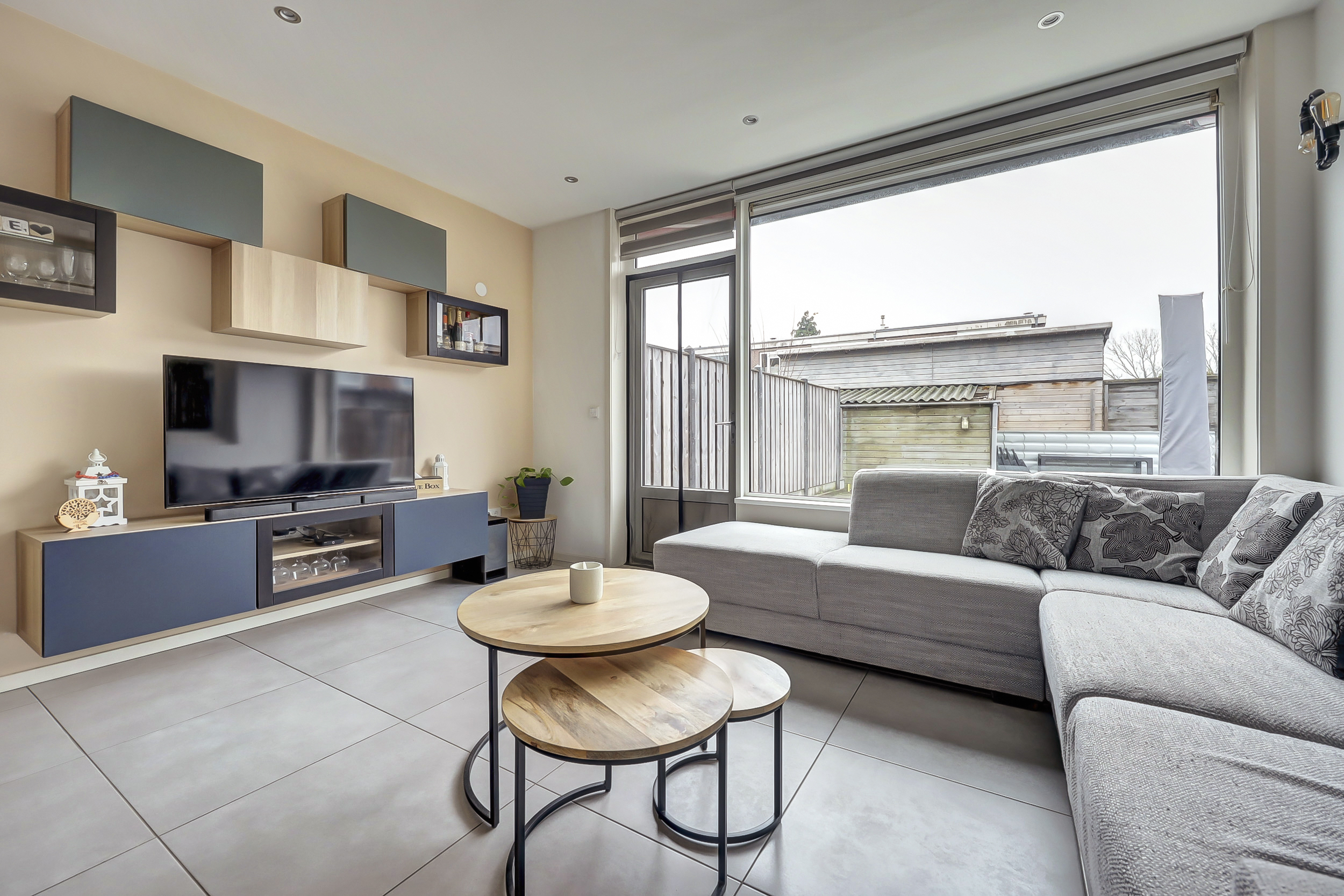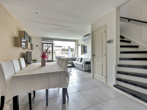 De tuingerichte woonkamer (ca. 20 m²) is sfeervol ingericht en uitgerust met een plavuizenvloer met vloerverwarming (2019), een handige voorraadkast, trapopgang, airconditioning (koelen en verwarmen), ingebouwde verlichting en een deur die toegang geeft tot de tuin.