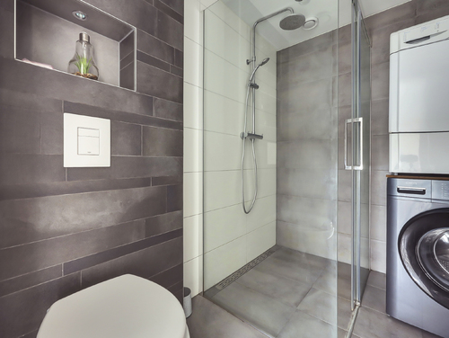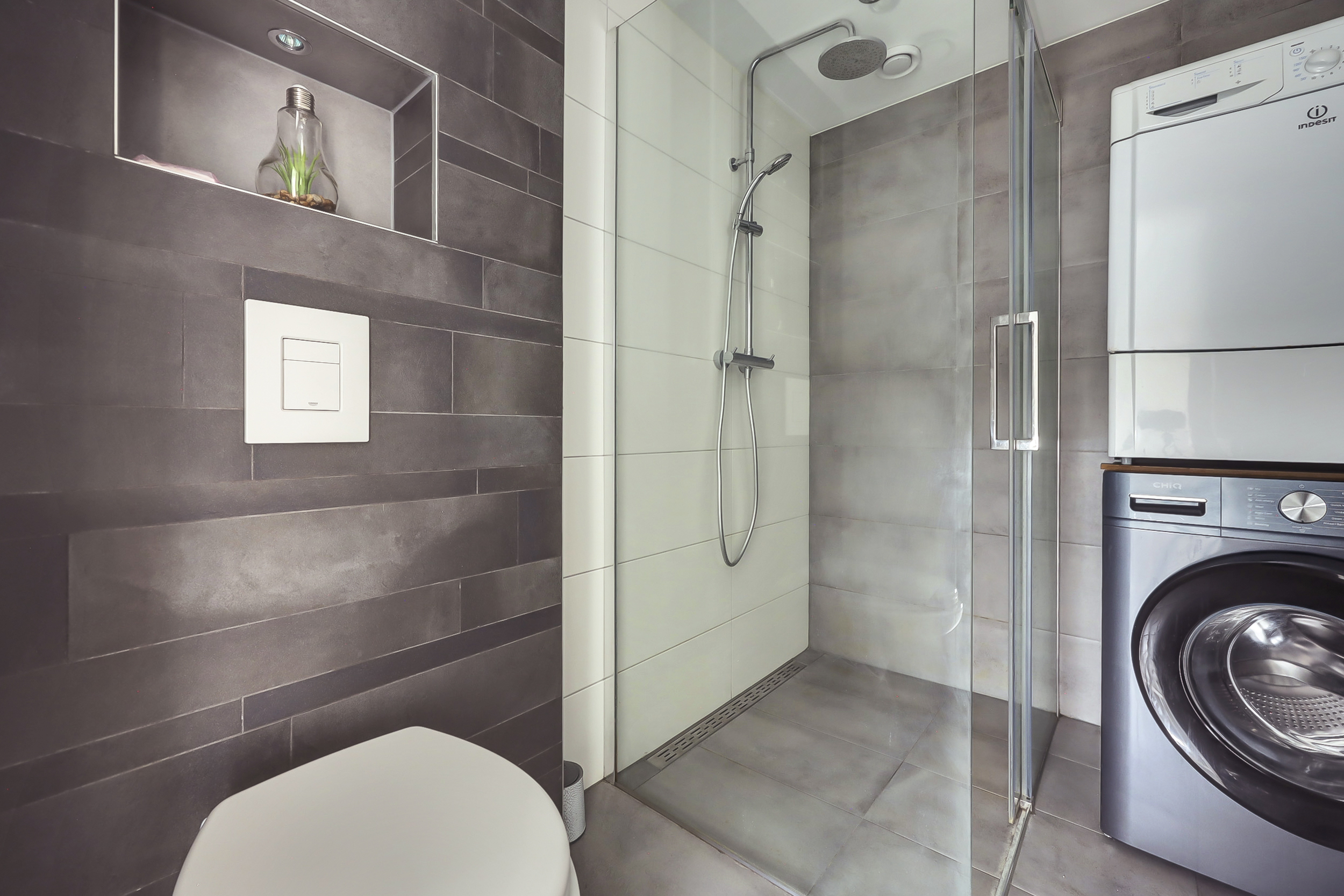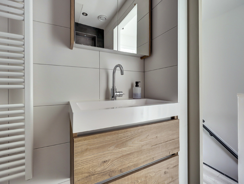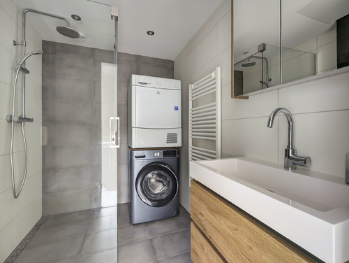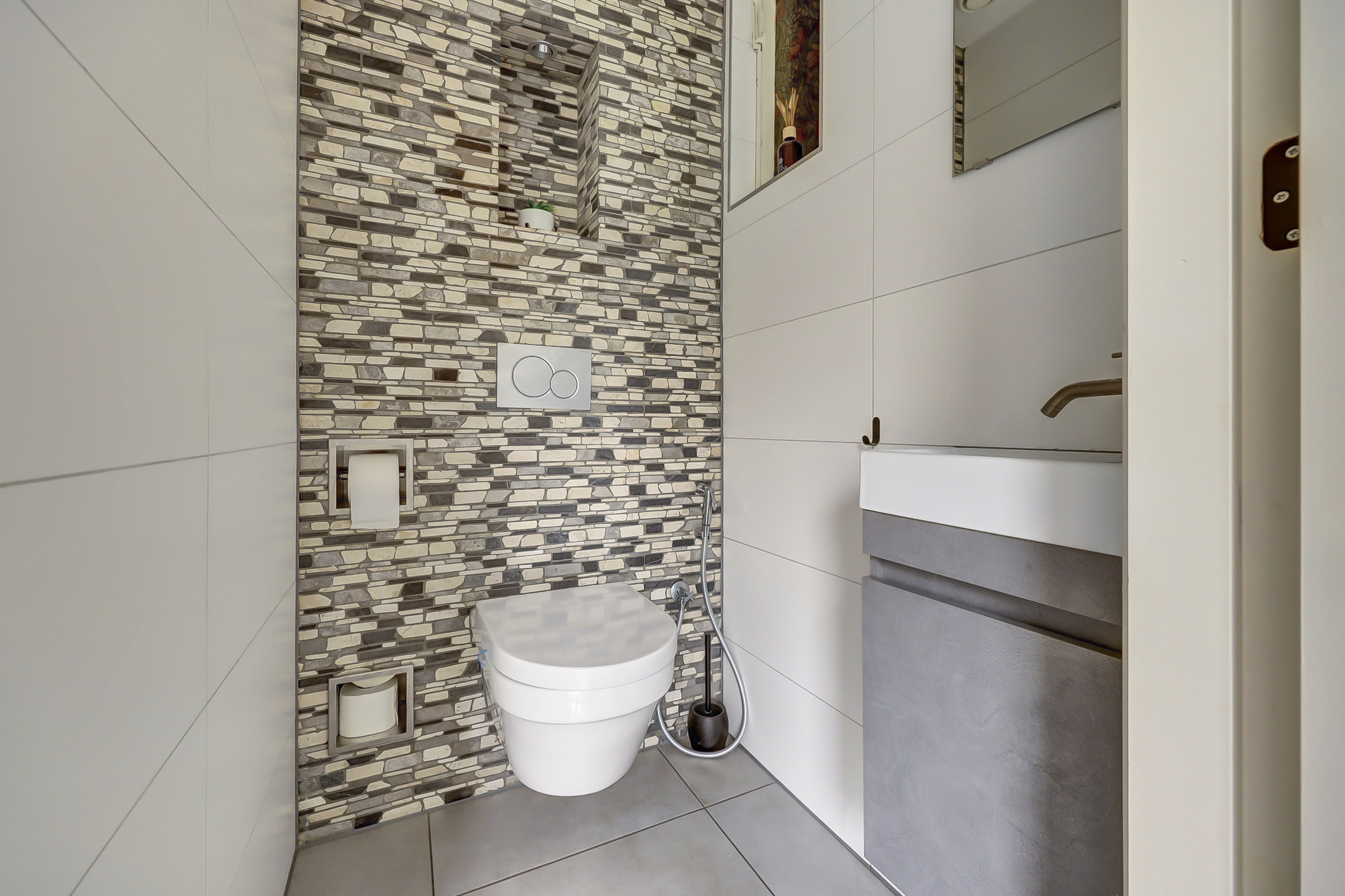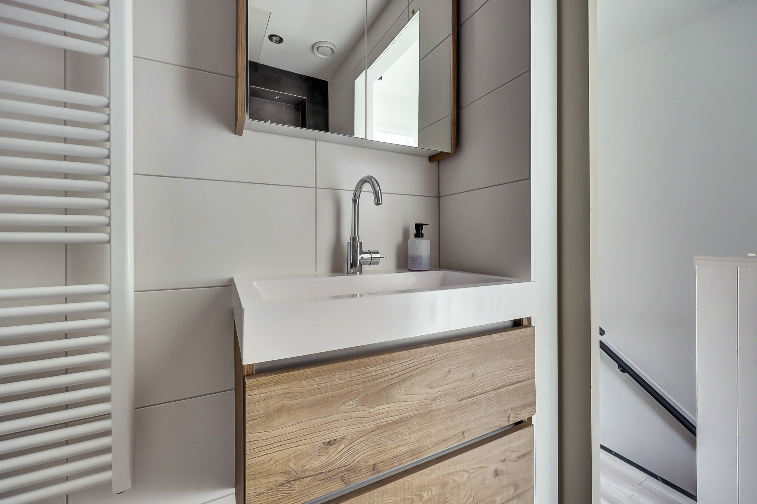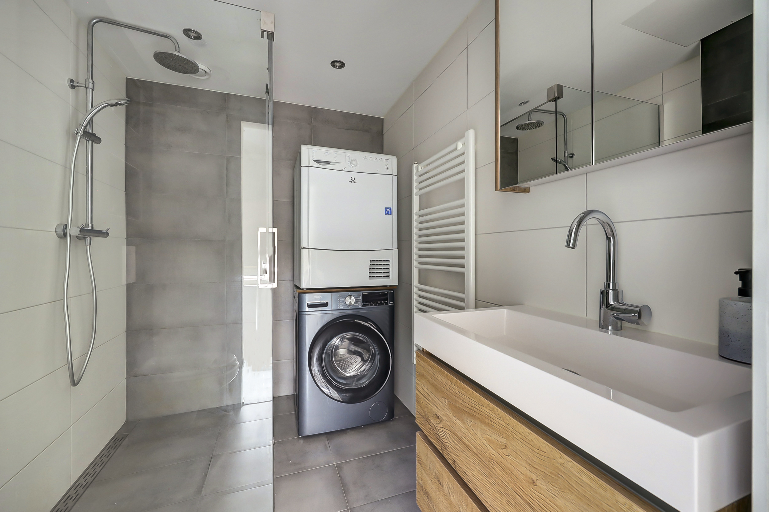De vergrote badkamer (ca. 4 m²) beschikt over een vrijhangend 2e toilet, douchecabine met regendouche, wastafel met meubel, ingebouwde verlichting, de opstelling van de wasmachine en droger, design radiator en mechanische ventilatie.