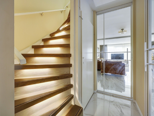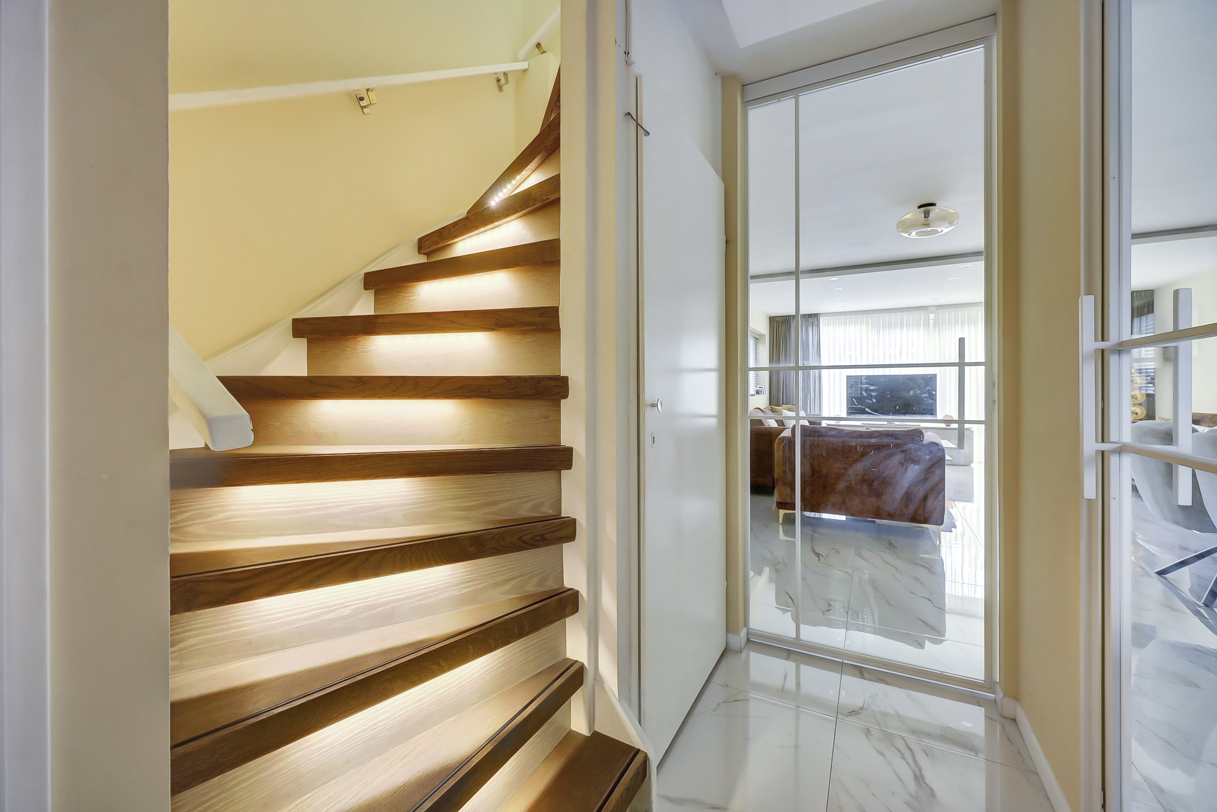 Hal/entree met vernieuwd toilet (2023) met zwevend closet, uitgebreide meterkast (16 groepen met slimme meters), marmerlook plavuizen (vloerverwarming), licht gesausde wandafwerking, de trapopgang en luxe stalendeuren naar de keuken en woonkamer. Onder de trap is een handige voorraadkast aanwezig.