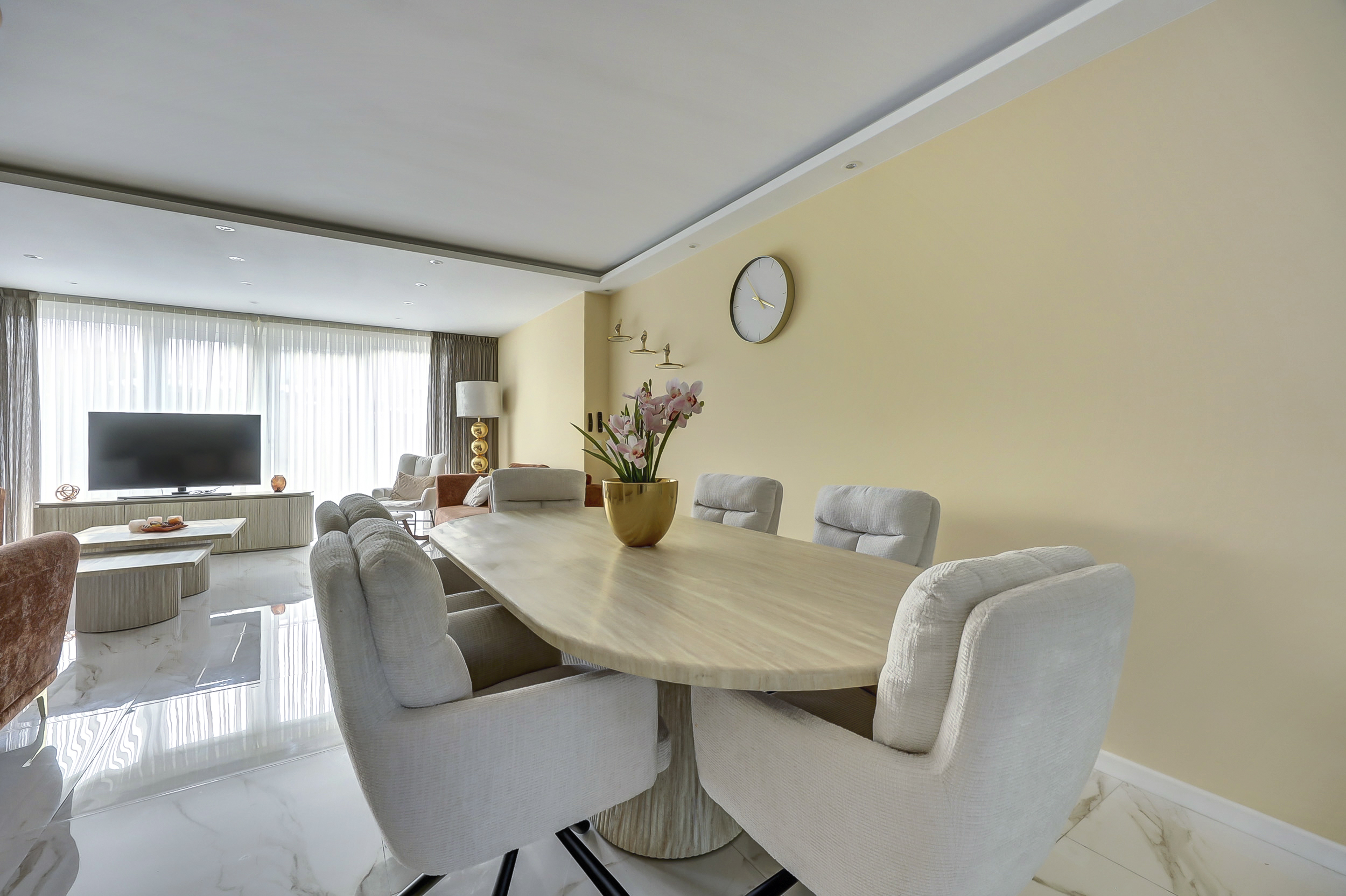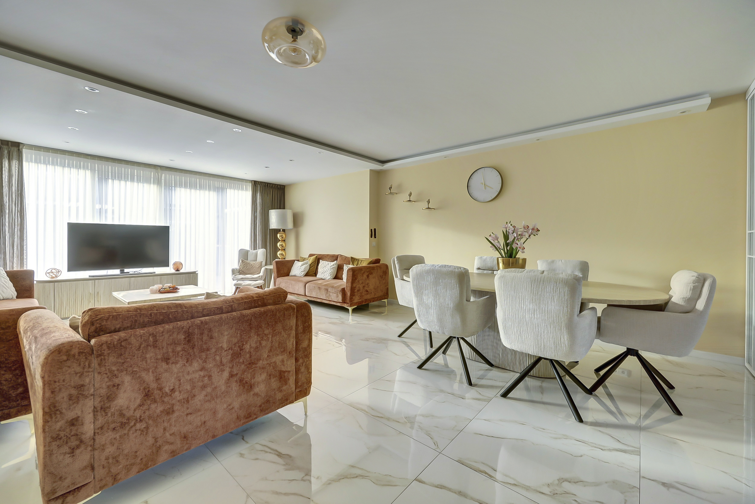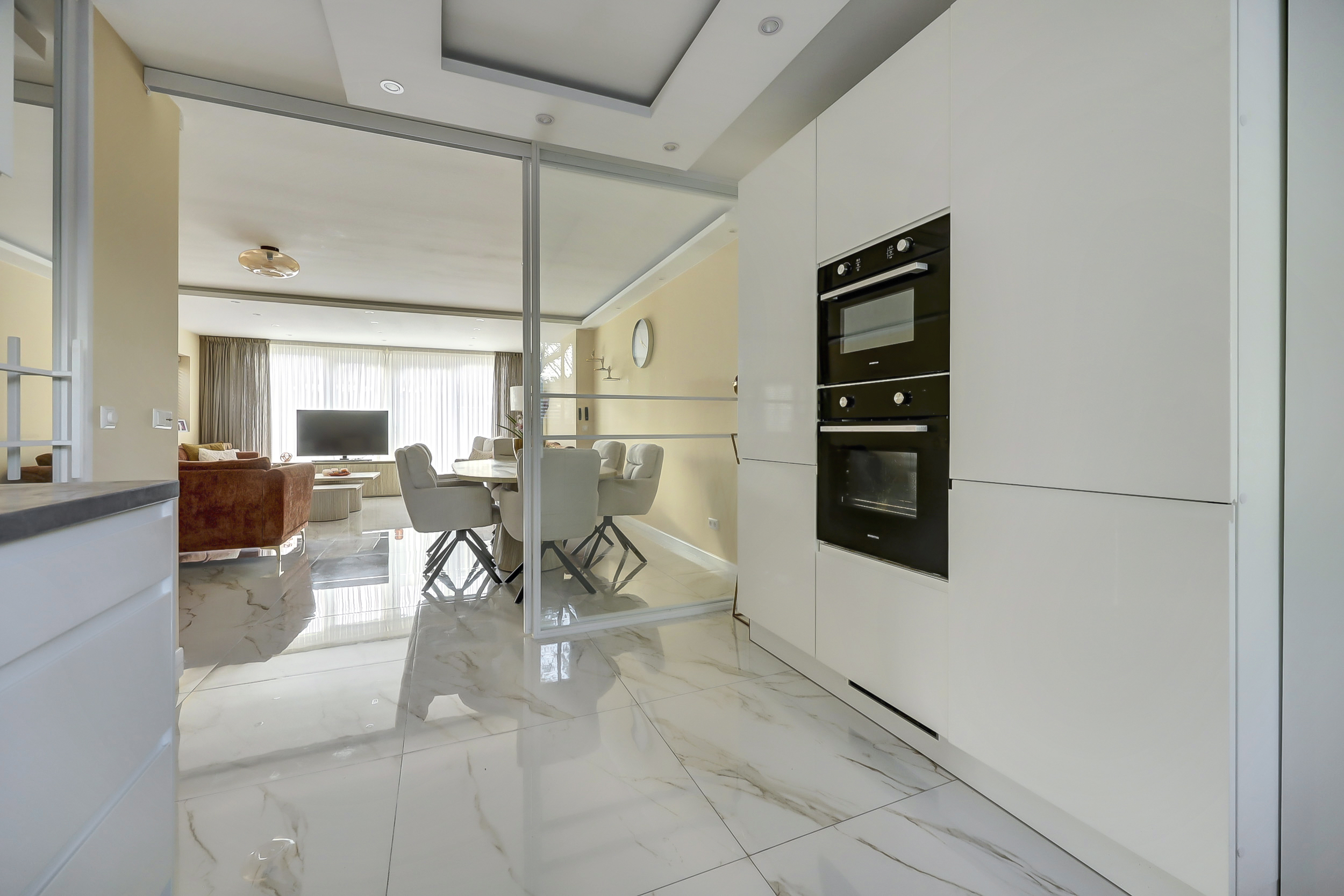 De tuingerichte en uitgebouwde woonkamer van ca. 36 m², is voorzien van marmerlook plavuizen met vloerverwarming (hoofdverwarming), ingebouwde verlichting, licht gestucte en gesausde wanden, openslaande tuindeuren en een fijn zijraam waardoor de living over meer dan voldoende lichtinval beschikt. Via een stalen schuifdeur is er verbinding naar de schitterende keuken aan de voorzijde van de woning.