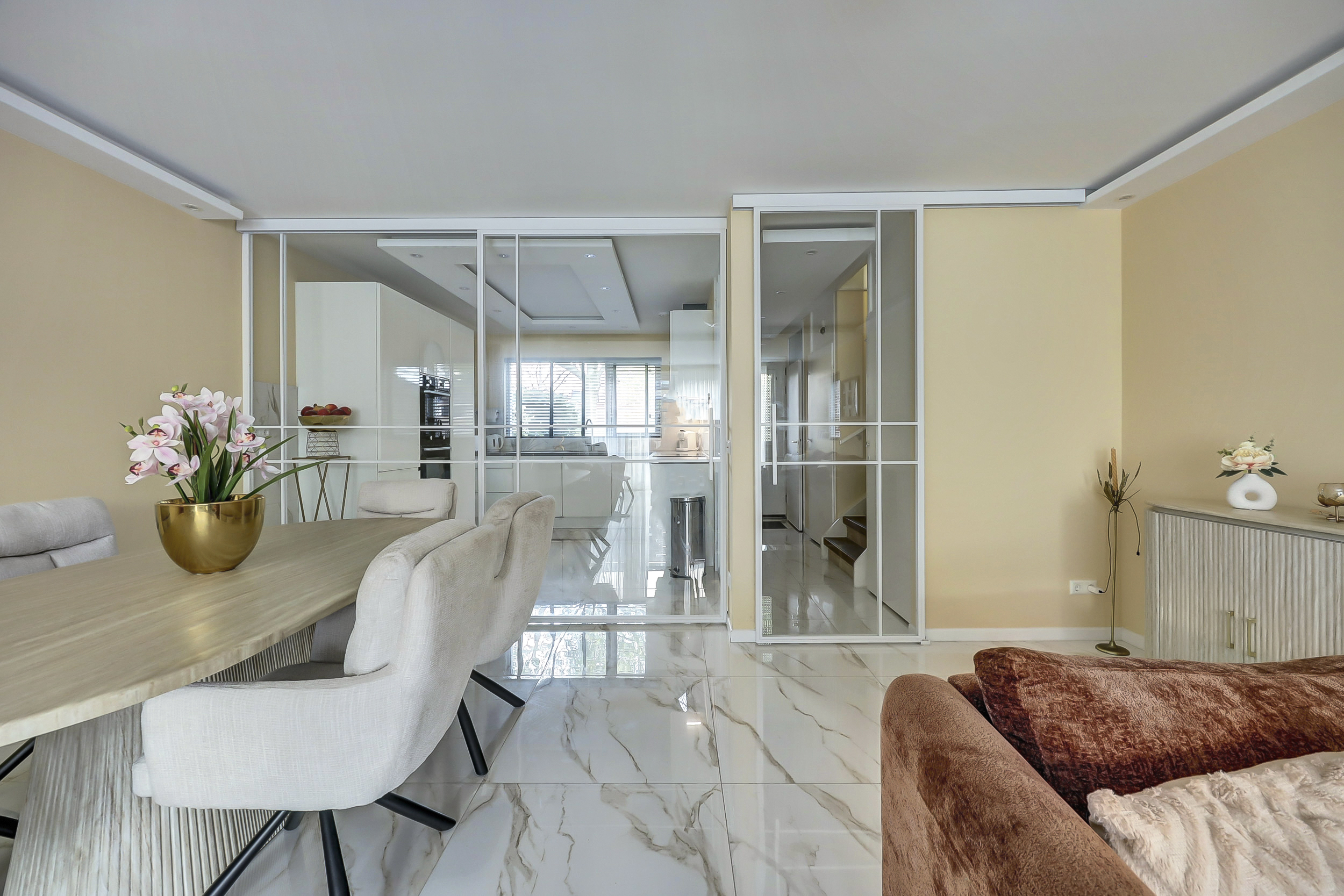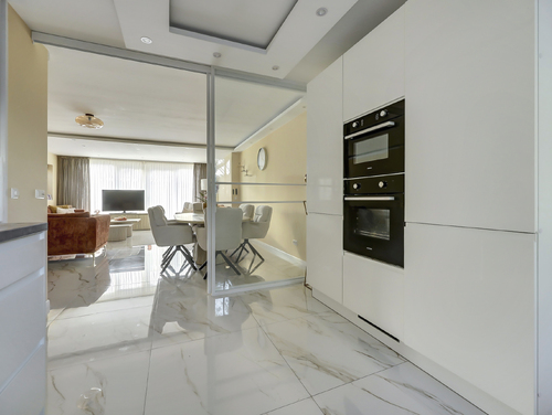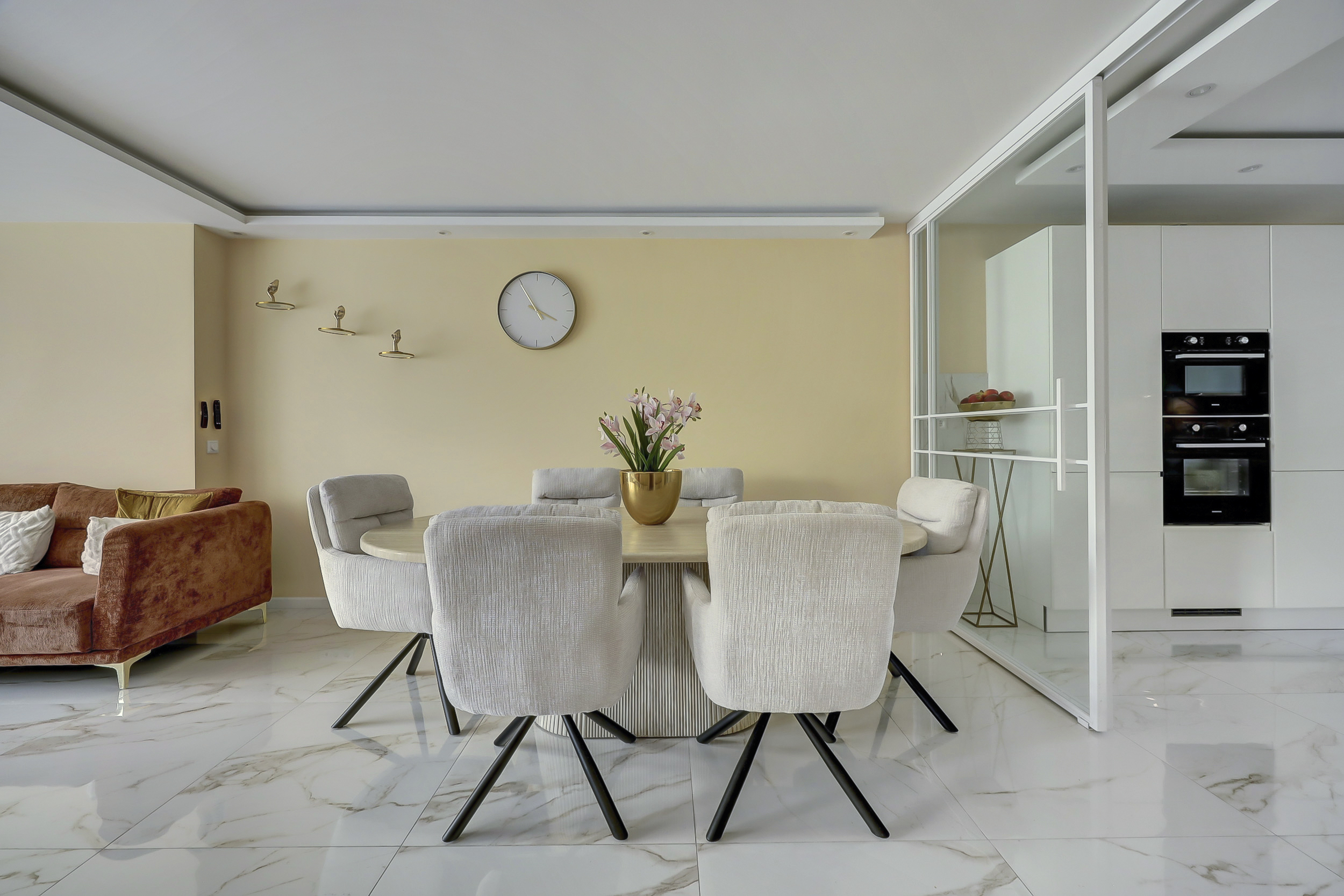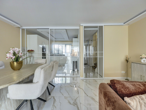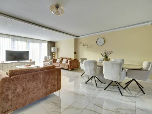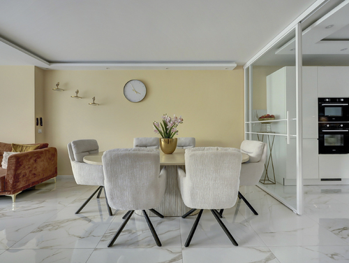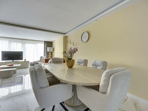 De tuingerichte en uitgebouwde woonkamer van ca. 36 m², is voorzien van marmerlook plavuizen met vloerverwarming (hoofdverwarming), ingebouwde verlichting, licht gestucte en gesausde wanden, openslaande tuindeuren en een fijn zijraam waardoor de living over meer dan voldoende lichtinval beschikt. Via een stalen schuifdeur is er verbinding naar de schitterende keuken aan de voorzijde van de woning.