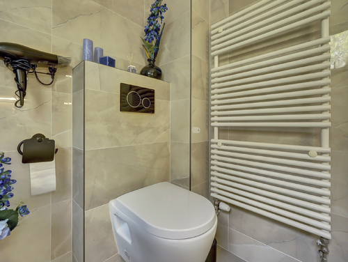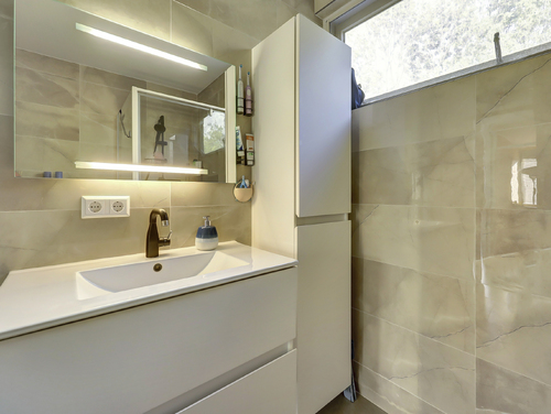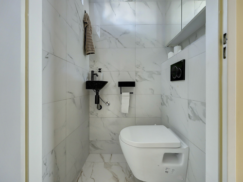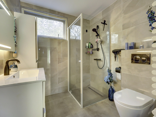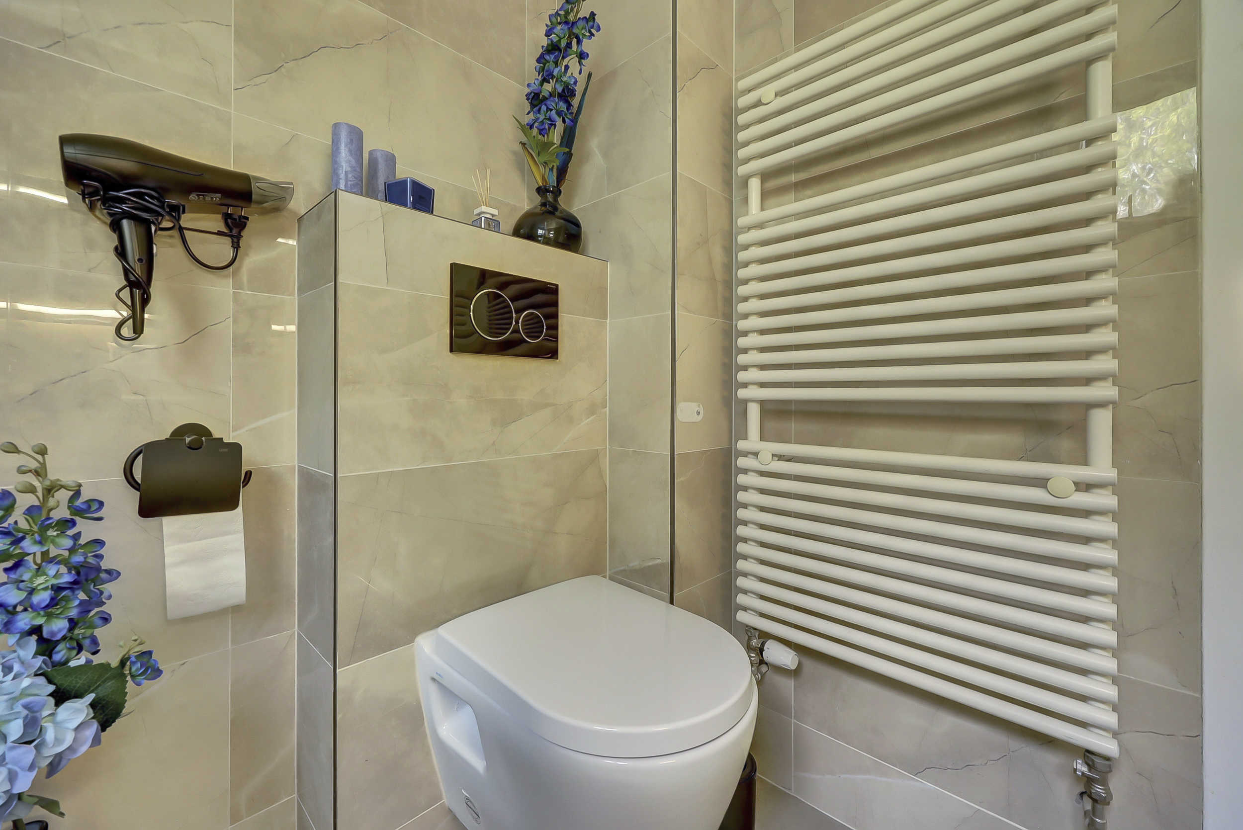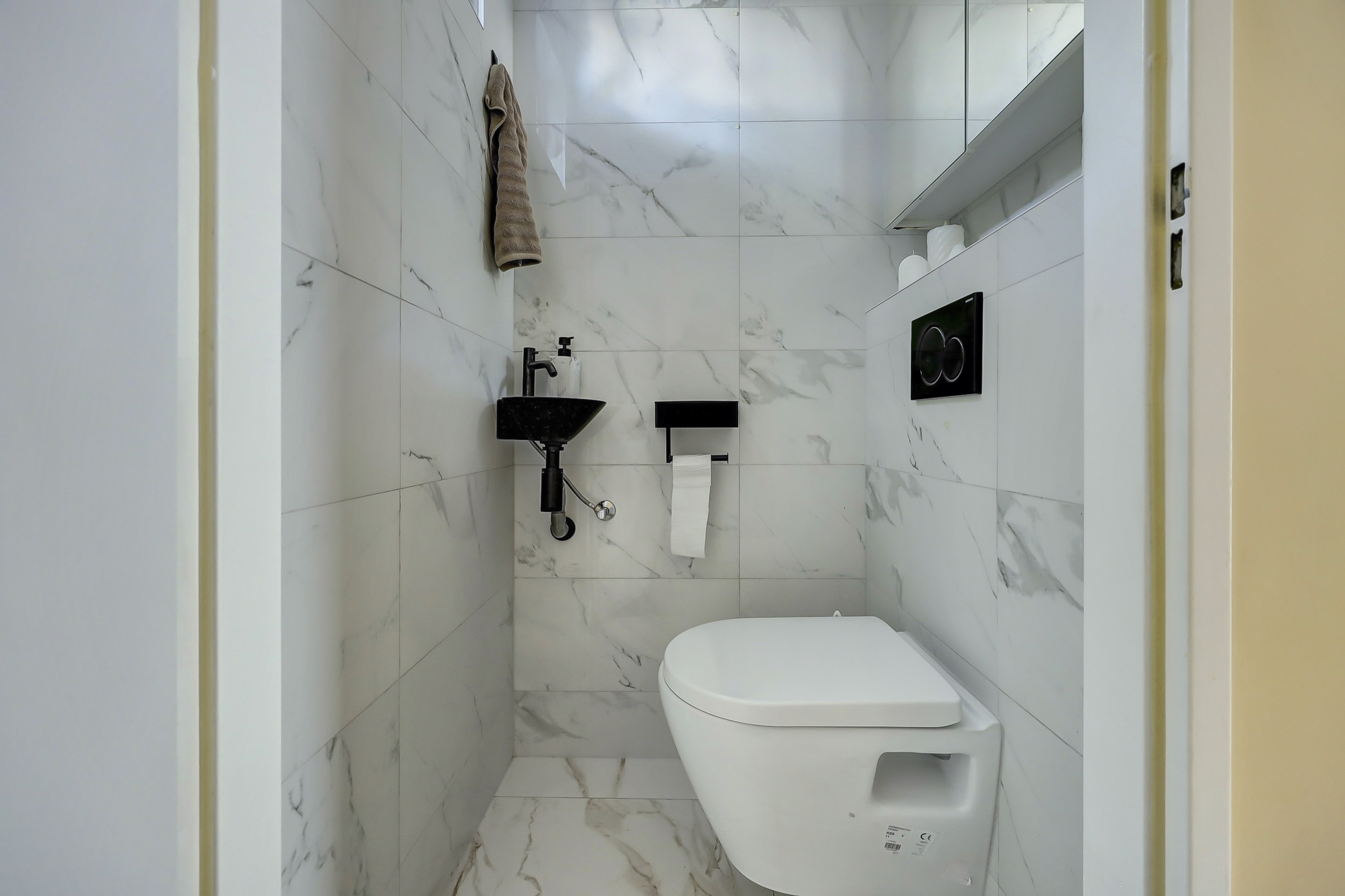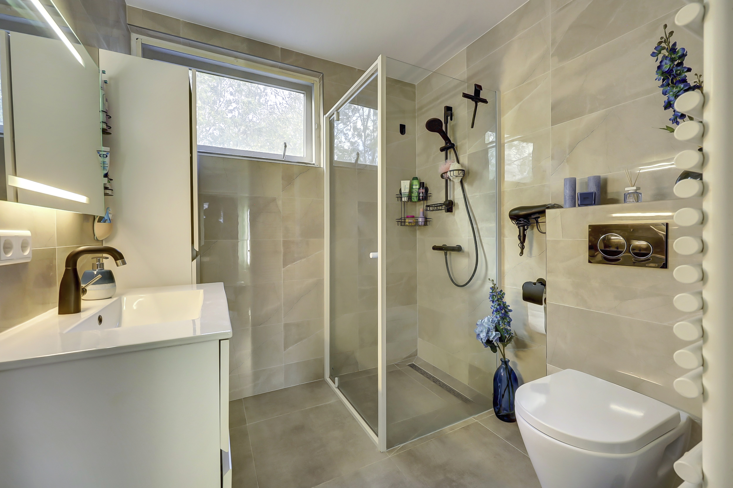 De in 2023 gemoderniseerde badkamer (ca. 4 m²) is voorzien van douchecabine, 2e toilet (hangcloset), design radiator, vloerverwarming en een wastafel met meubel. Deze ruimte beschikt over een uitzetraam en wordt ook mechanisch geventileerd.
