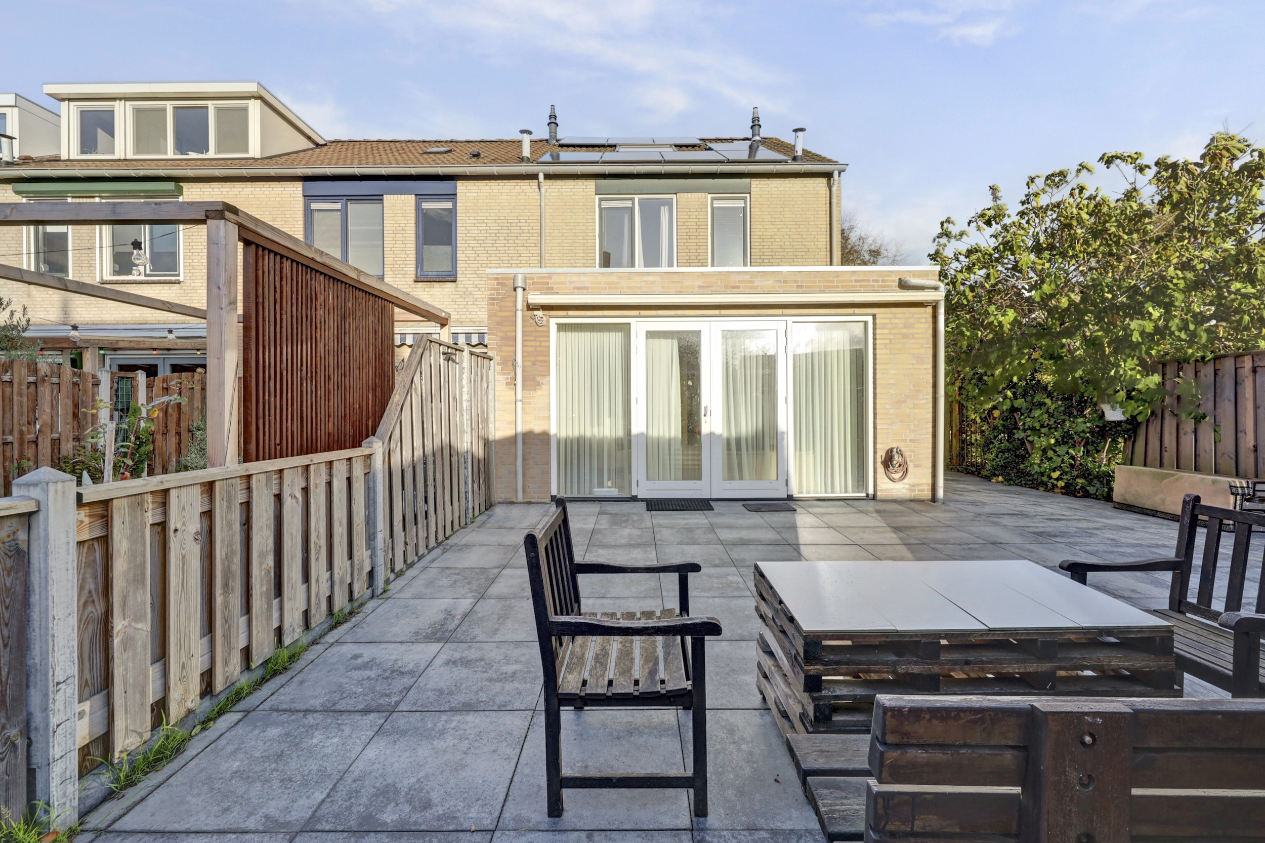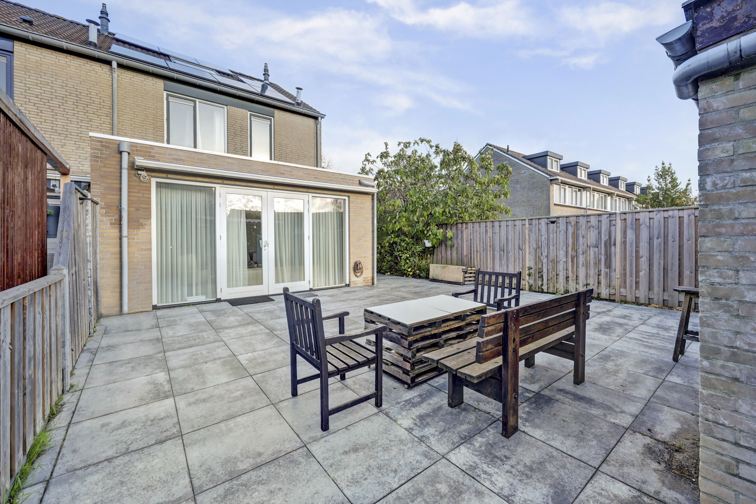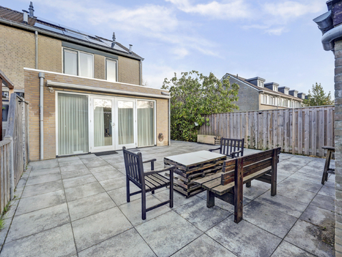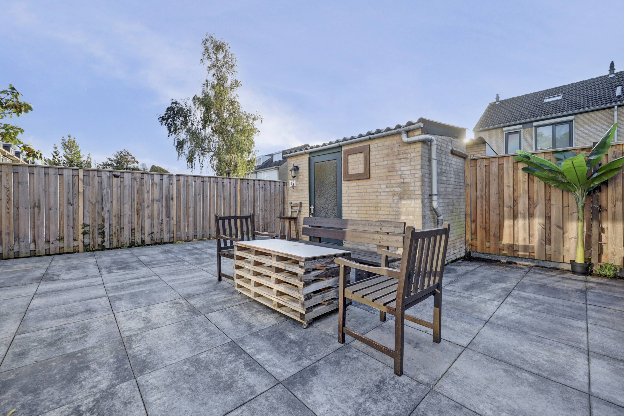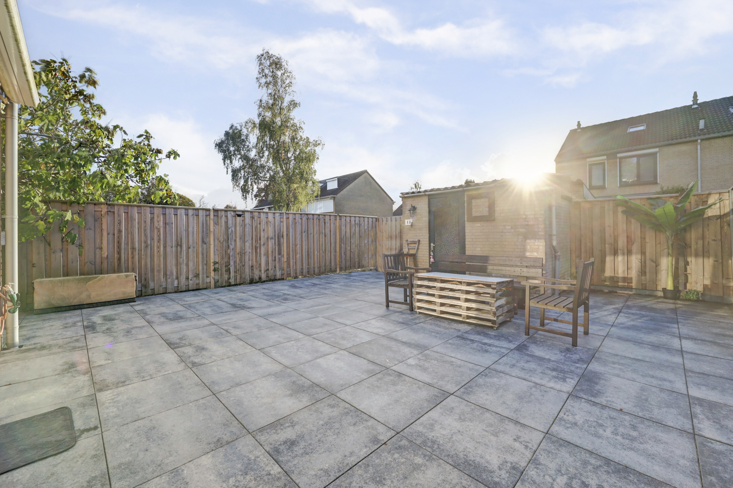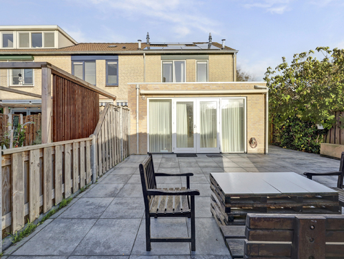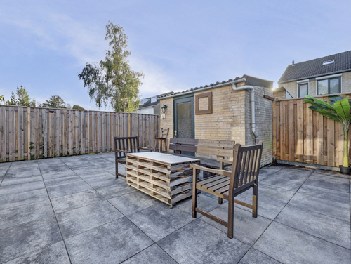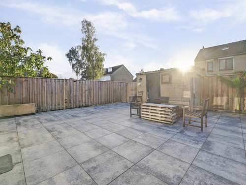De fraai aangelegde achtertuin is volledig bestraat en op het zonnige zuidwesten gelegen, geheel omheind, achterom bereikbaar en heeft een stenen berging met elektra. Hier kun je echt buiten zitten en heerlijk van de zon genieten! En wil je wat meer schaduw, dan is er een elektrisch zonnescherm.