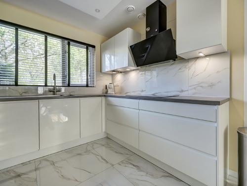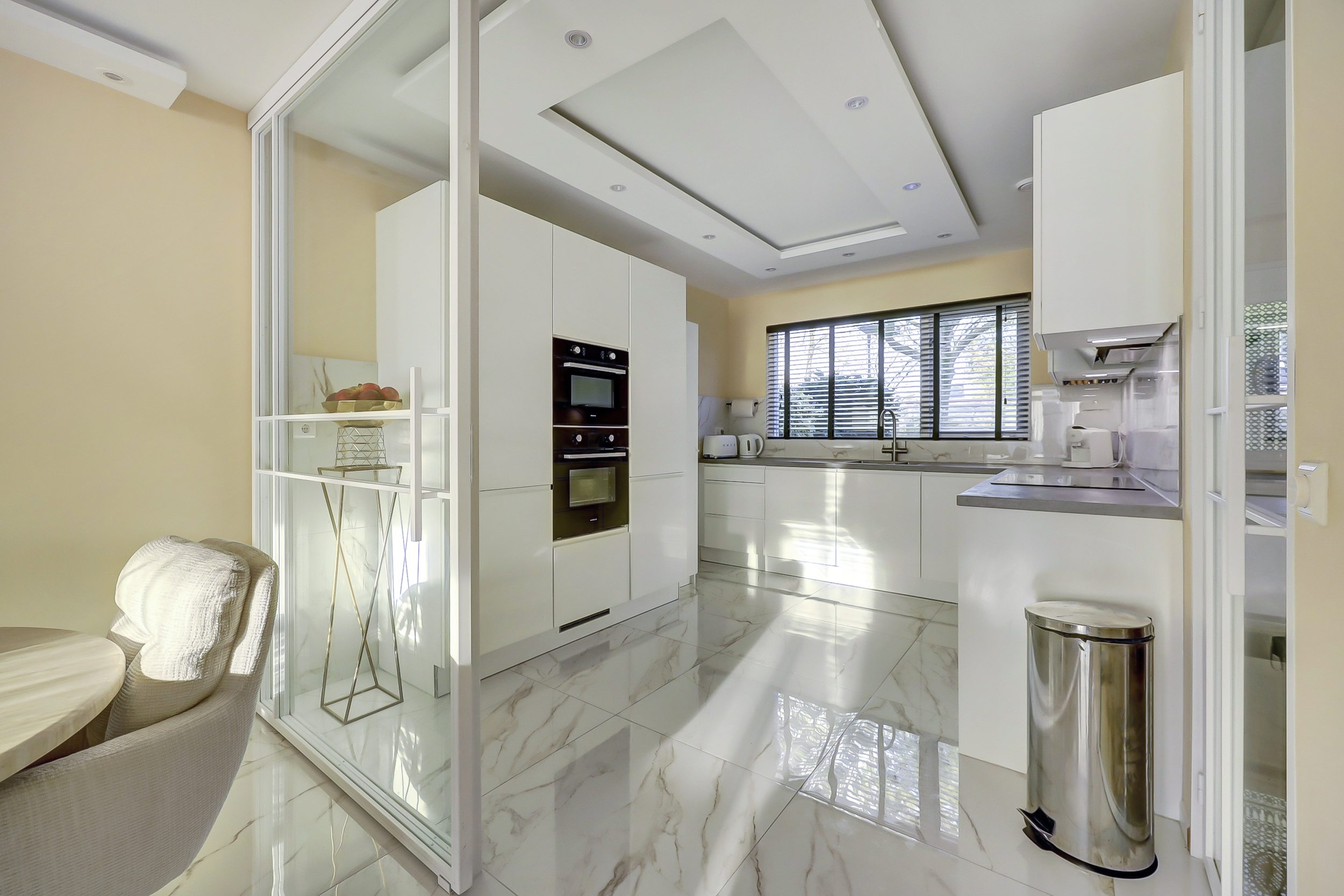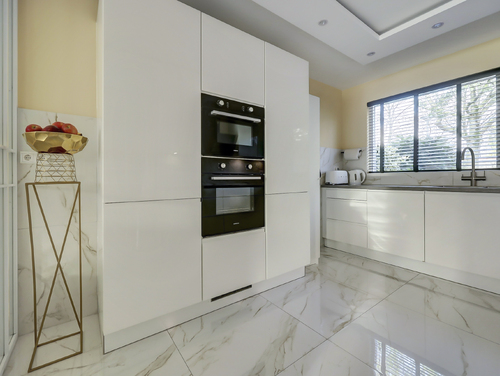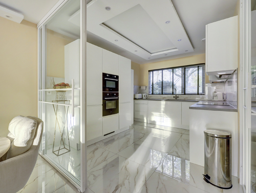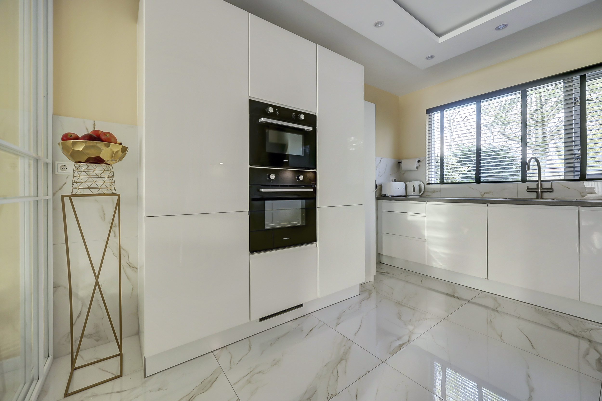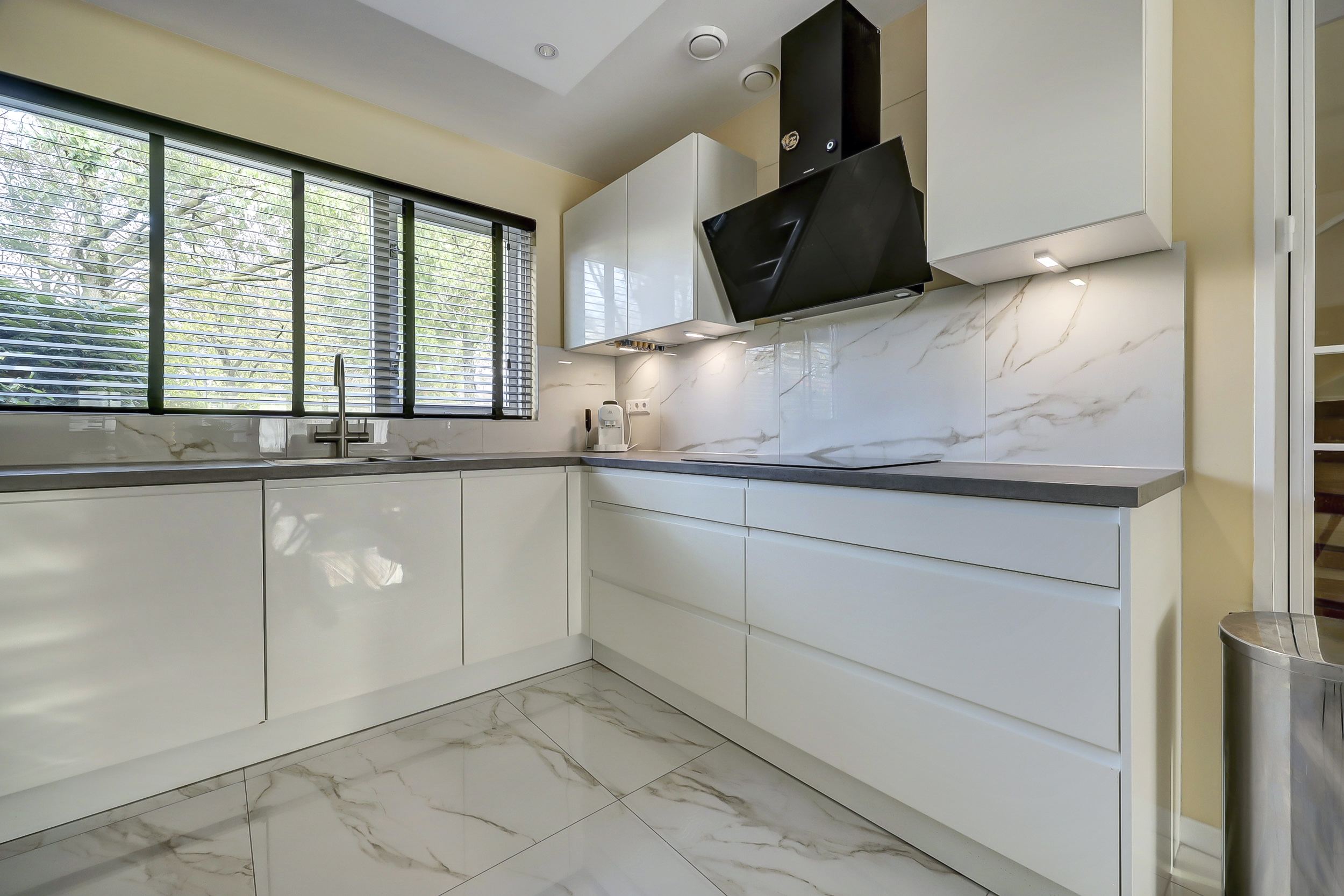 De in 2023 geplaatste moderne keuken (ca. 11 m²) is eveneens uitgerust marmerlook plavuizen (vloerverwarming) en ingebouwde verlichting en diverse apparatuur zoals een grote koelkast, grote vriezer, combimagnetron, heteluchtoven, vaatwasser, inductiekookplaat, afzuigschouw en een kokendwaterkraan.