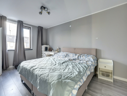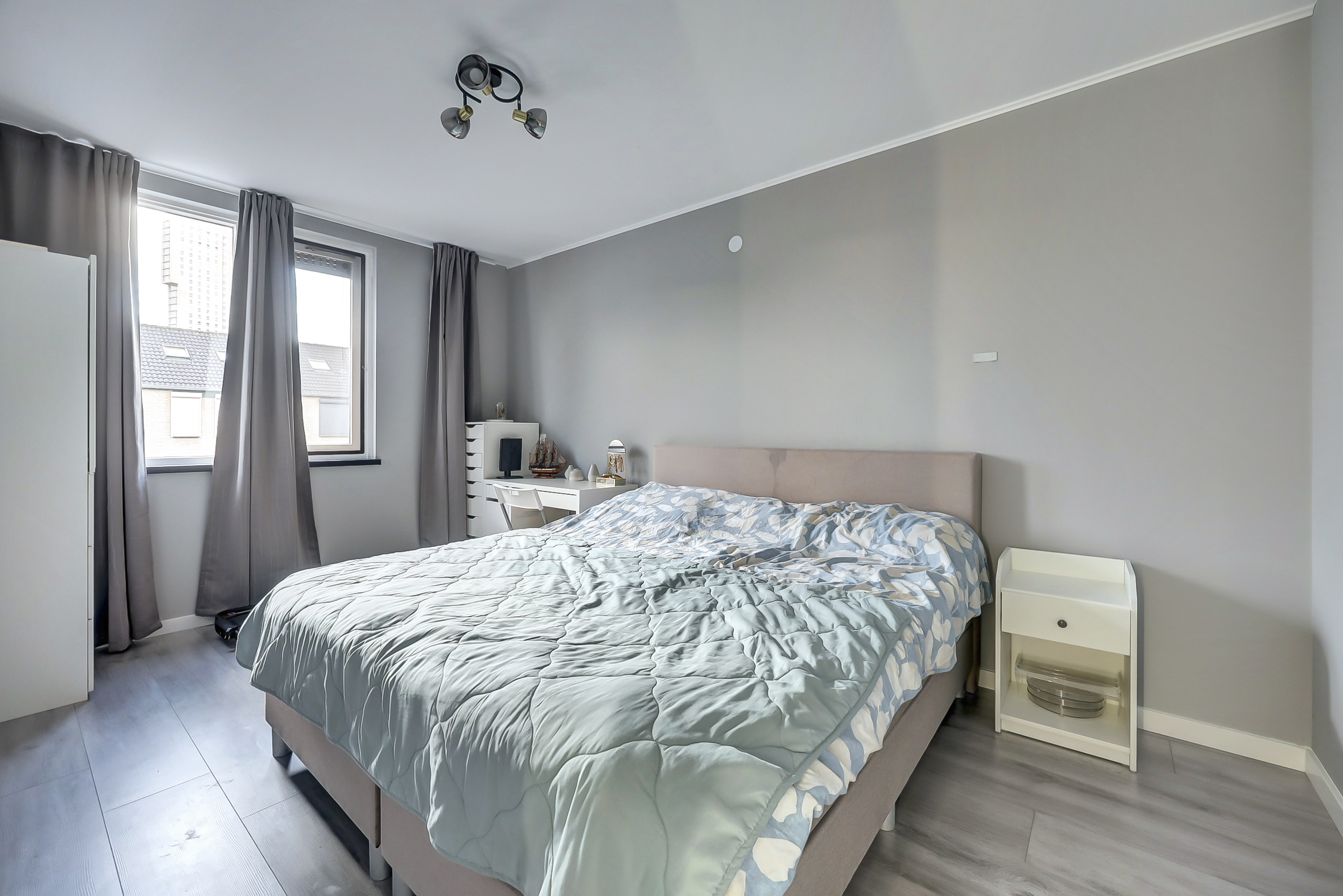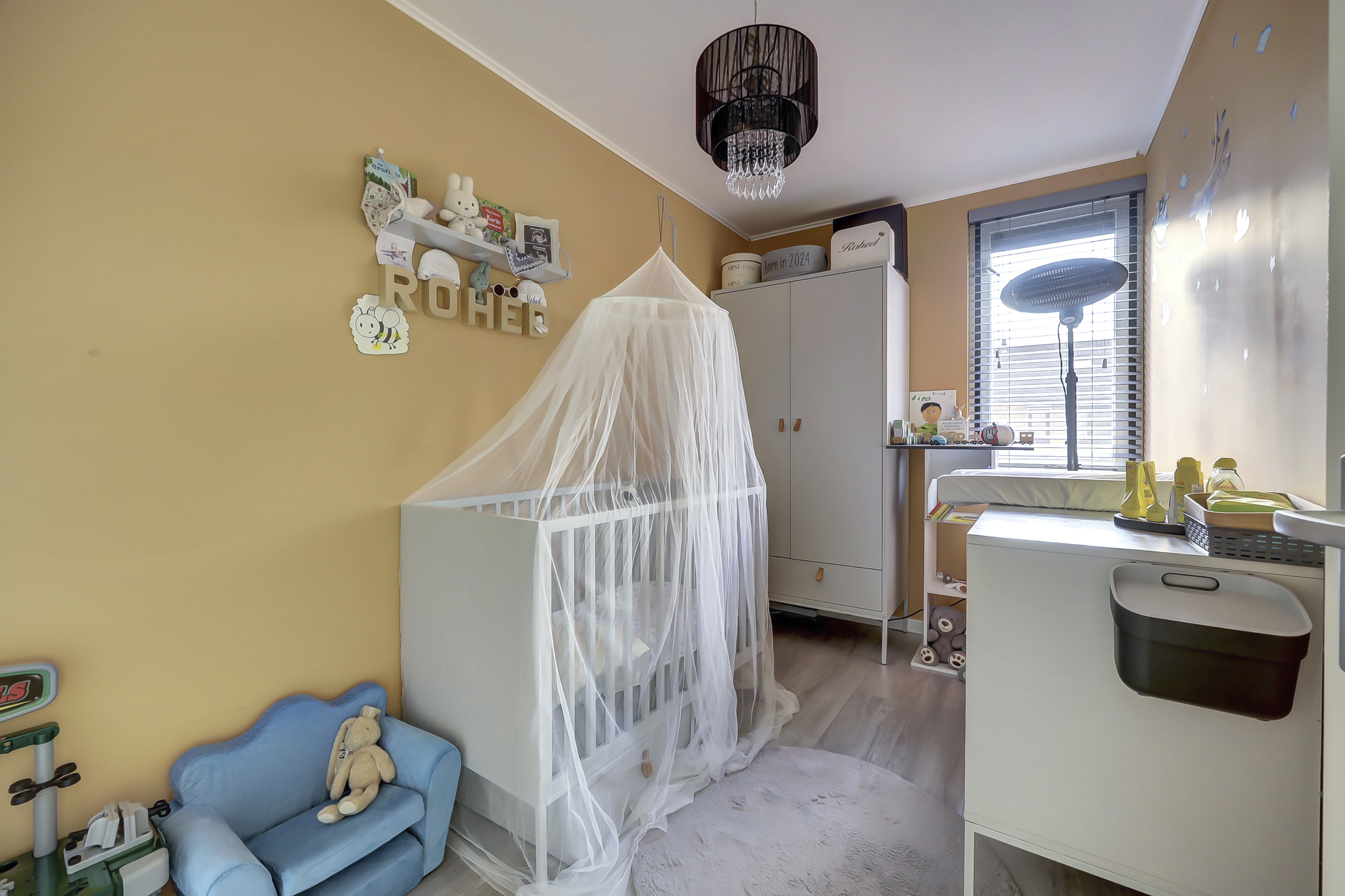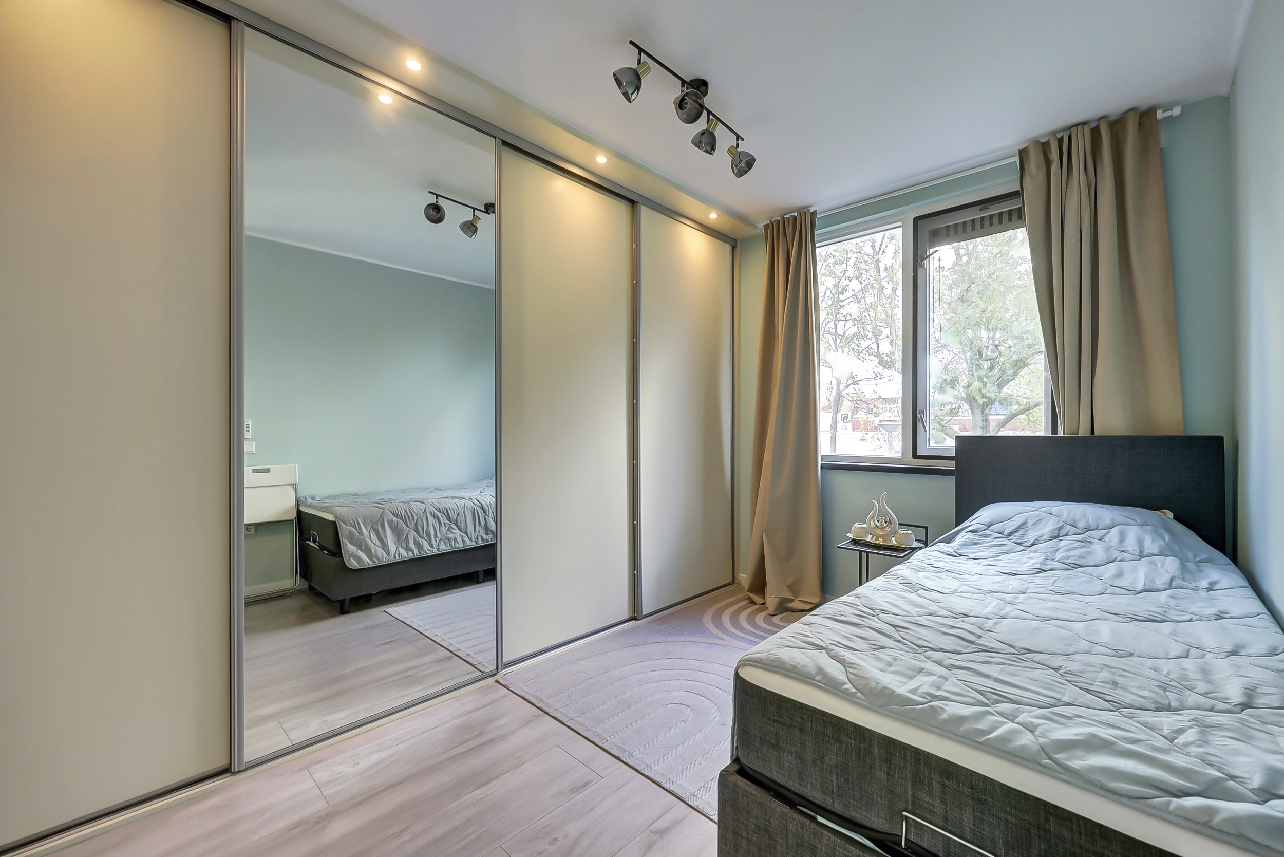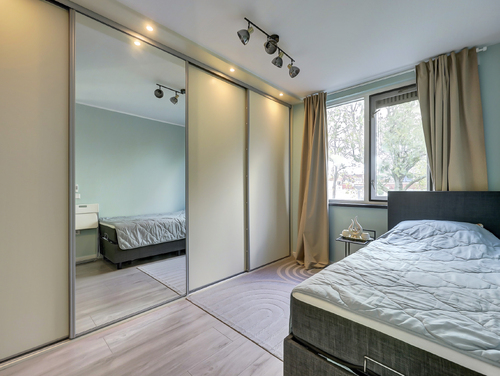 De slaapkamer aan de voorzijde van ca. 13 m² is voorzien van een royale schuifkastenwand met ingebouwde verlichting.
