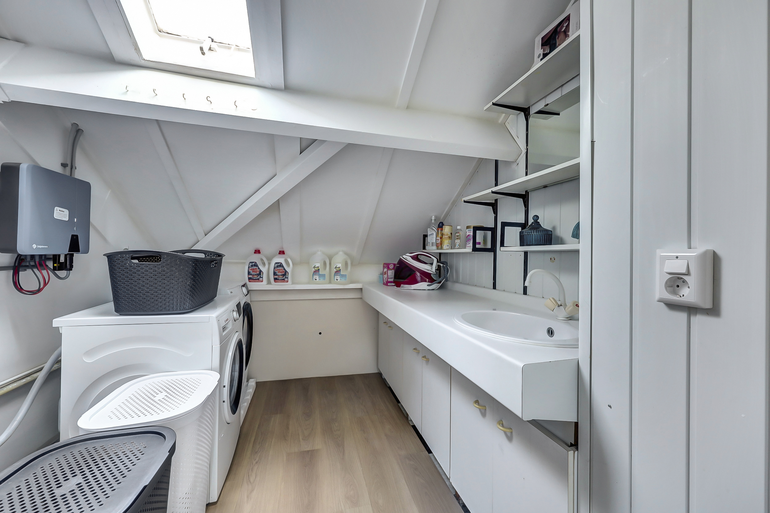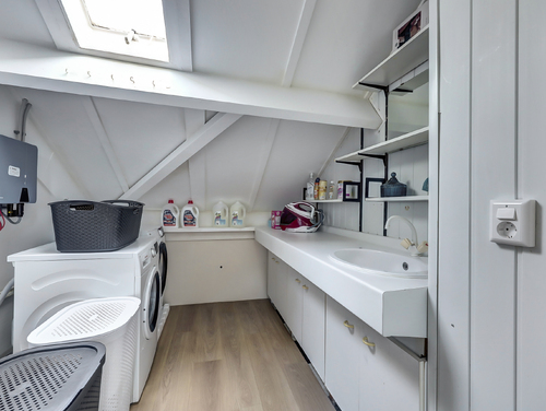 Op de overloop tref je de aansluitingen voor de droger en wasmachine, de CV-combiketel (Vaillant, 2013) en de unit van de mechanische ventilatie en de zolderkamer.