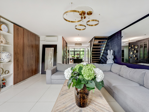 De lichte woonkamer van ca. 35 m², is uitgerust met een plavuizenvloer met vloerverwarming, airconditioning (Panasonic), gesausde wandafwering en voorzien van een trapopgang naar de slaapverdieping.
