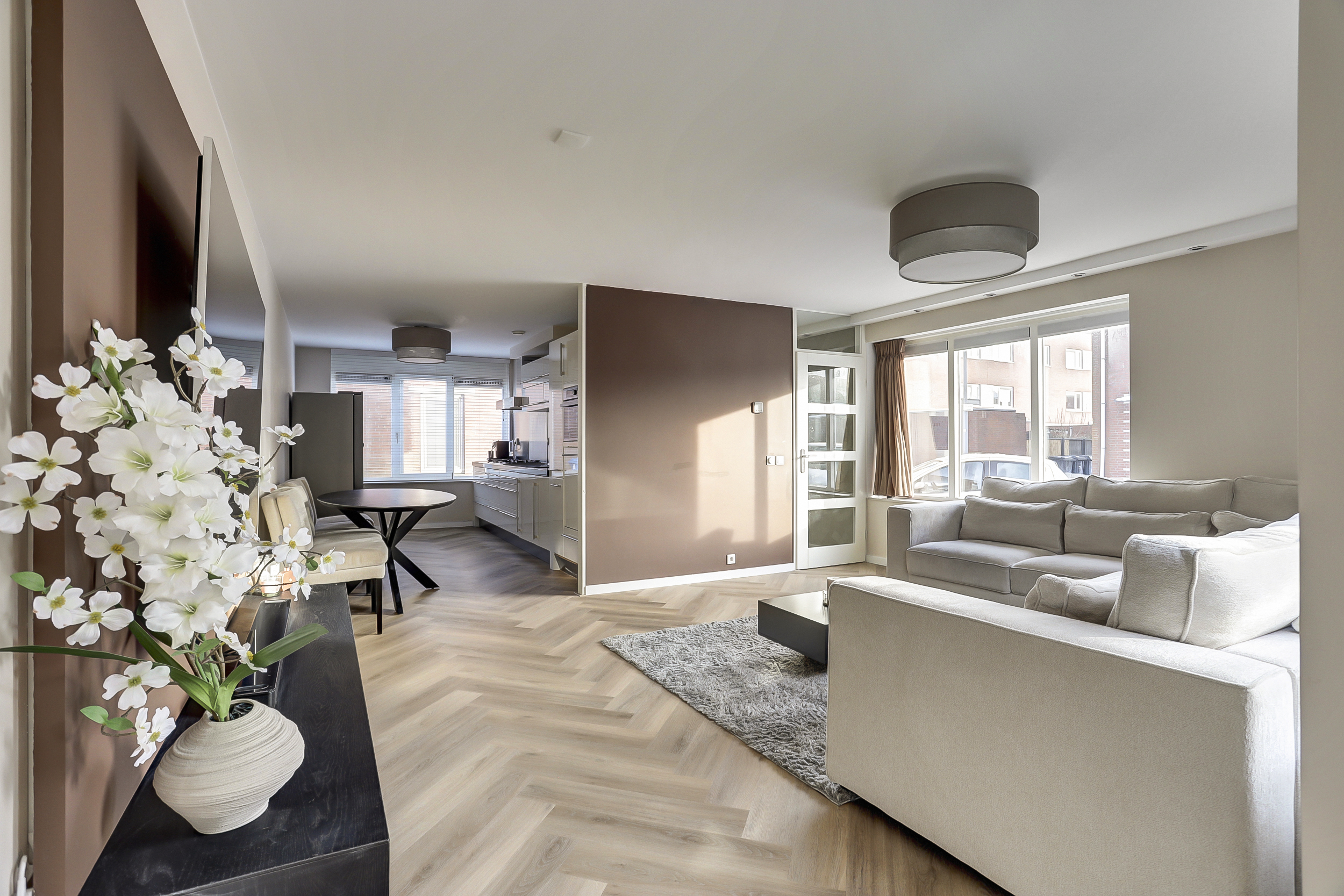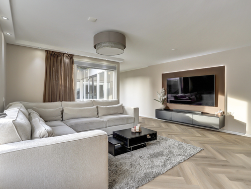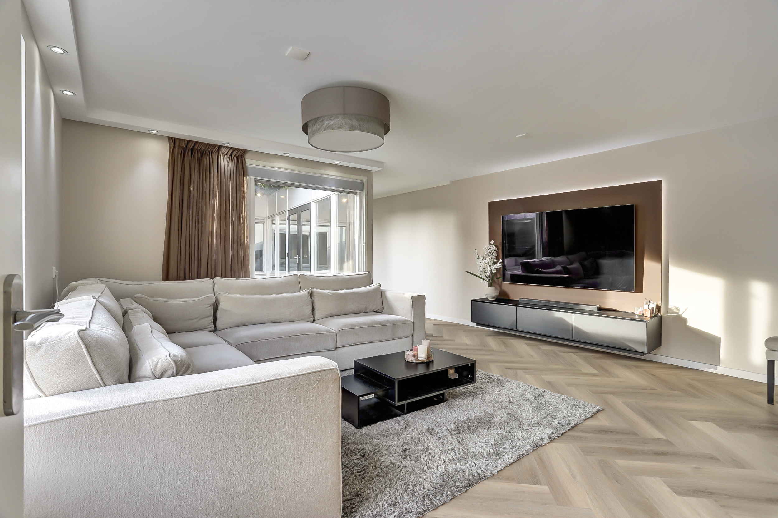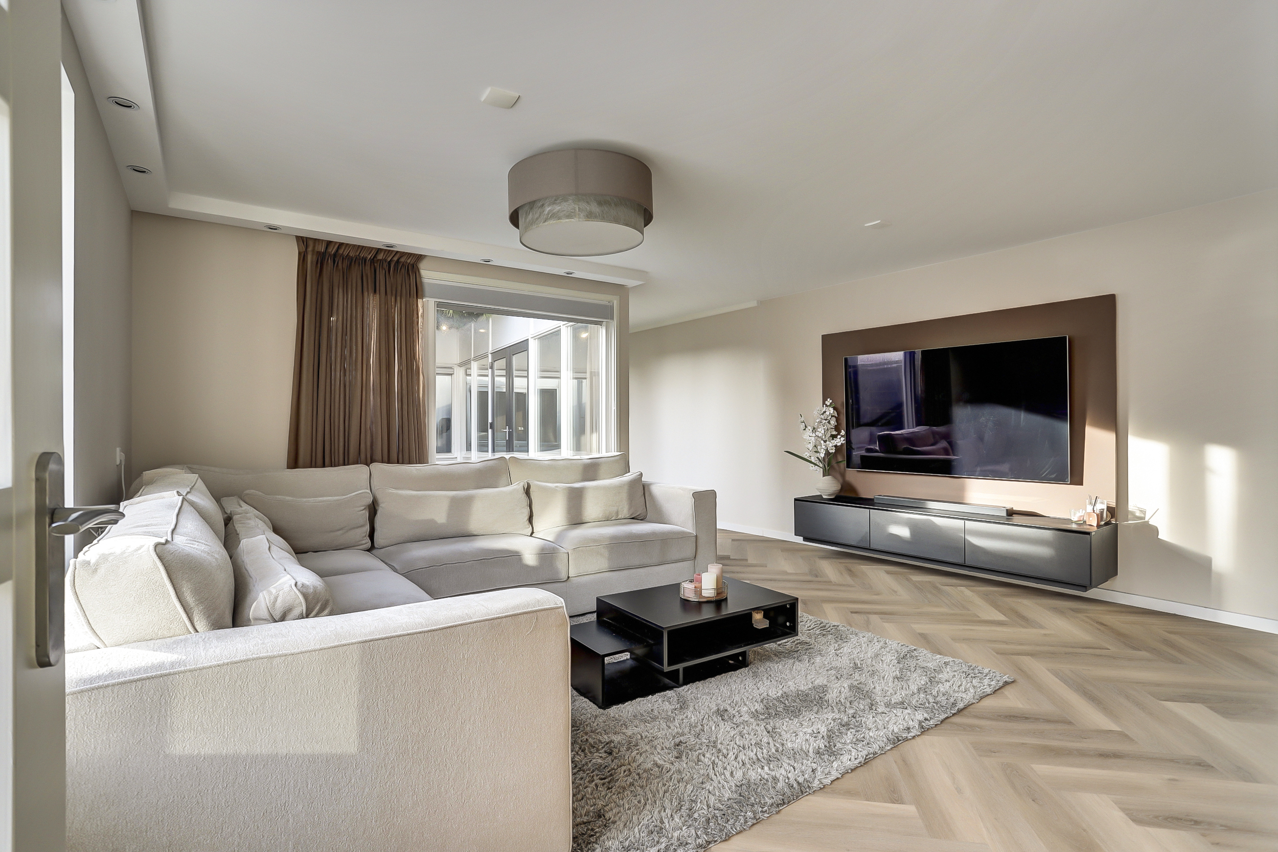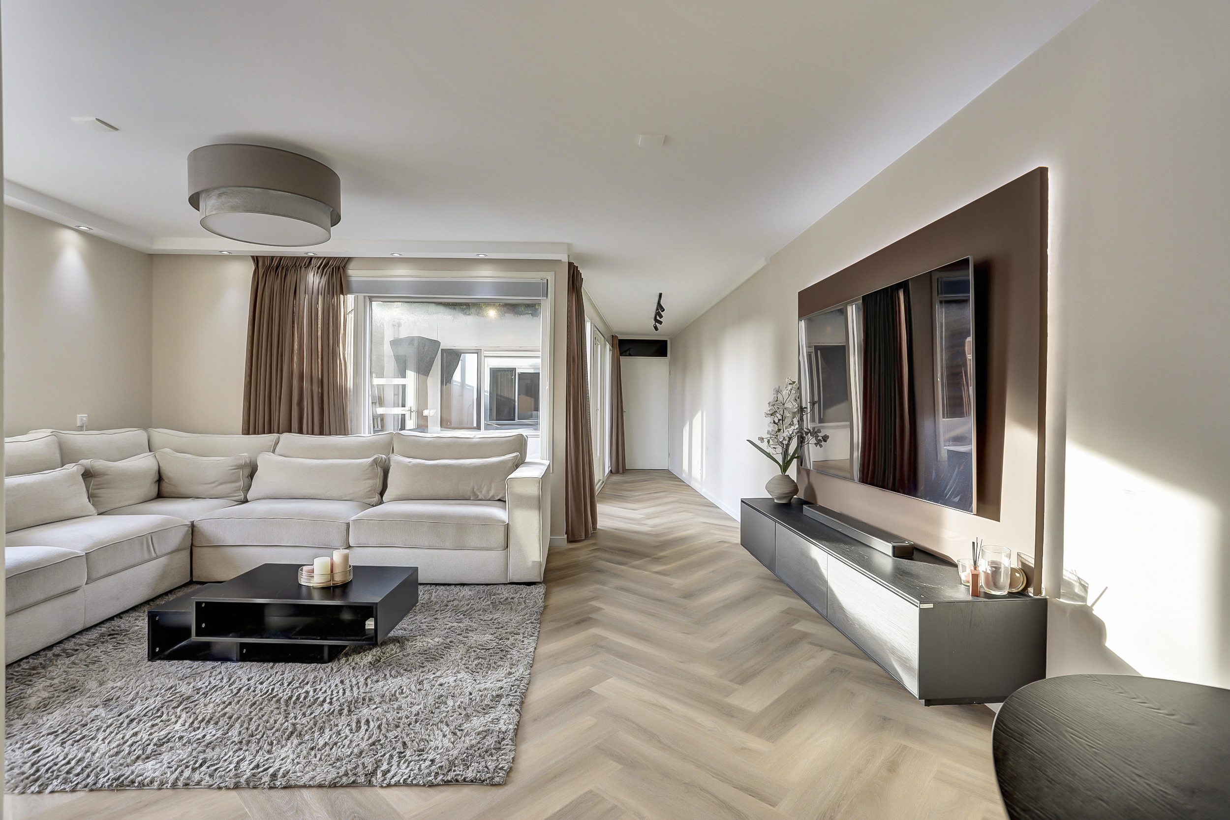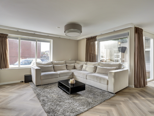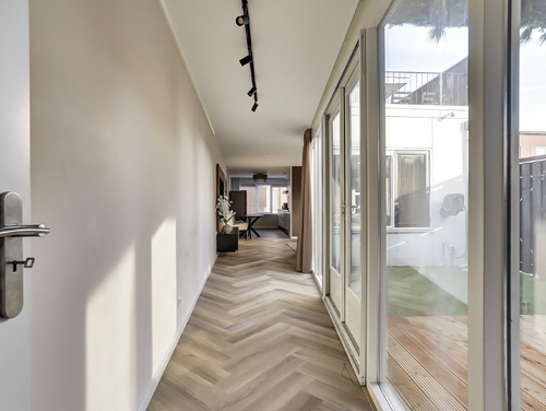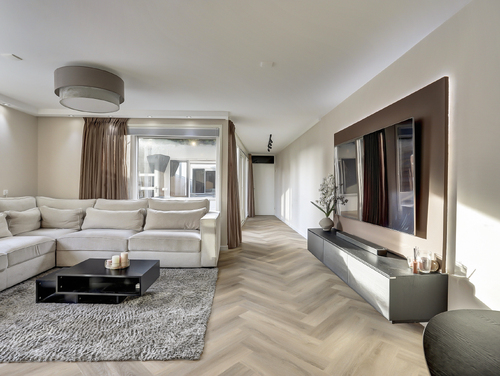 De sfeervol ingerichte woonkamer van ca. 25 m², beschikt over een goede lichtinval vanwege de vele ramen, heeft licht gesausde wanden, ingebouwde (dimbare)verlichting, een pvc-visgraadvloer met vloerverwarming (hoofdverwarming) en biedt een fraai zicht op de aangrenzende patio/tuin.