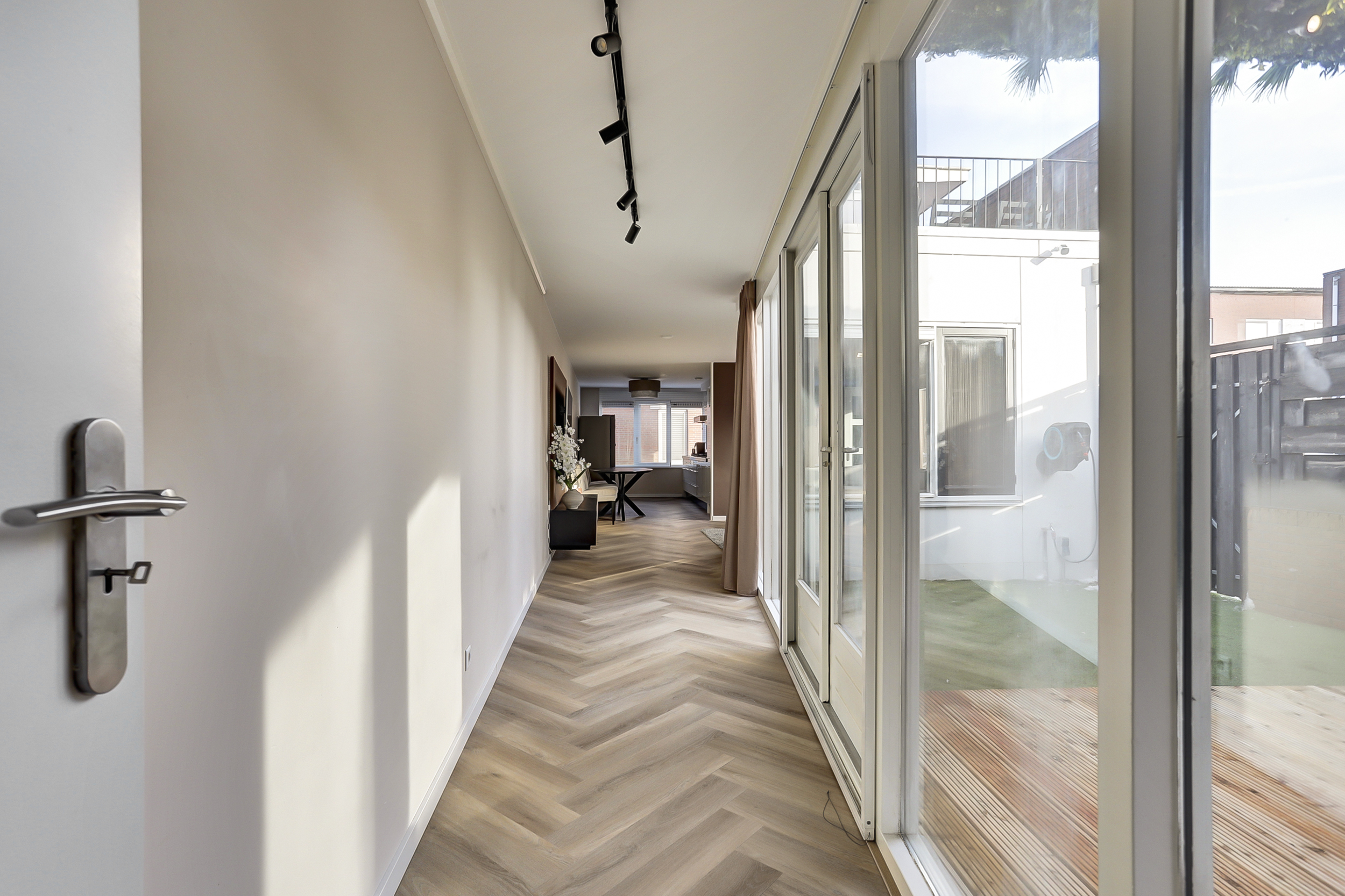 Via een corridor/gang (ca. 6 m²) met openslaande tuindeuren loop je langs de patio/tuin naar het achterste gedeelte van de woning waar zich een ruime slaapkamer bevindt met aansluitend een moderne compleet uitgeruste badkamer.
