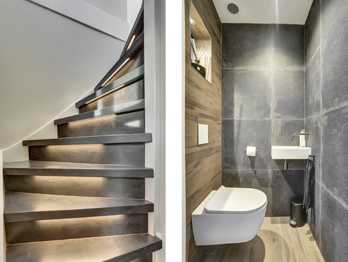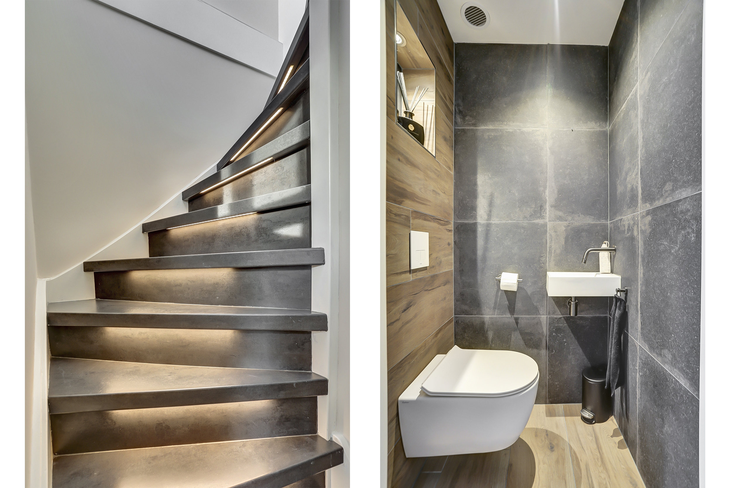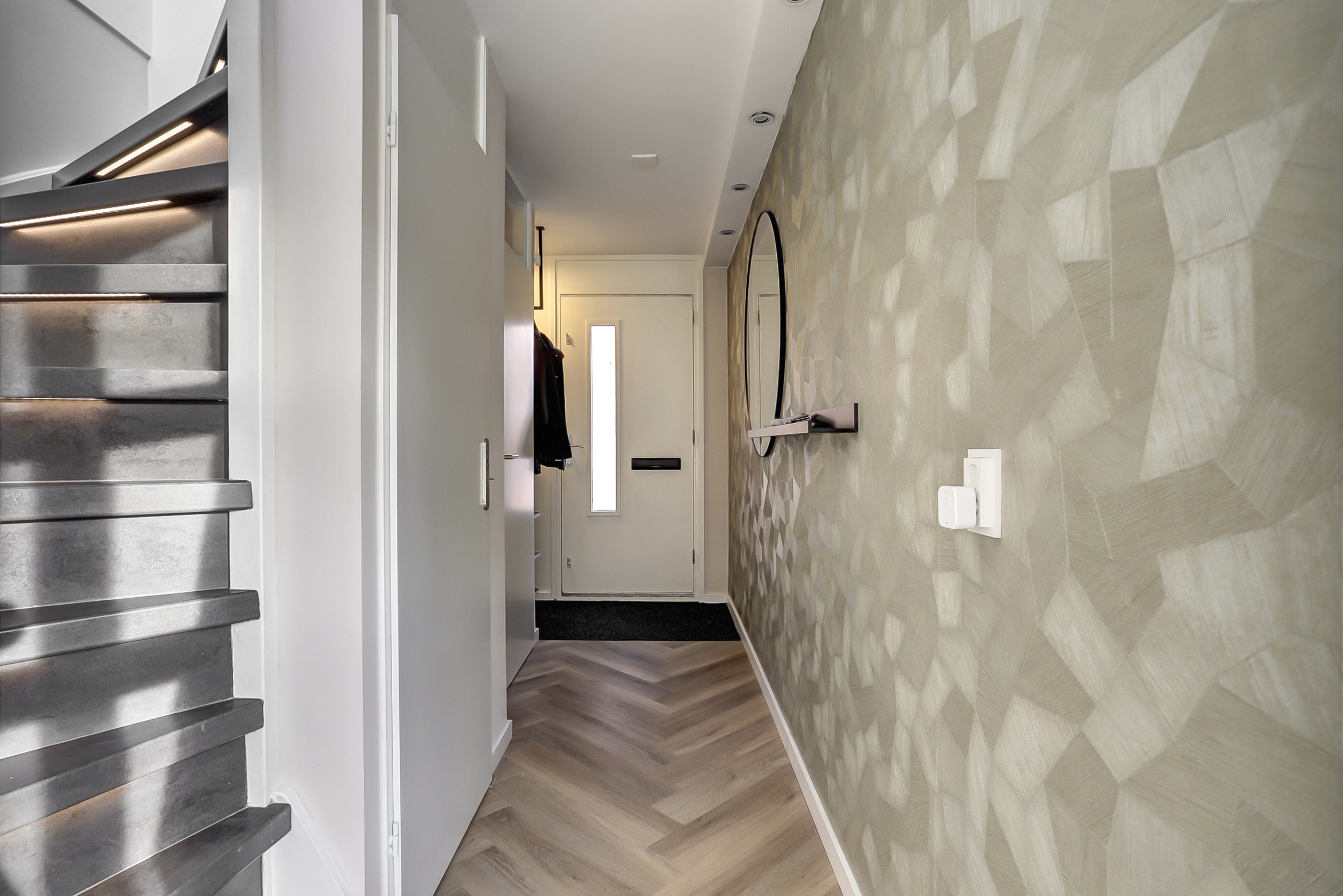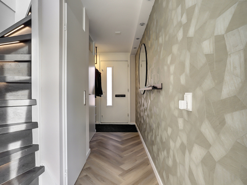 Stijlvolle hal/entree met o.a. pvc-visgraadvloer, meterkast (7 groepen met slimme meters/glasvezel), garderoberuimte, trapopgang, een handige voorraadkast en een modern geheel betegeld toilet (2019) met vloerverwarming, zwevend closet en fonteintje.