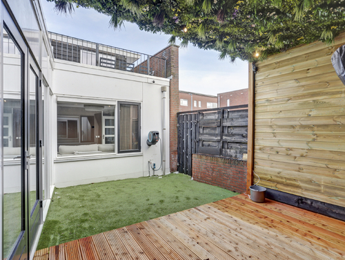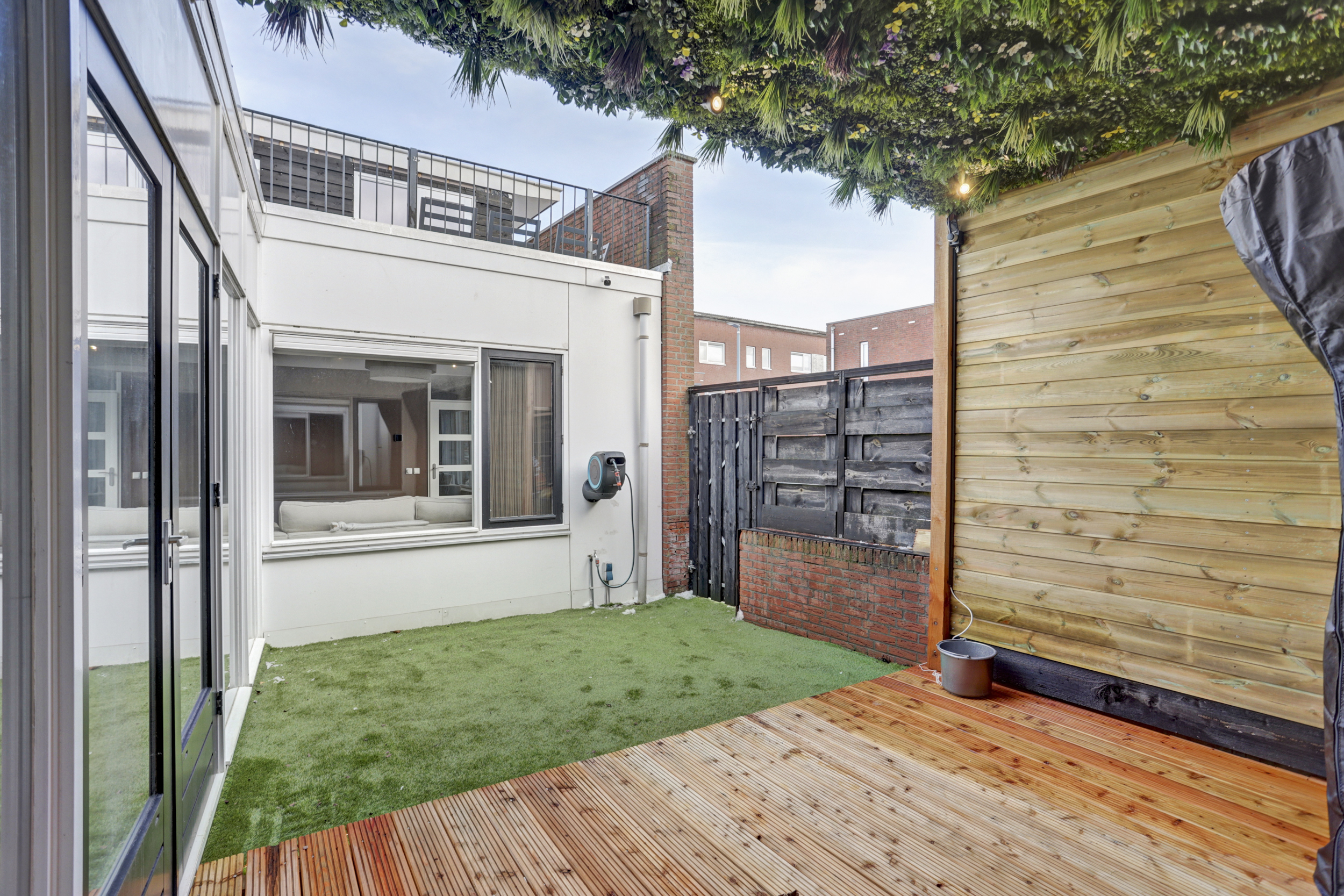 De patio/tuin is van binnenuit middels openslaande deuren te bereiken en van buitenuit middels een poort aan de zijkant. Deze heerlijke tuin gesitueerd op het zuiden, biedt volop privacy, behoeft dan ook weinig onderhoud en is daarnaast voorzien van een gezellige overkapping met verlichting. Kortom; volop genieten!