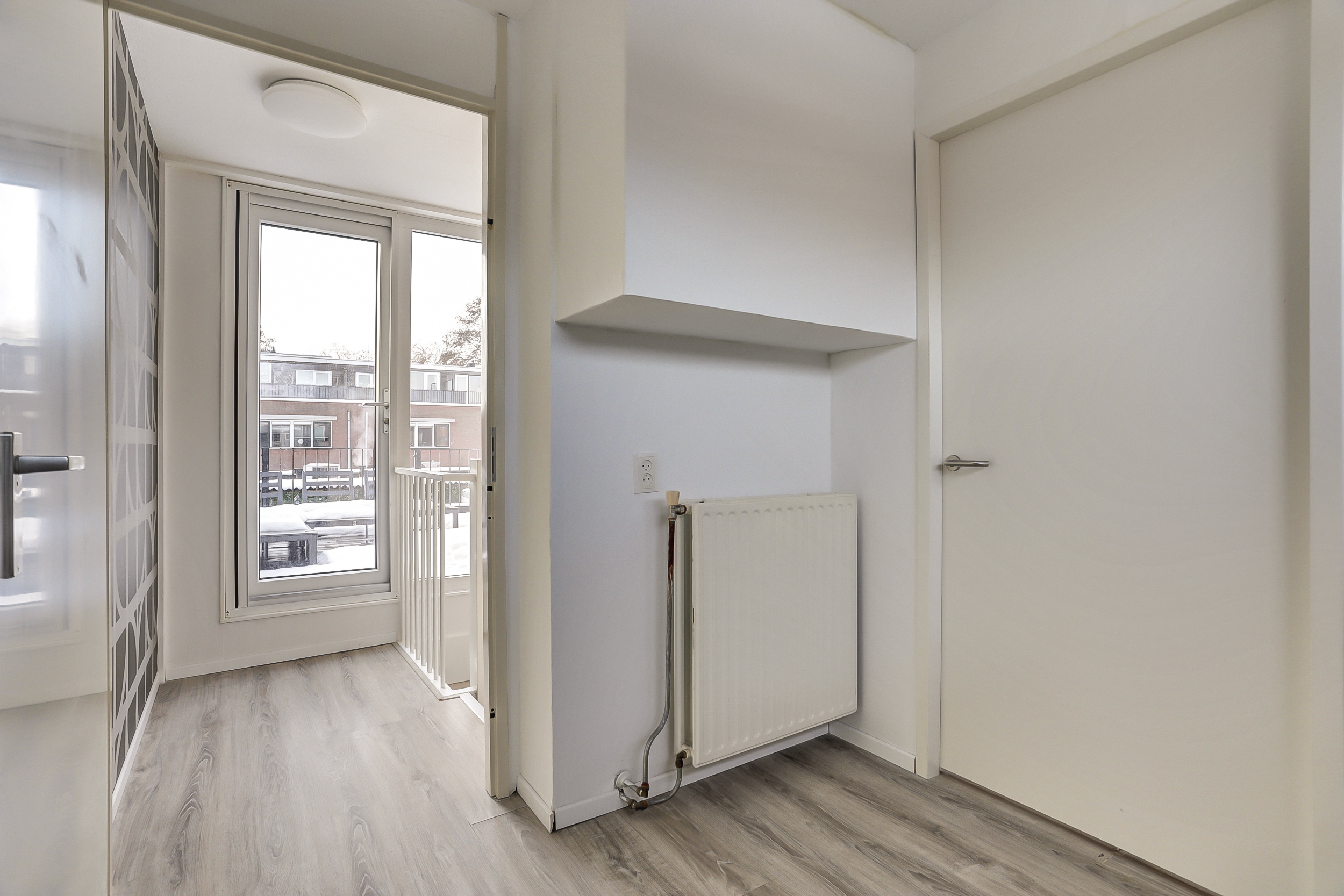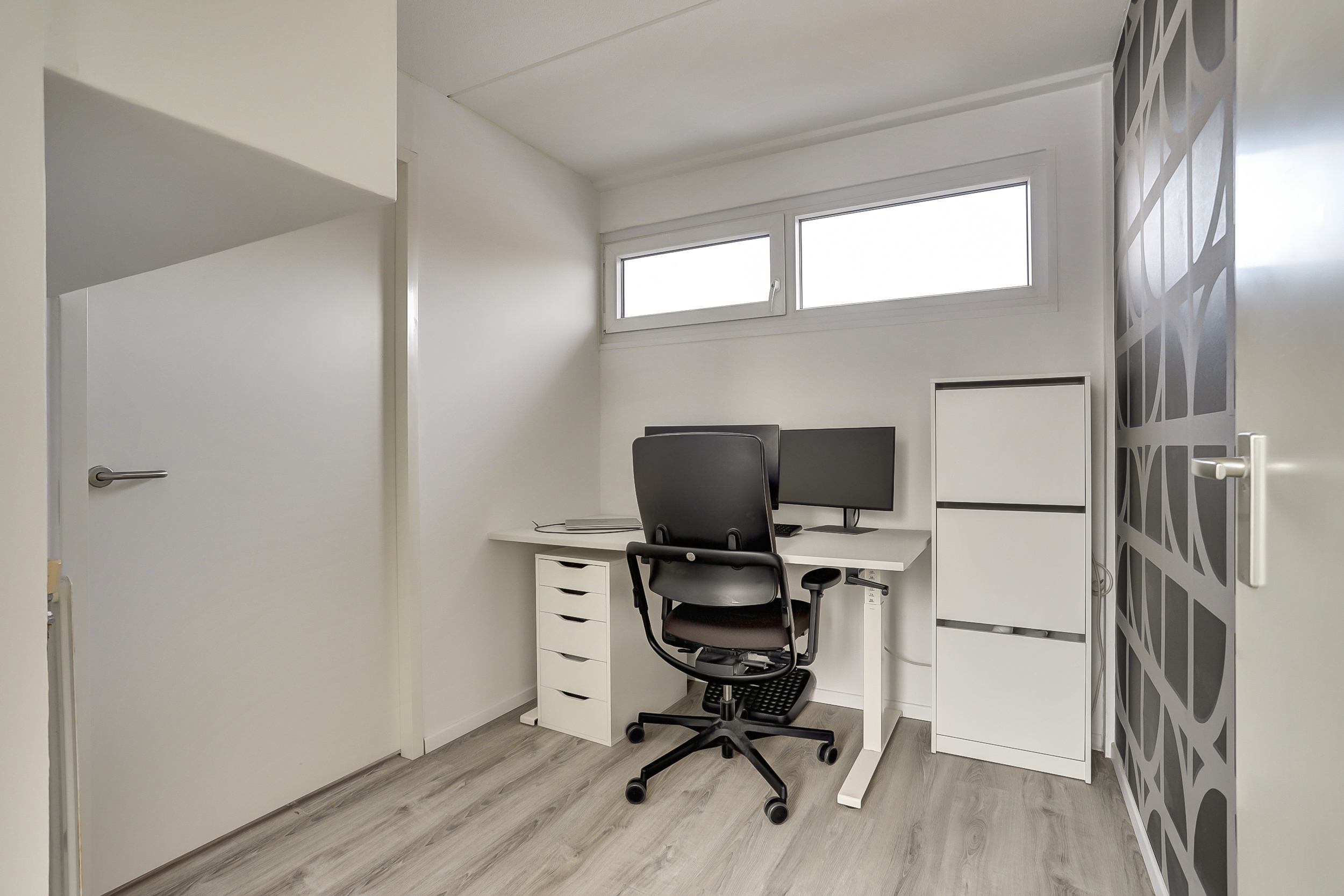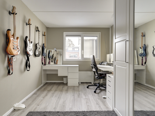 De overloop met laminaatvloer en aparte hobby-/werkruimte (ca. 6 m²), geeft toegang tot het dakterras en een royale 2e slaapkamer.