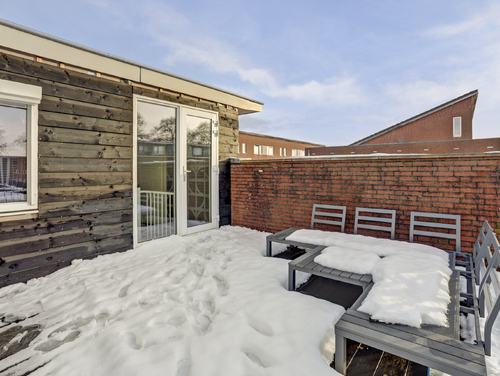 Het zonnige dakterras van ca. 22 m² is afgewerkt met "Bankirai" vlonderplanken, een handige kunststof berging en gesitueerd op het zuiden.