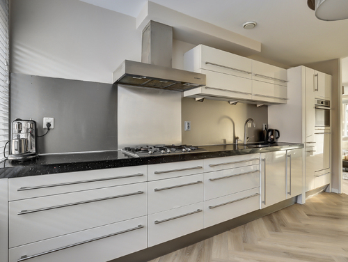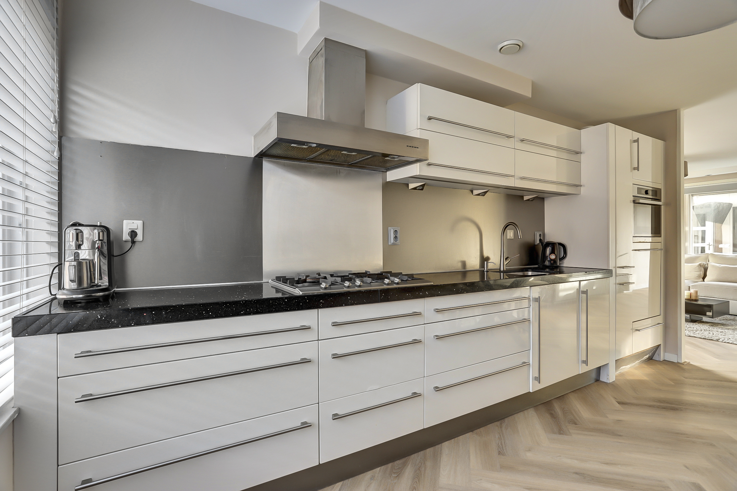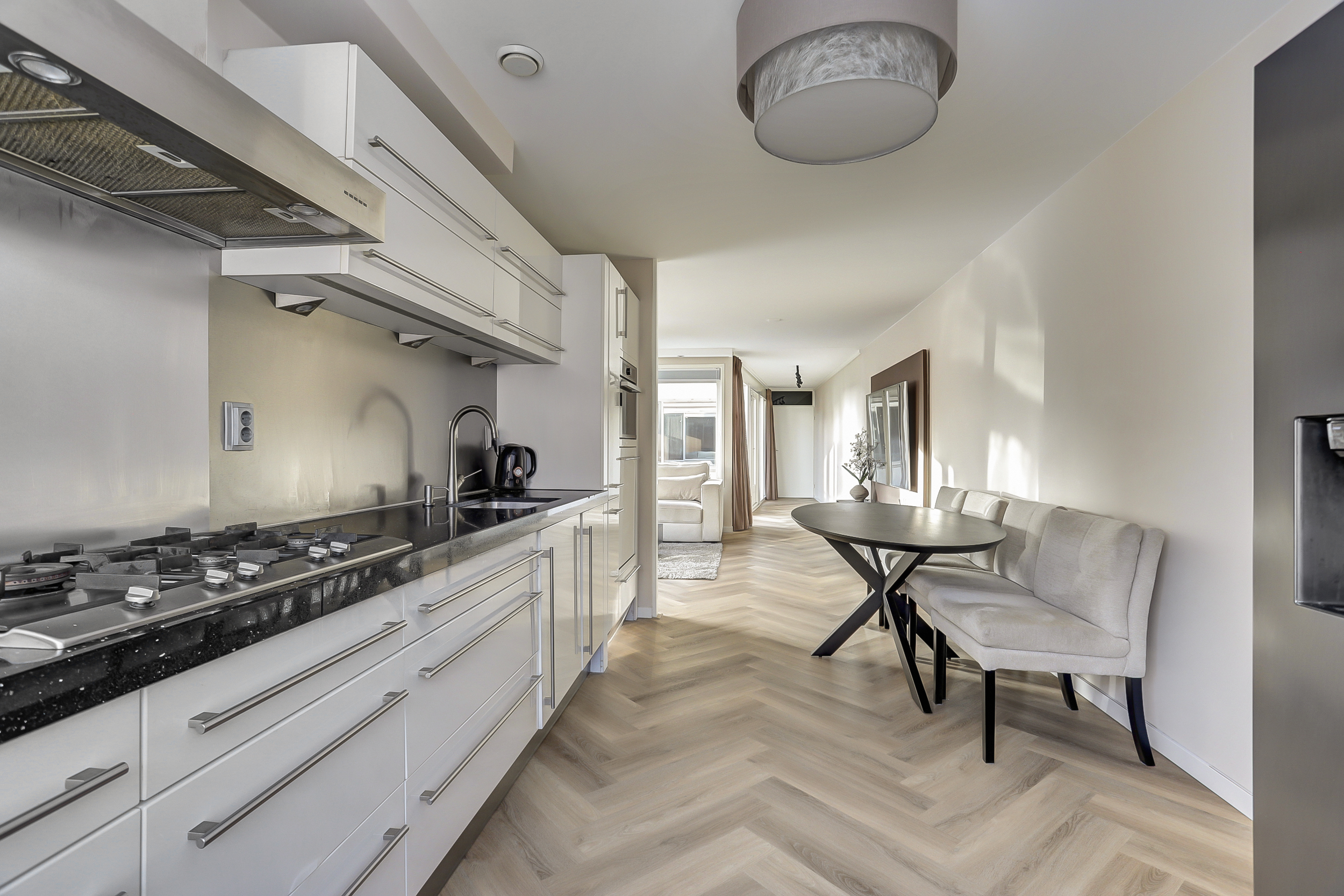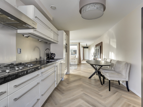 De open keuken (ca. 12 m²) is voorzien van een moderne (hoogglans) inrichting en diverse ingebouwde apparatuur zoals een rvs-afzuigschouw, 5-pits gaskookplaat, combimagnetron (2023), vaatwasmachine, 15 liter close-in boiler en een apothekerskast. Het geheel is smaakvol afgewerkt met een "composiet" aanrechtblad. De pvc-visgraadvloer, wandafwerking en vloerverwarming van de woonkamer lopen vloeiend in elkaar over en zorgen voor een bijpassend geheel.