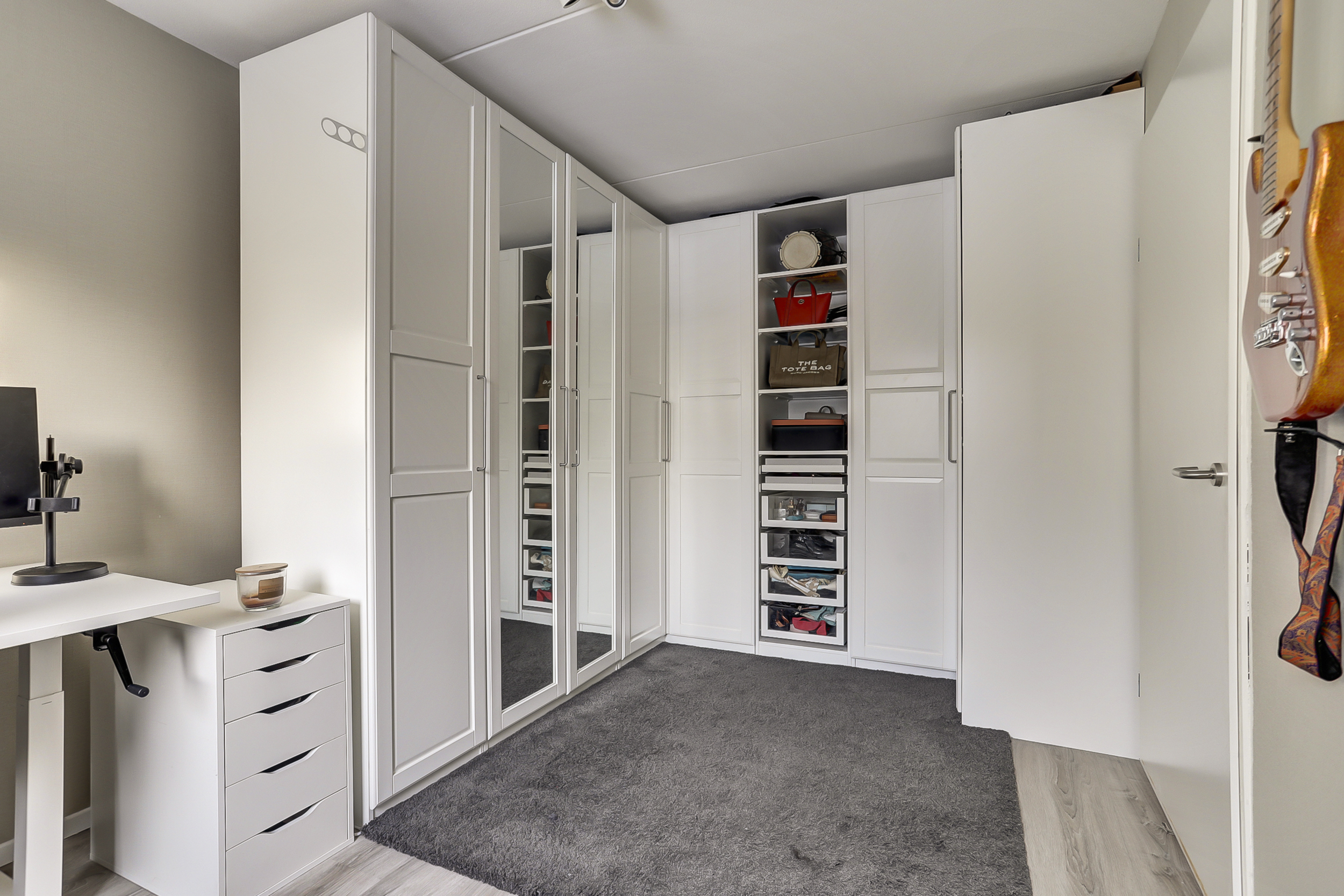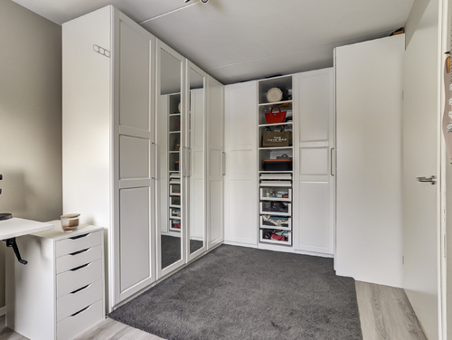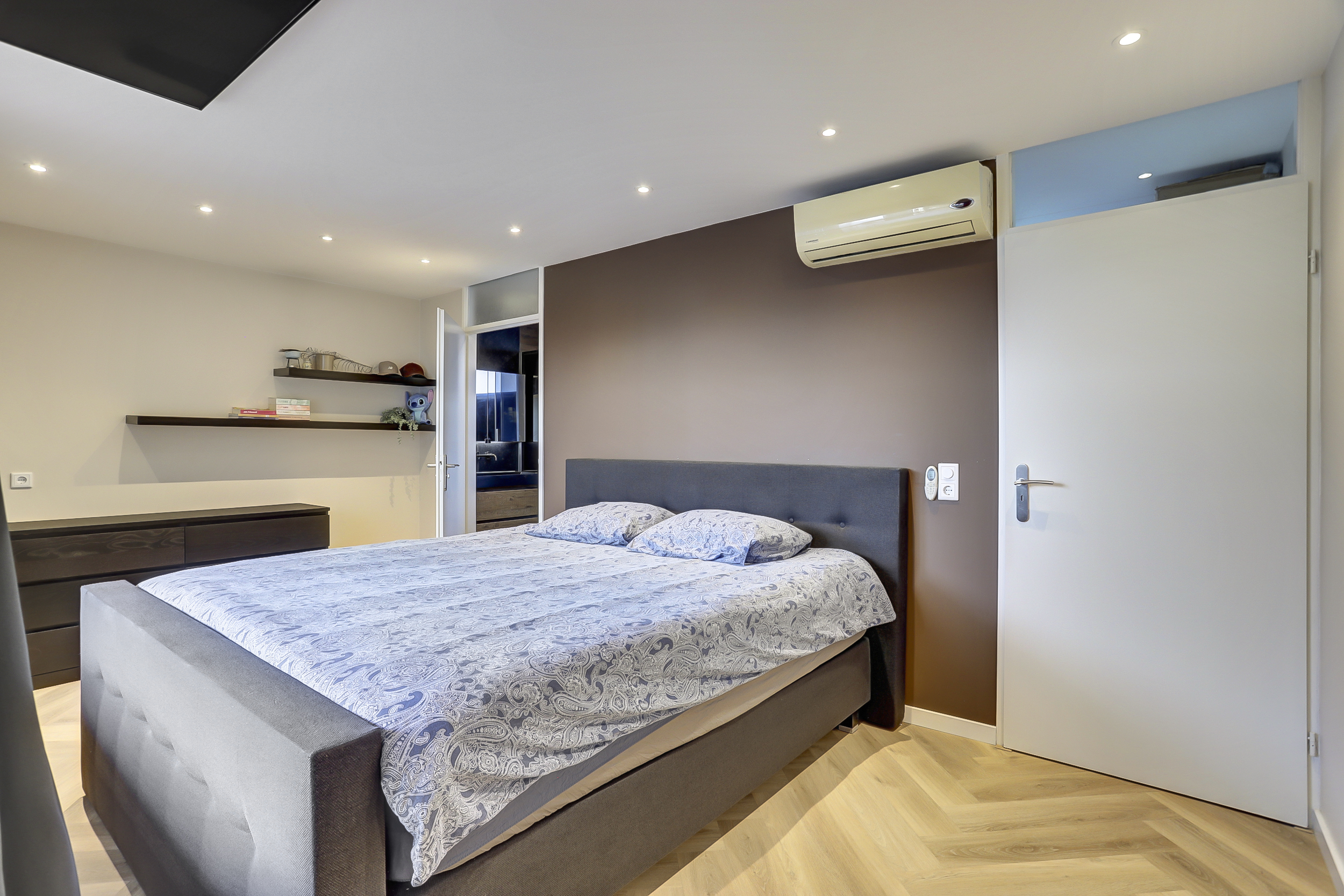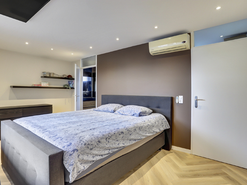 De ouderslaapkamer van ca. 15 m², is eveneens voorzien van een pvc-visgraadvloer/vloerverwarming, maar beschikt ook over airconditioning en heeft uitzicht op de patio/tuin. Vanuit de slaapkamer bereik je de badkamer en de inpandige berging.