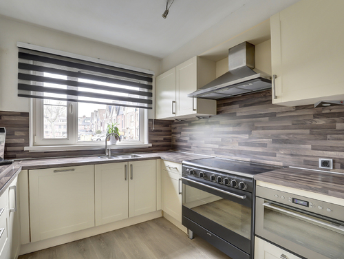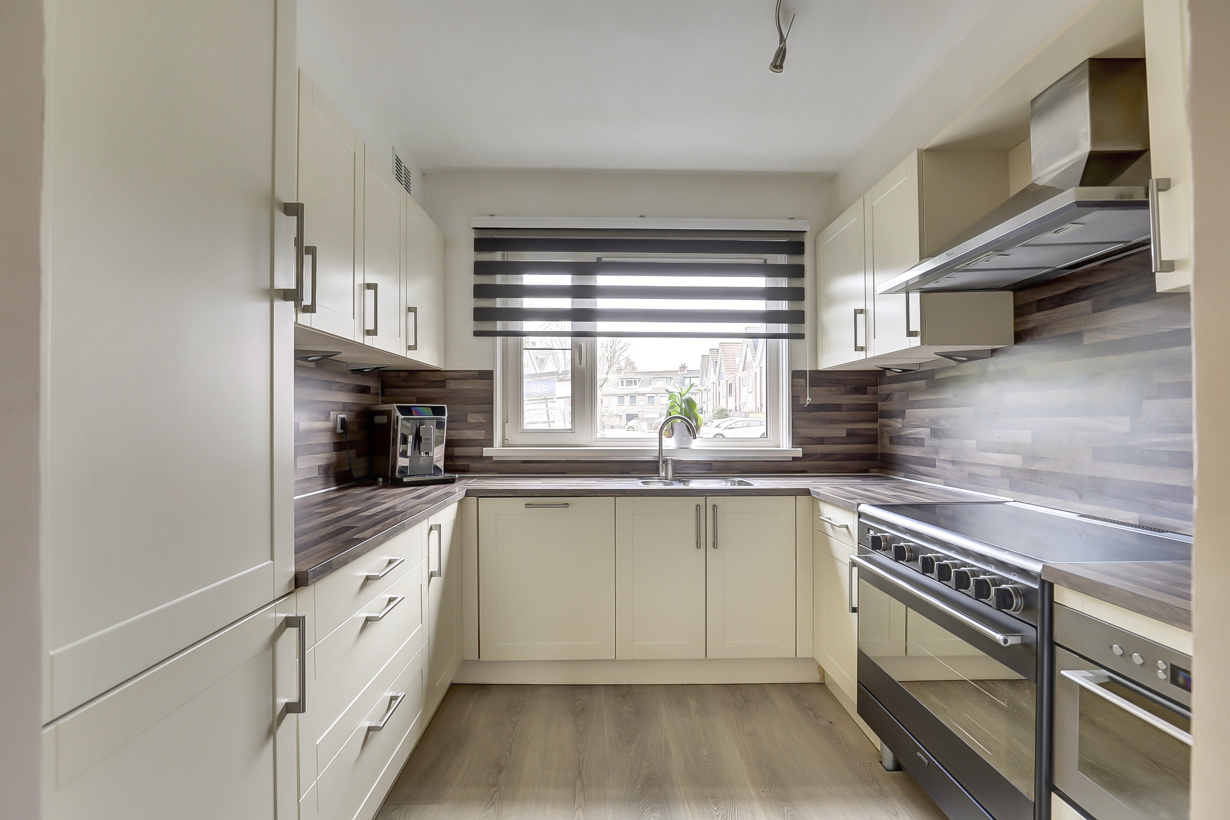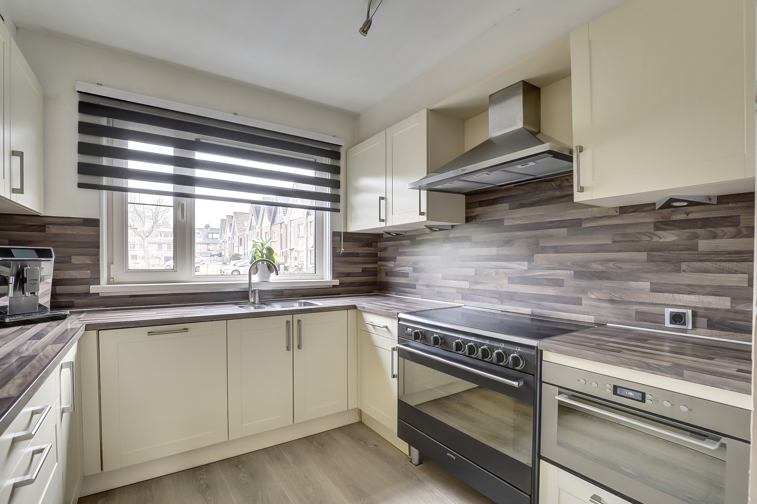 De verzorgde open keuken (ca. 7 m²) is uitgerust met een U-vormige inrichting en diverse ingebouwde apparatuur zoals een koelkast, "Smeg" inductiefornuis met brede oven, rvs afzuigschouw, close in boiler en een combi magnetron. De pvc vloer en de wandafwerking van de woonkamer lopen naadloos over in de keuken en zorgen voor een fraai bijpassend geheel. Vanuit het keukenraam heb je een goed zicht op het aan de voorzijde gelegen pleintje.