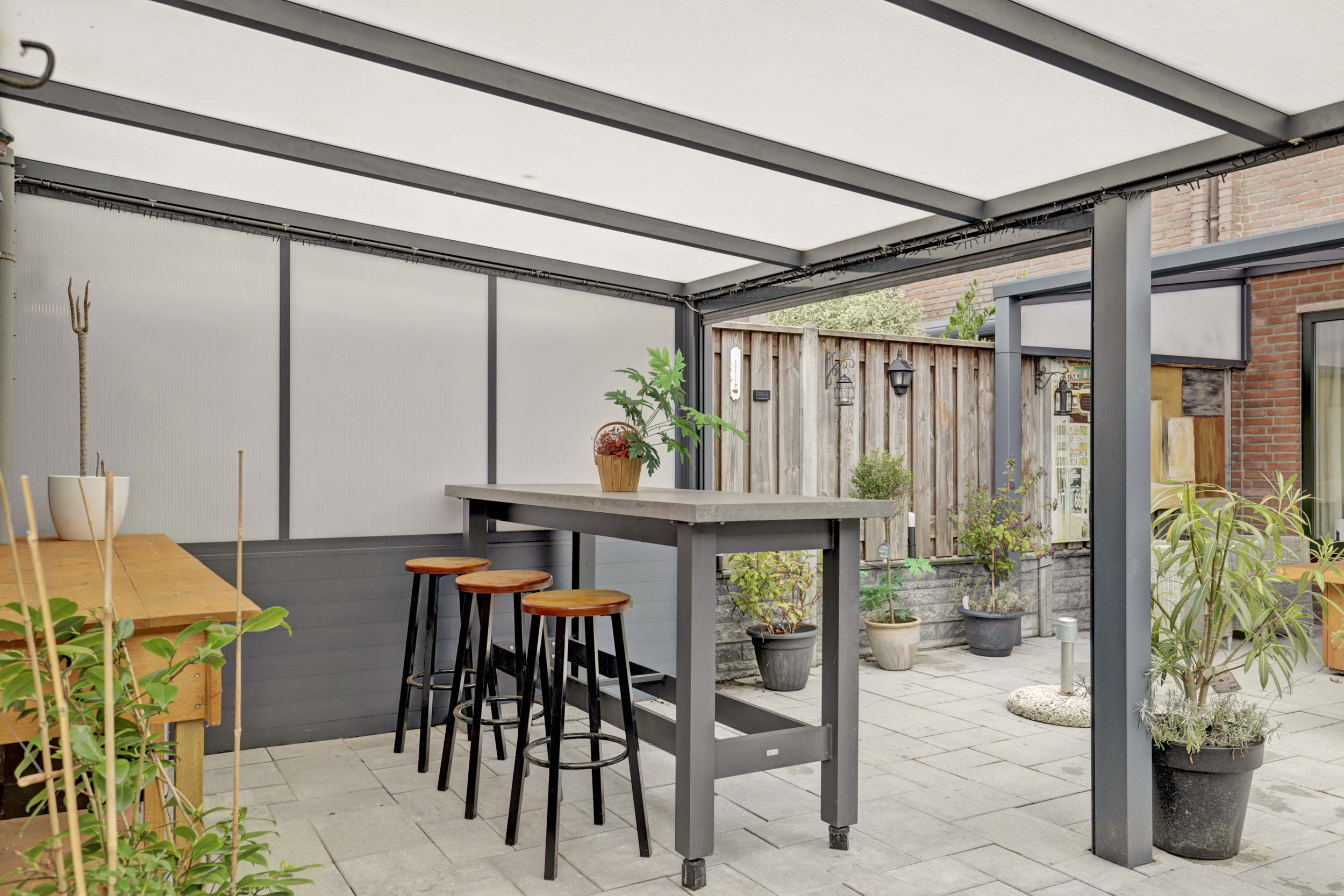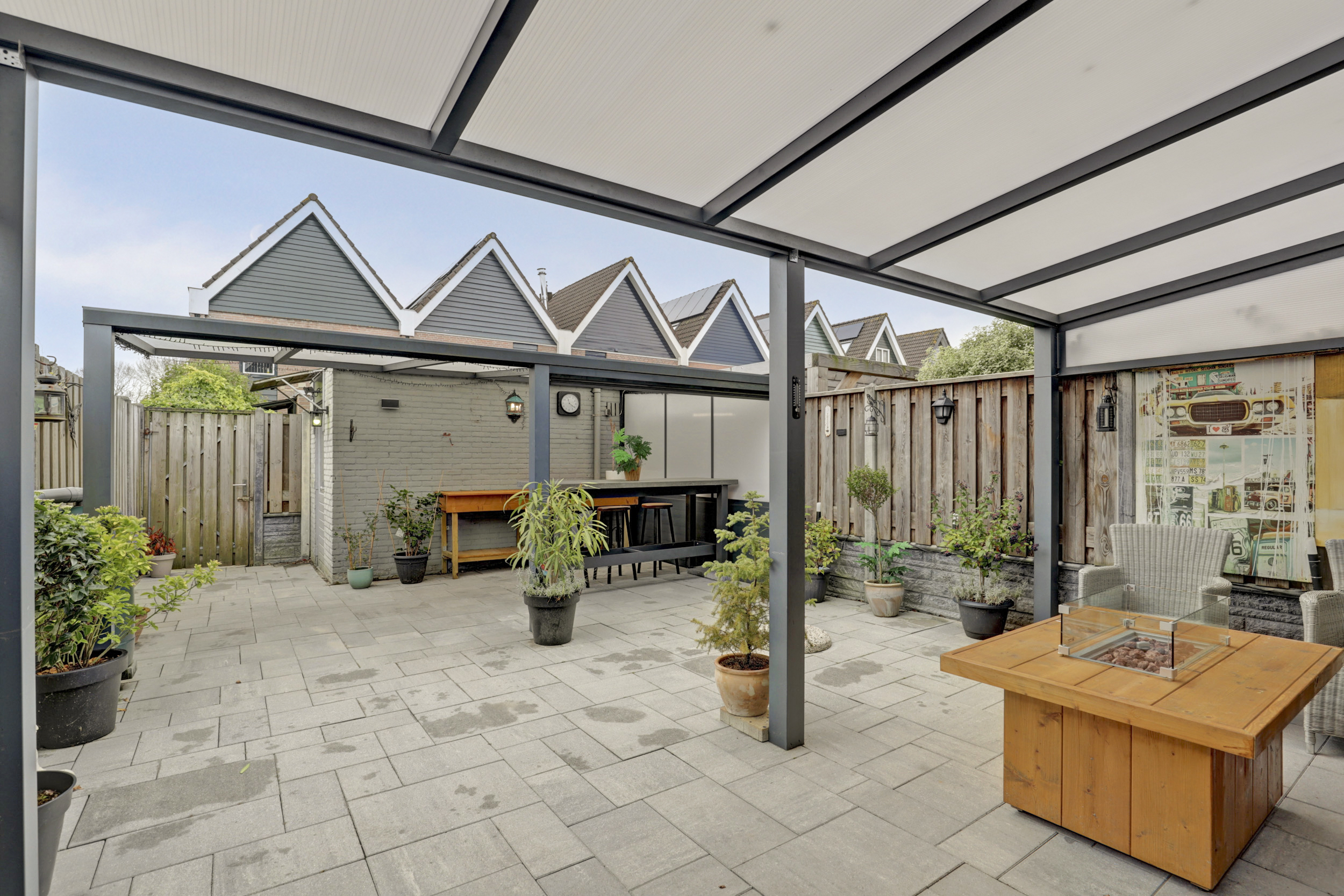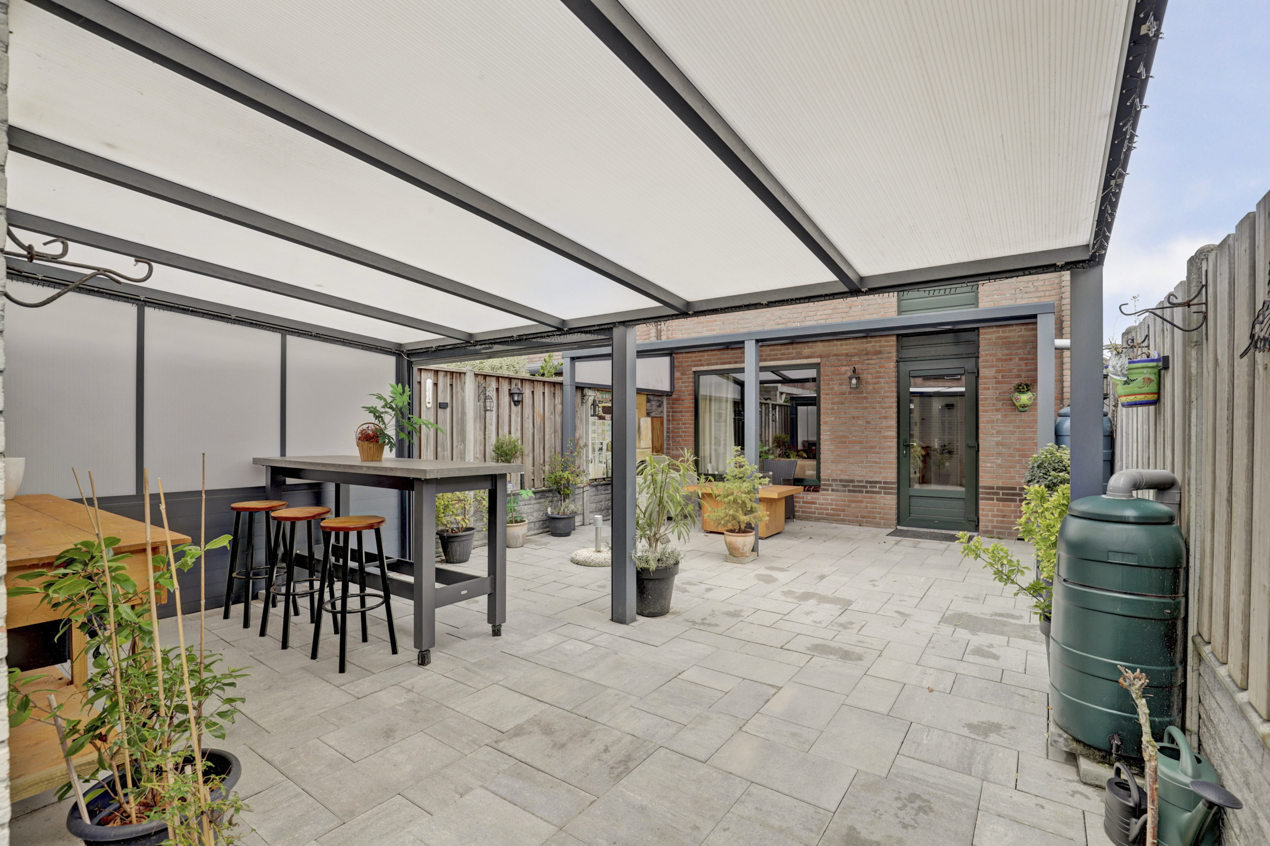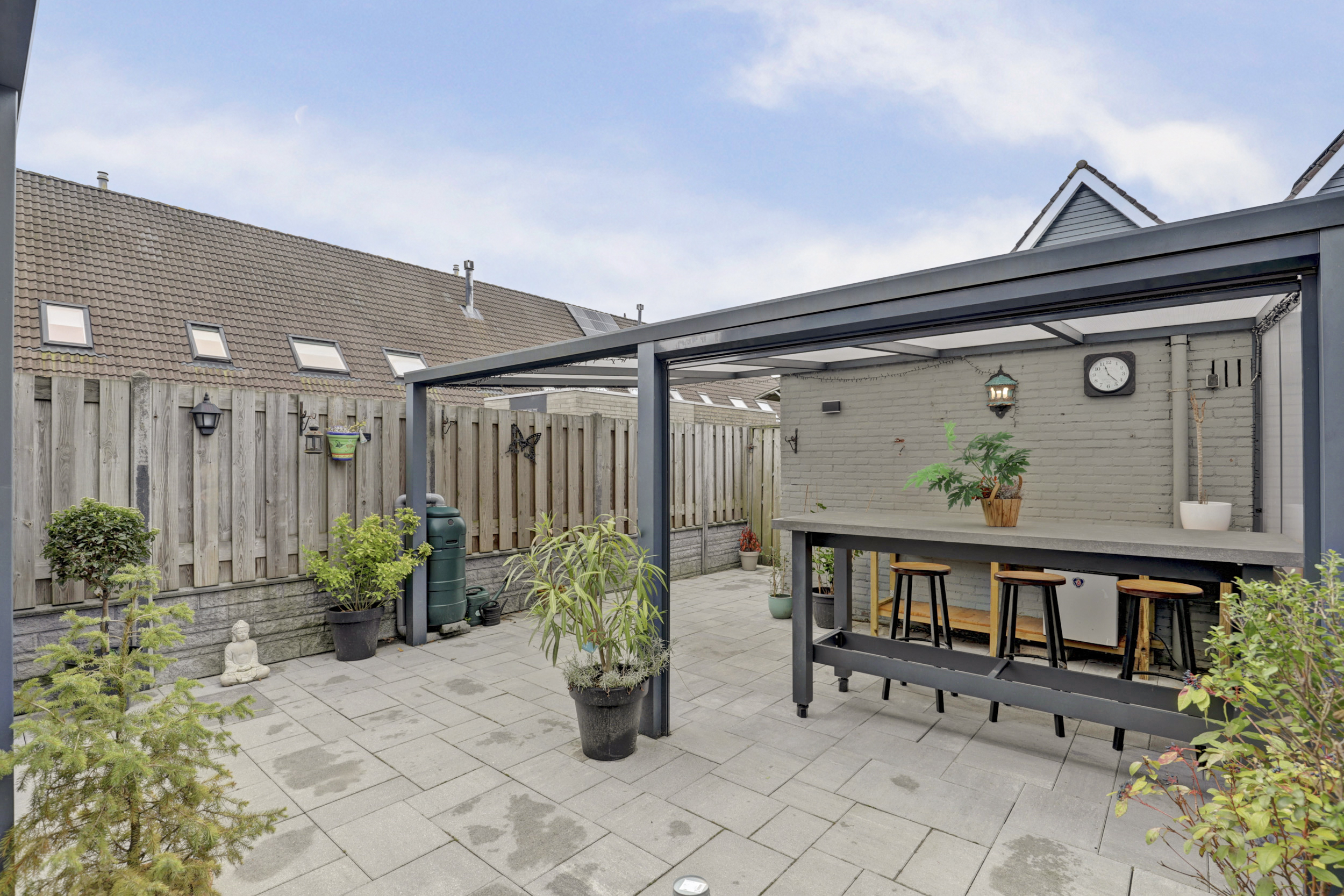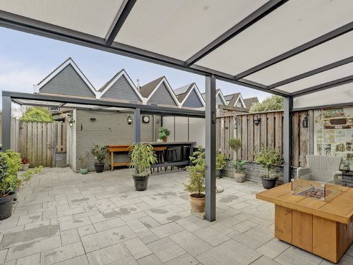 De besloten achtertuin is gesitueerd op het zuiden en beschikt over een achterom, een buitenkraan, sierbestrating, verlichting een vrijstaande stenen berging en een dubbele overkapping (resp. 13 m² & 15 m²) van aluminium met screen. Waar je tot in de late uurtjes zowel van de zon als van de schaduw kan genieten. In de voortuin beschikt je over de mogelijkheid om indien gewenst 2 auto's te parkeren.