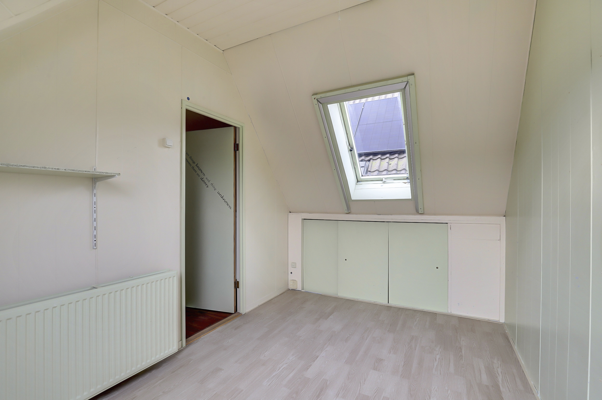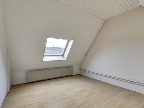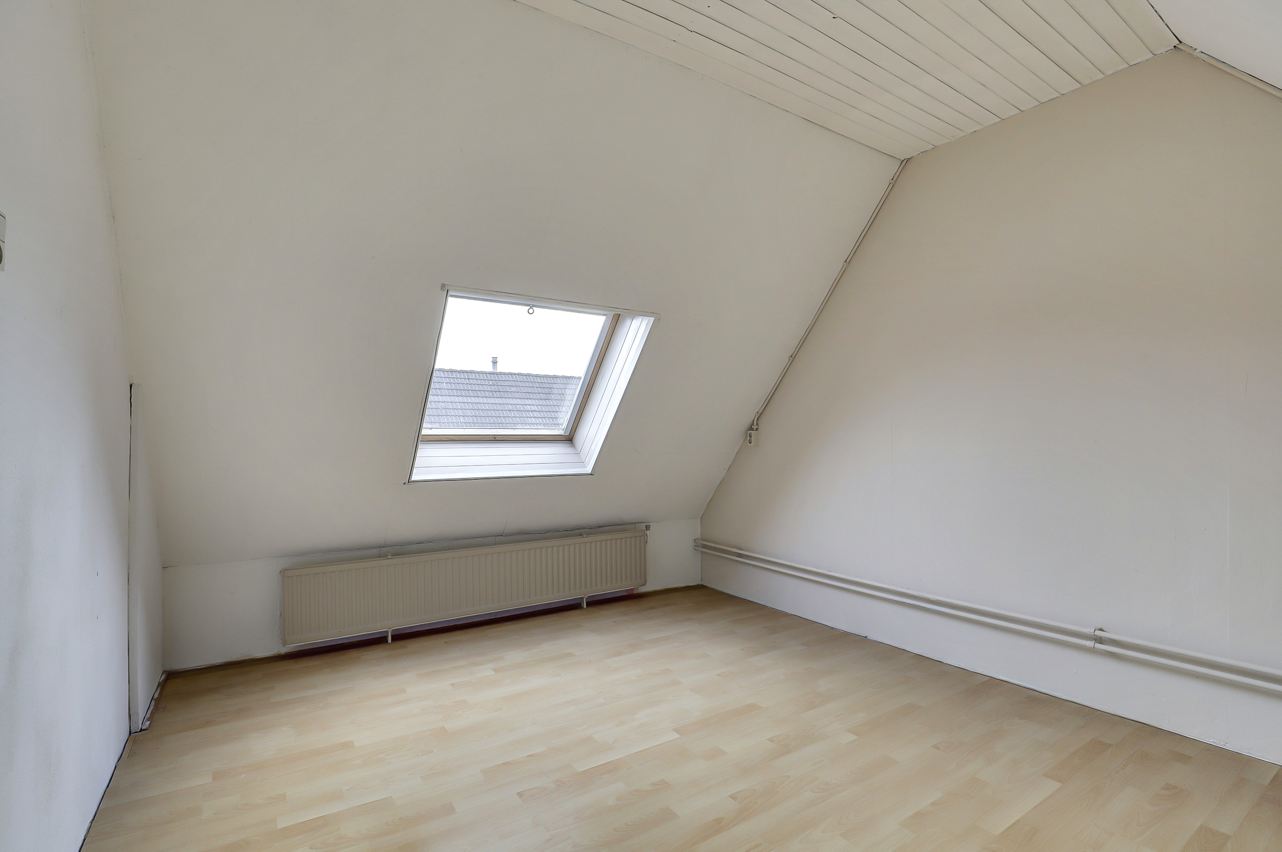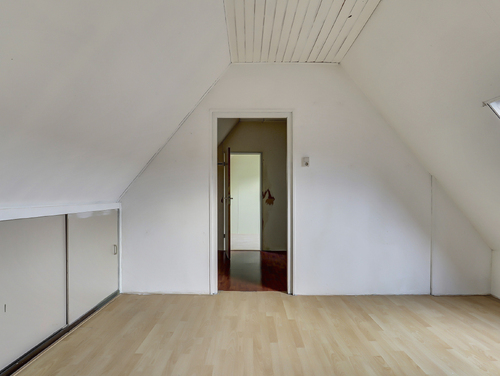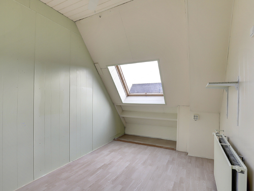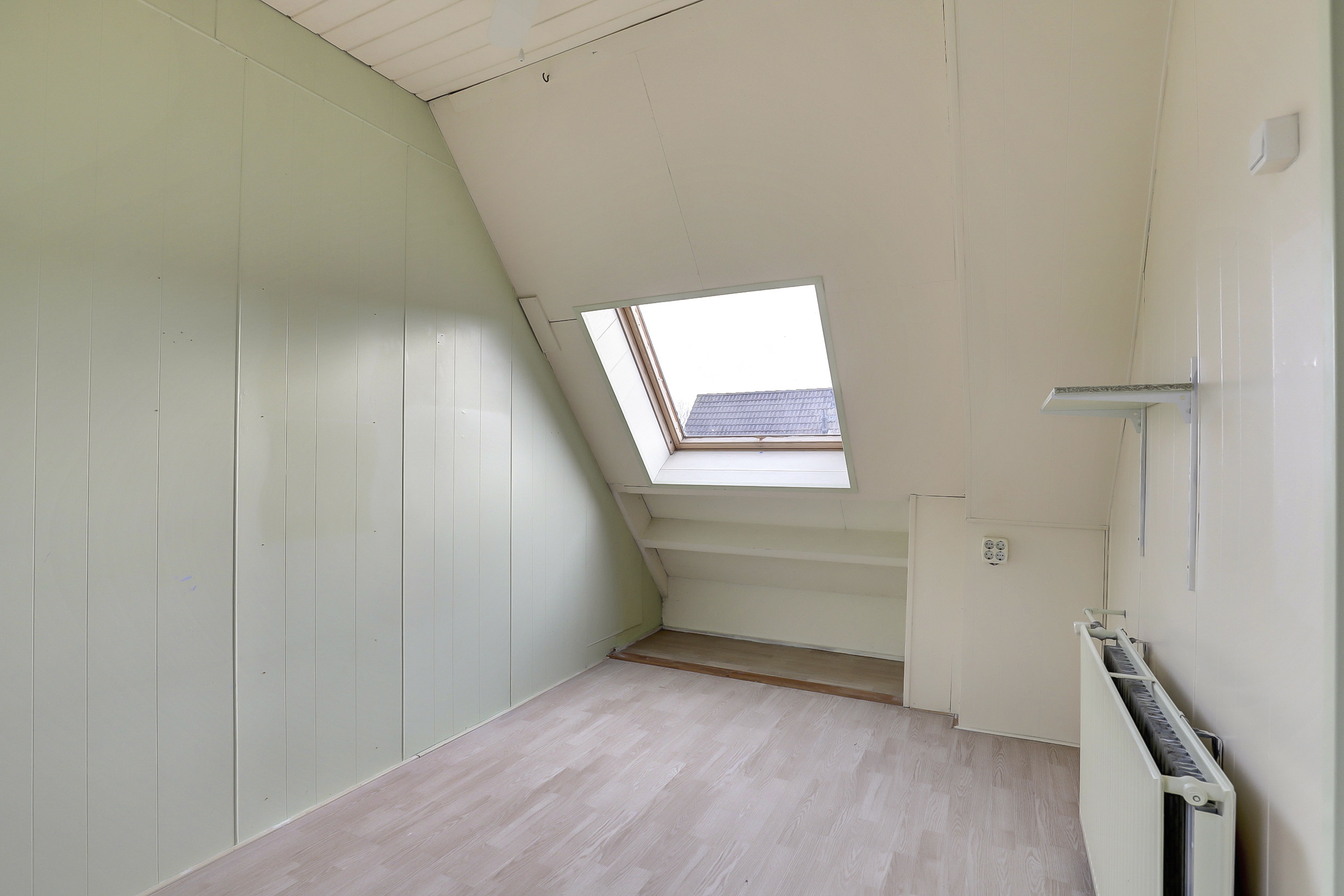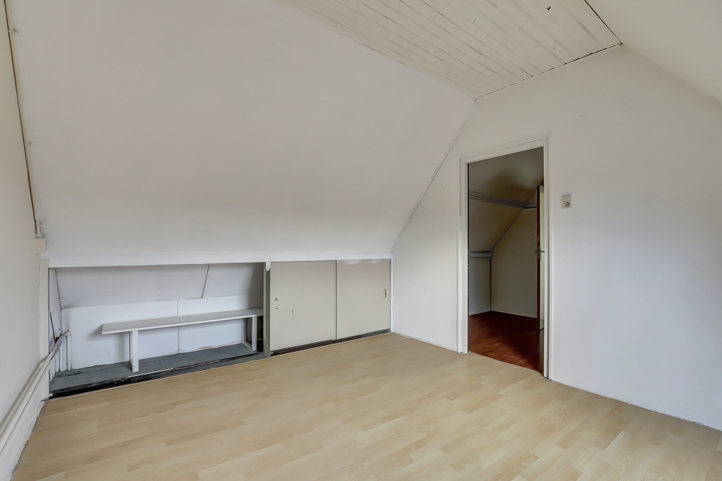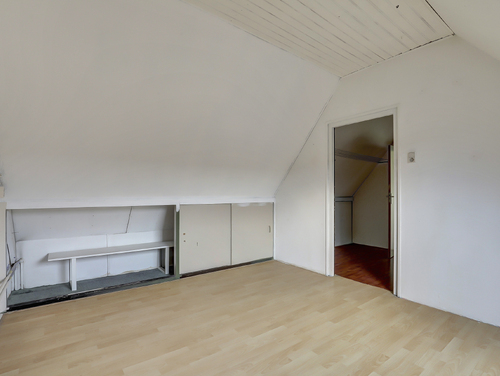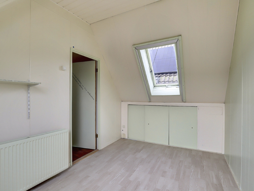 Deze kamer (ca. 11 m²) is gesitueerd aan de voorzijde van de woning en uitgerust met twee dakramen en diverse opbergmogelijkheden achter de knieschotten.
