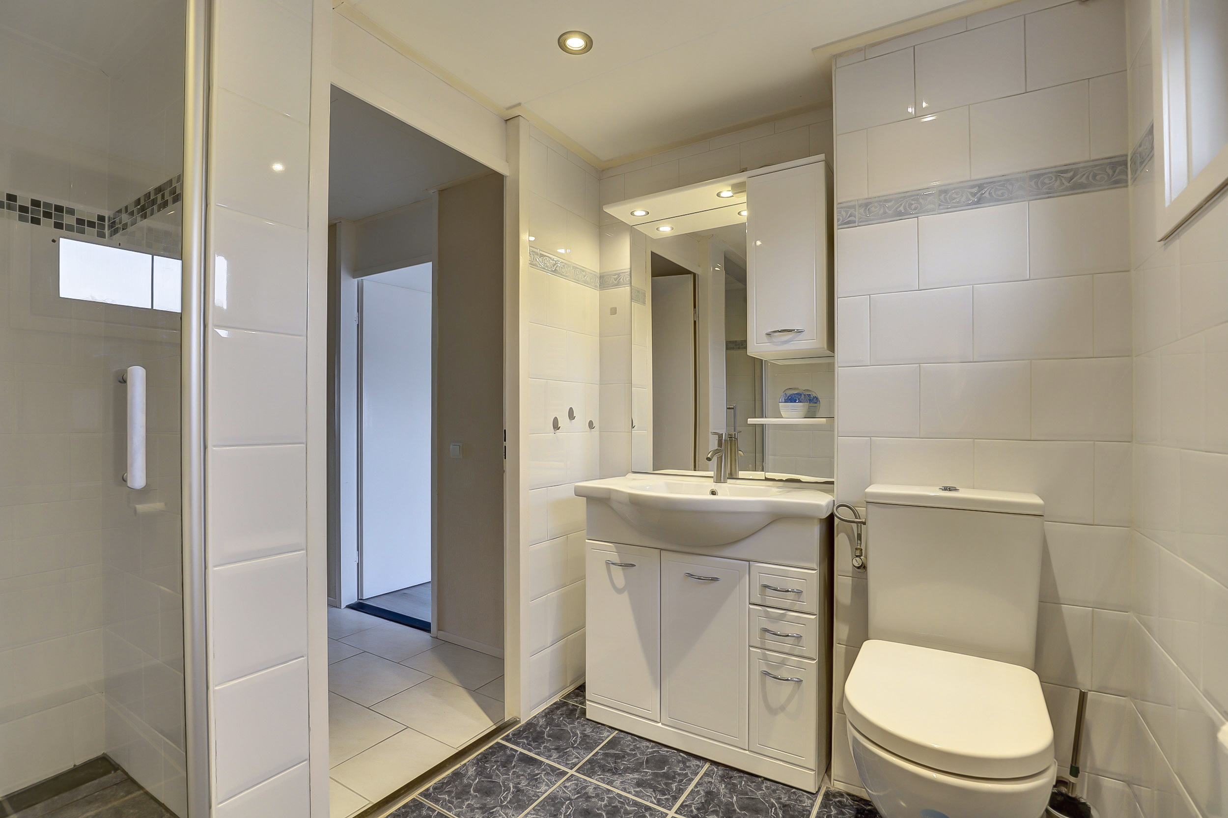 De vergrote en geheel betegelde badkamer van ca. 7 m², is uitgerust met een douchecabine met massagedouche, 2e toilet, design radiator, ingebouwde verlichting, wastafel met meubel, mechanische ventilatie en een uitzetraam.