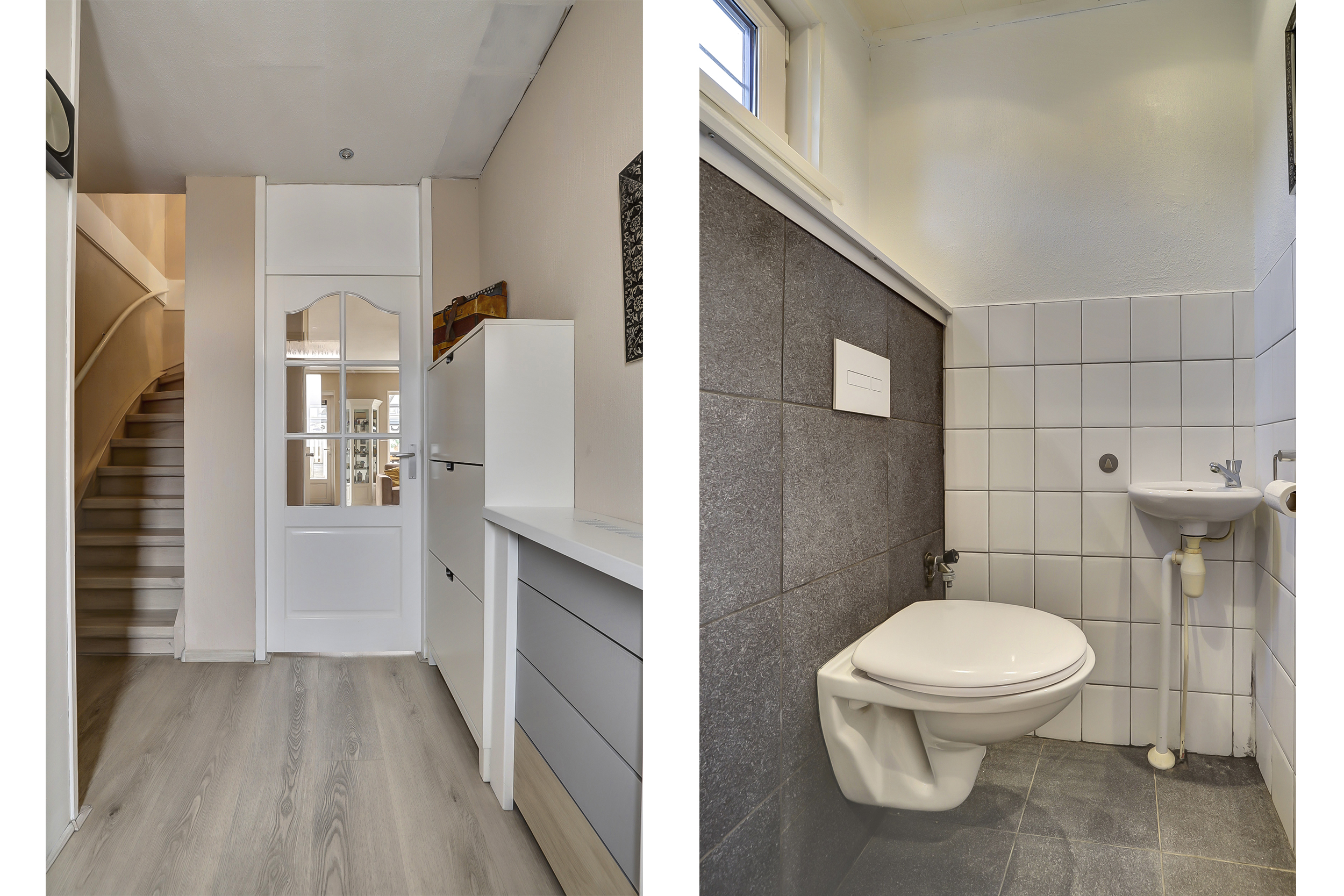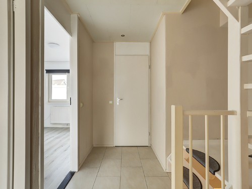 Hal/entree met meterkast (8 groepen/slimme meters/glasvezel), trapopgang, ingebouwde verlichting, modern toilet met zwevend closet en fonteintje, garderoberuimte en de toegang tot de tuingerichte woonkamer.
