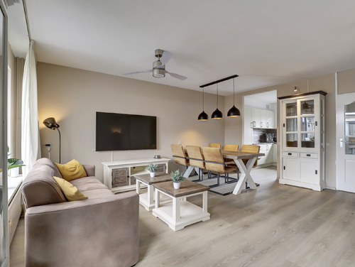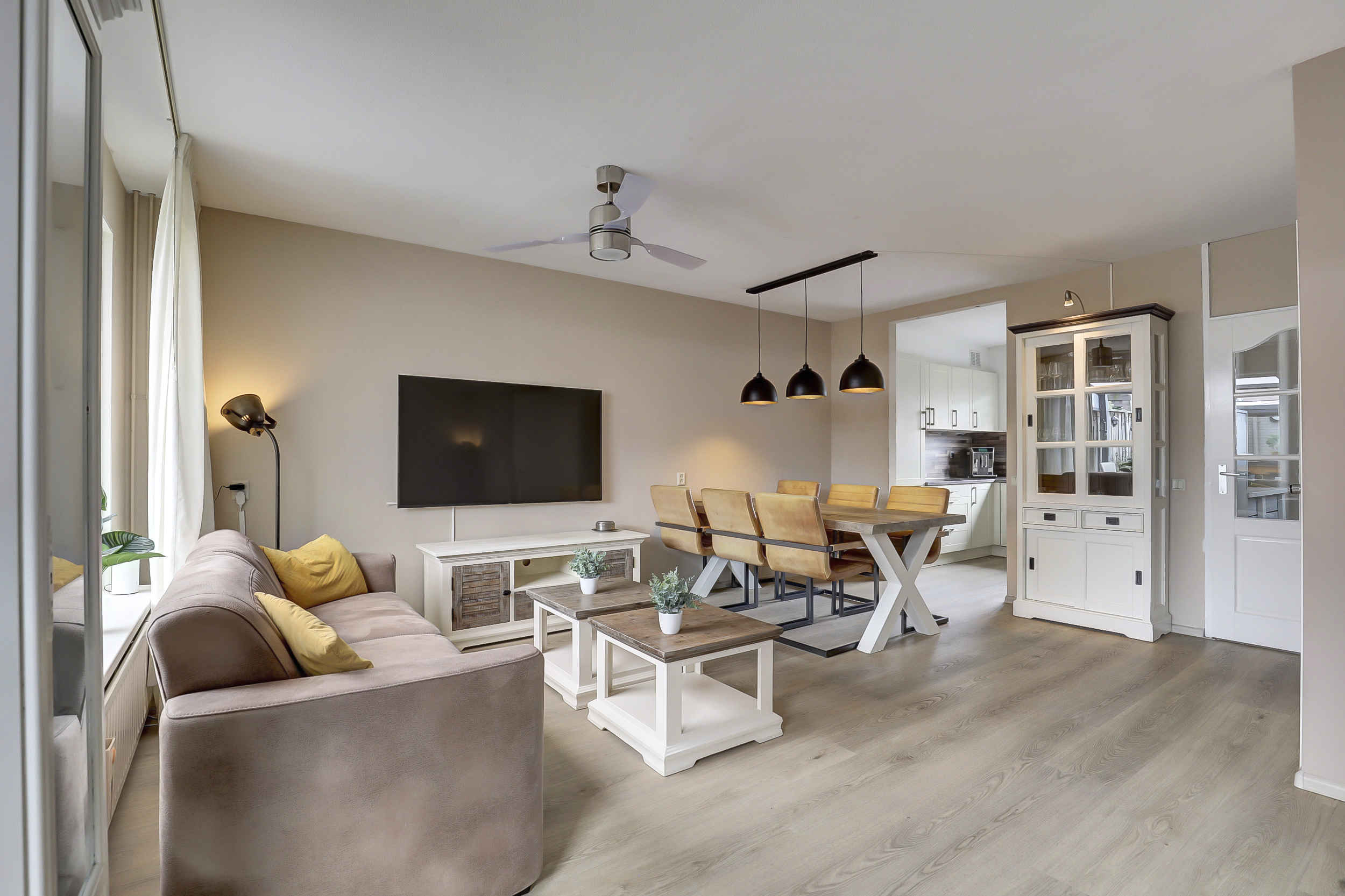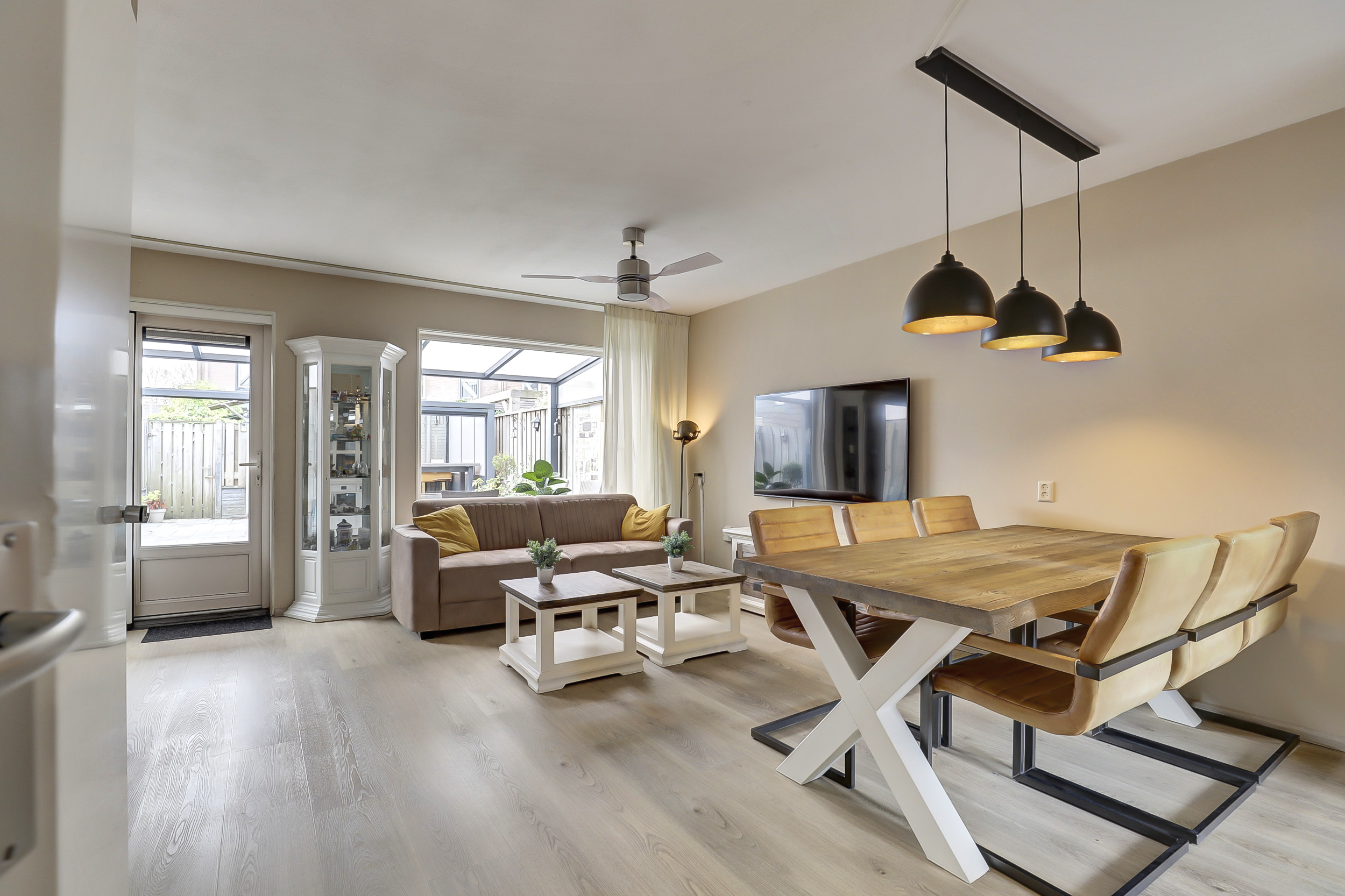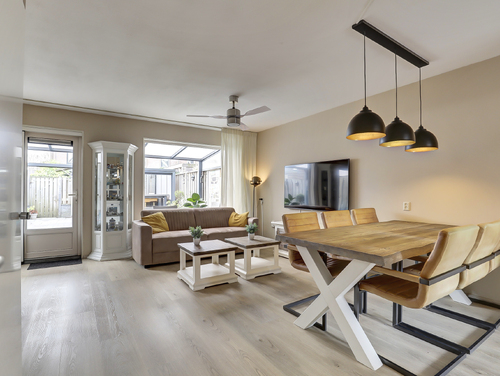 De sfeervolle en tuingerichte woonkamer van ca. 27 m², is voorzien van een pvc vloer, een handige voorraadkast, achterdeur en wanden die licht gesausd zijn.