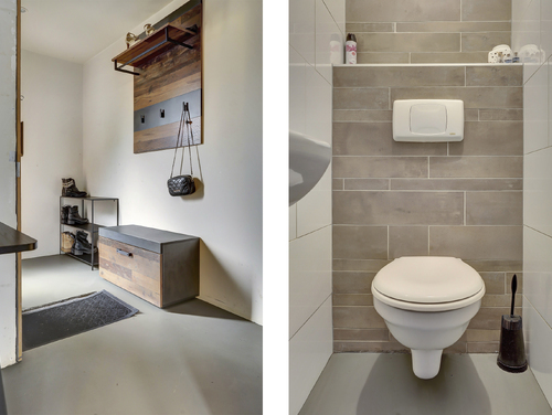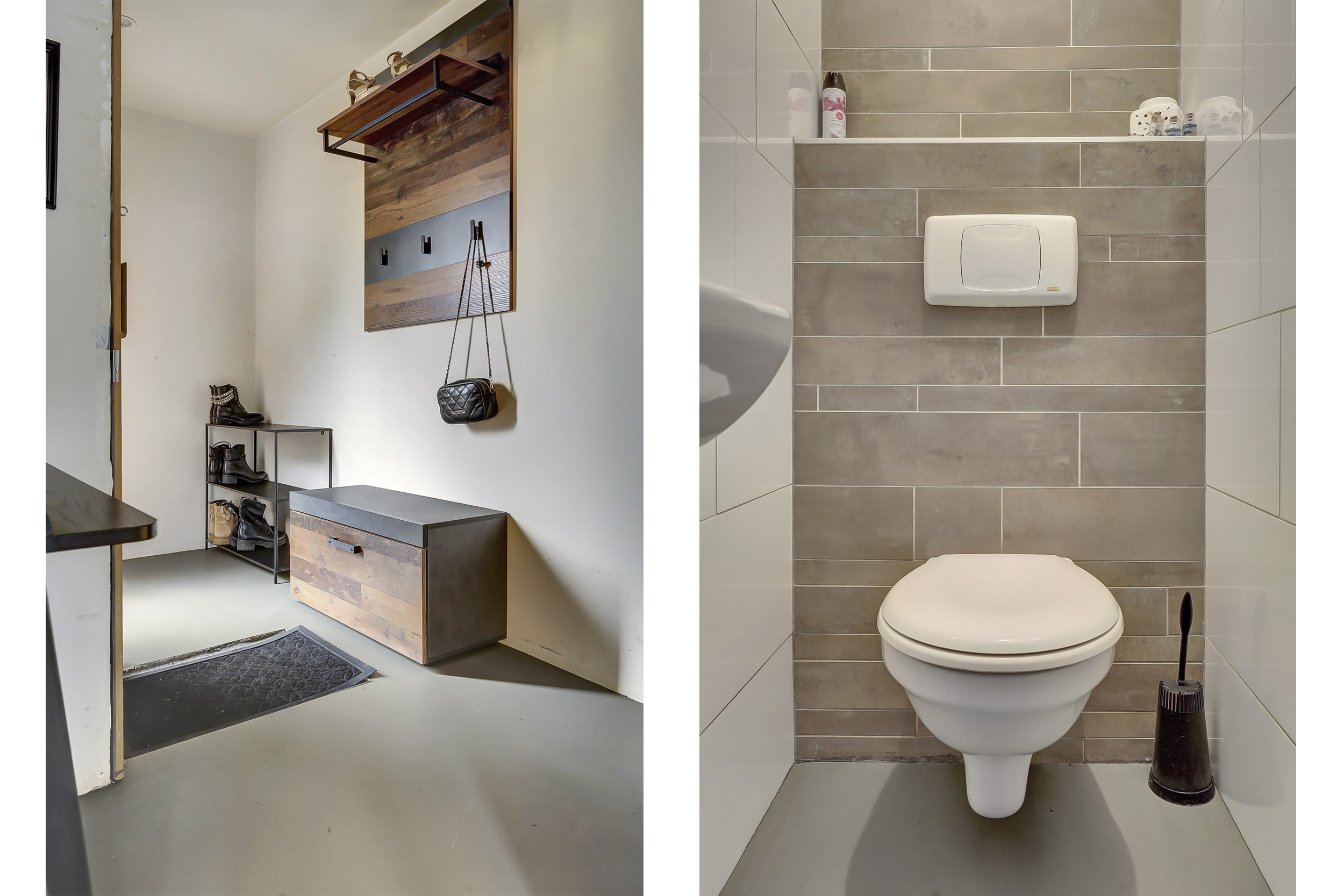 Hal/entree met gietvloer en vloerverwarming, garderoberuimte, meterkast (8 groepen), toilet met zwevend closet en fonteintje en de toegang tot de tuigerichte woonkamer.