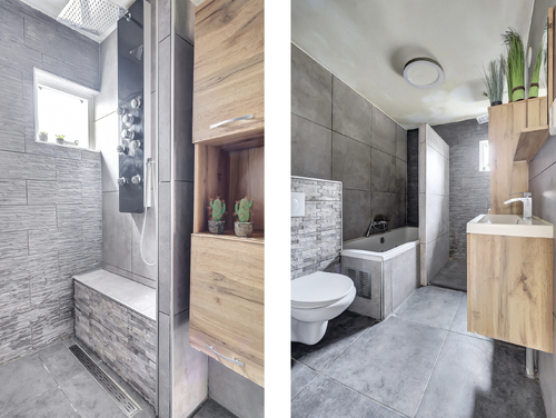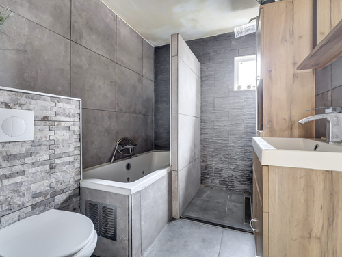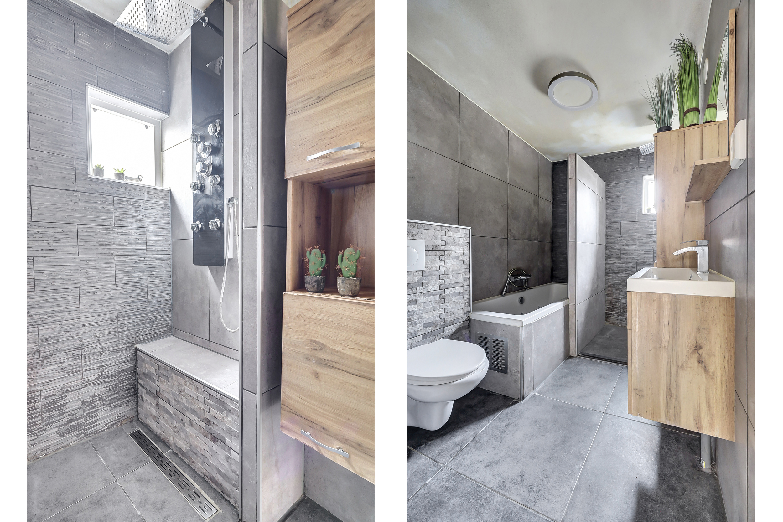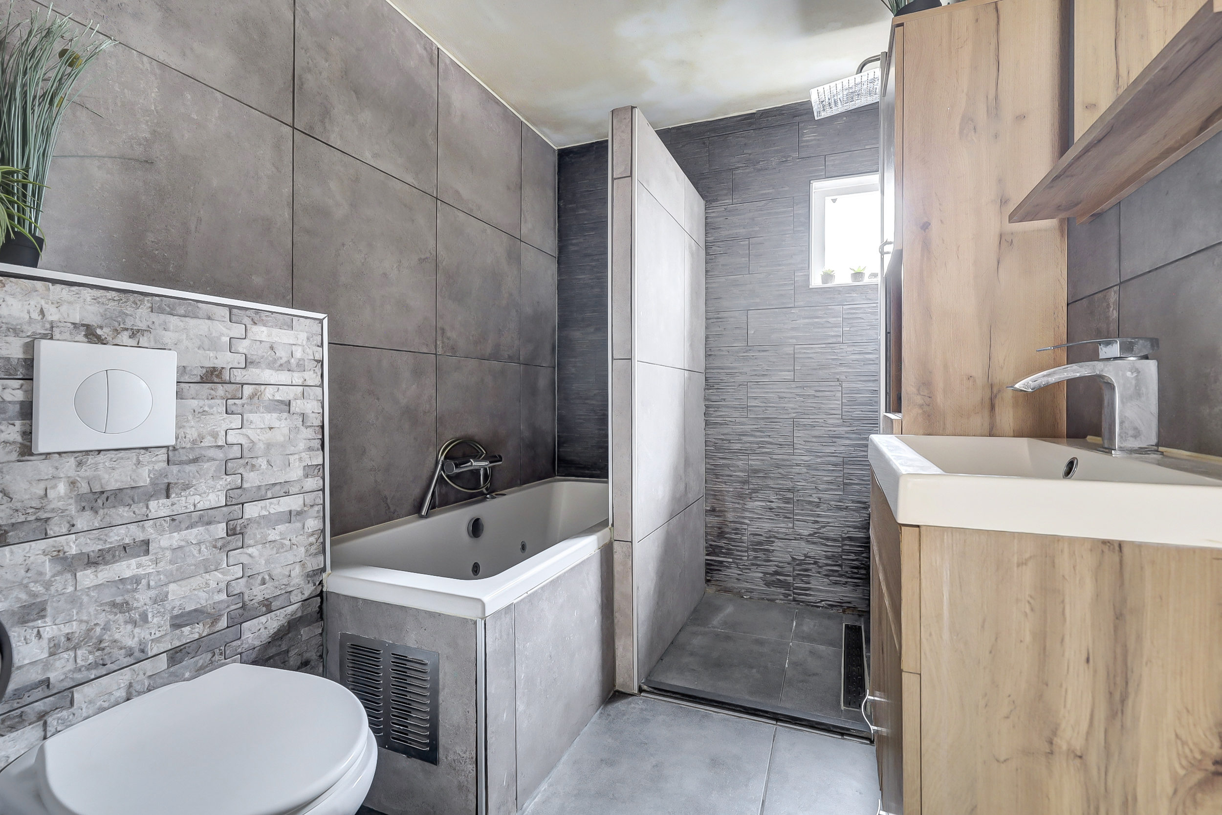 De geheel betegelde badkamer (2020, ca. 5 m²) is voorzien een whirlpool, inloopdouche met regendouche, wastafel met meubel en een 2e toilet met zwevend closet.